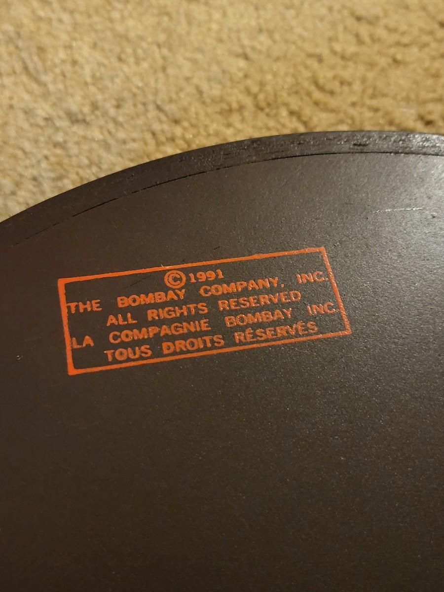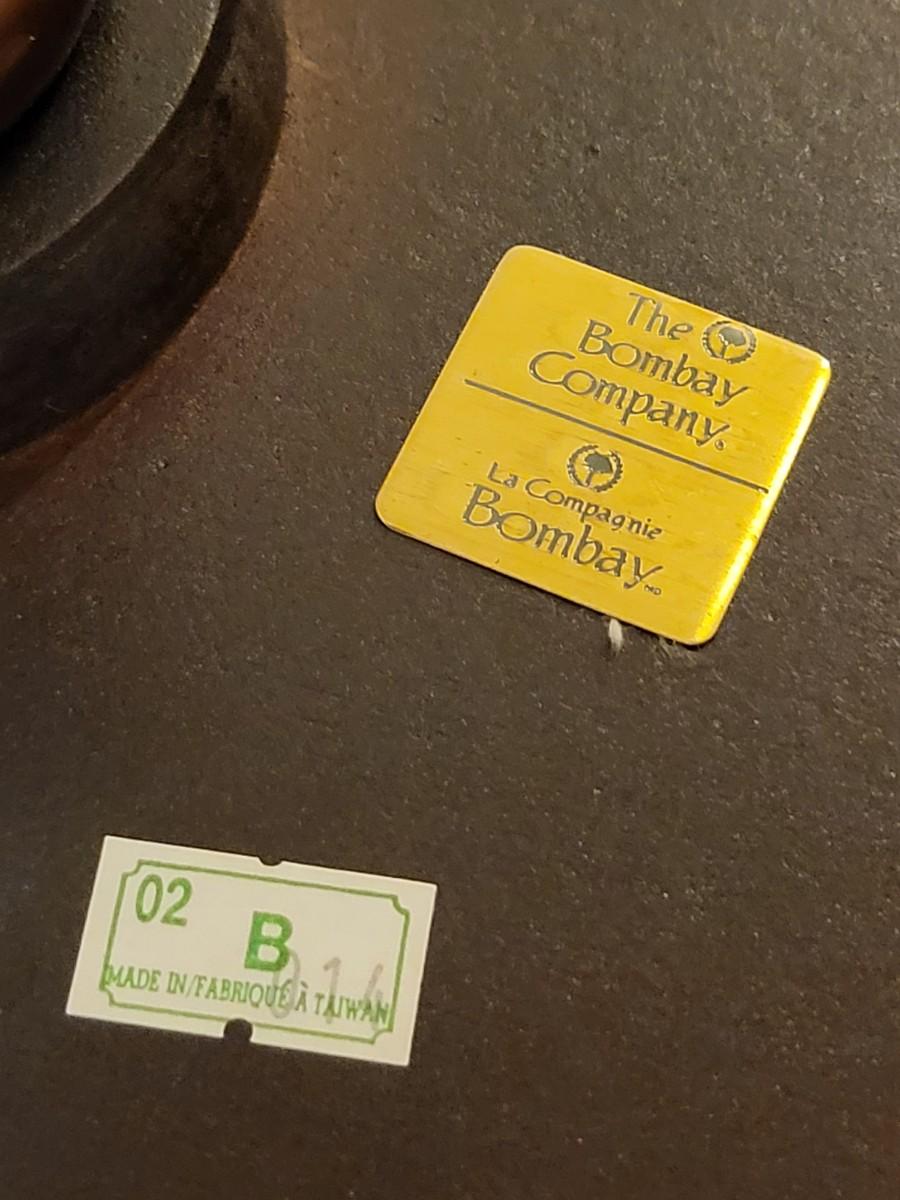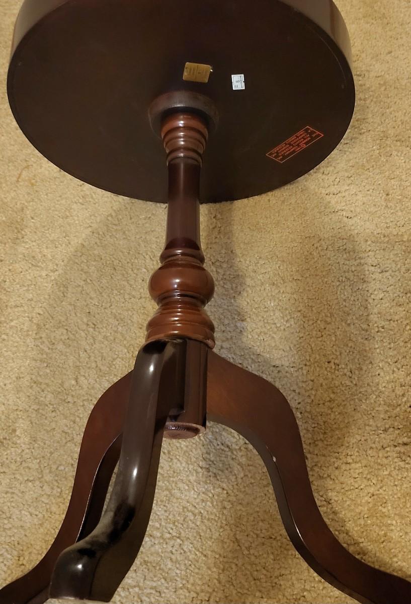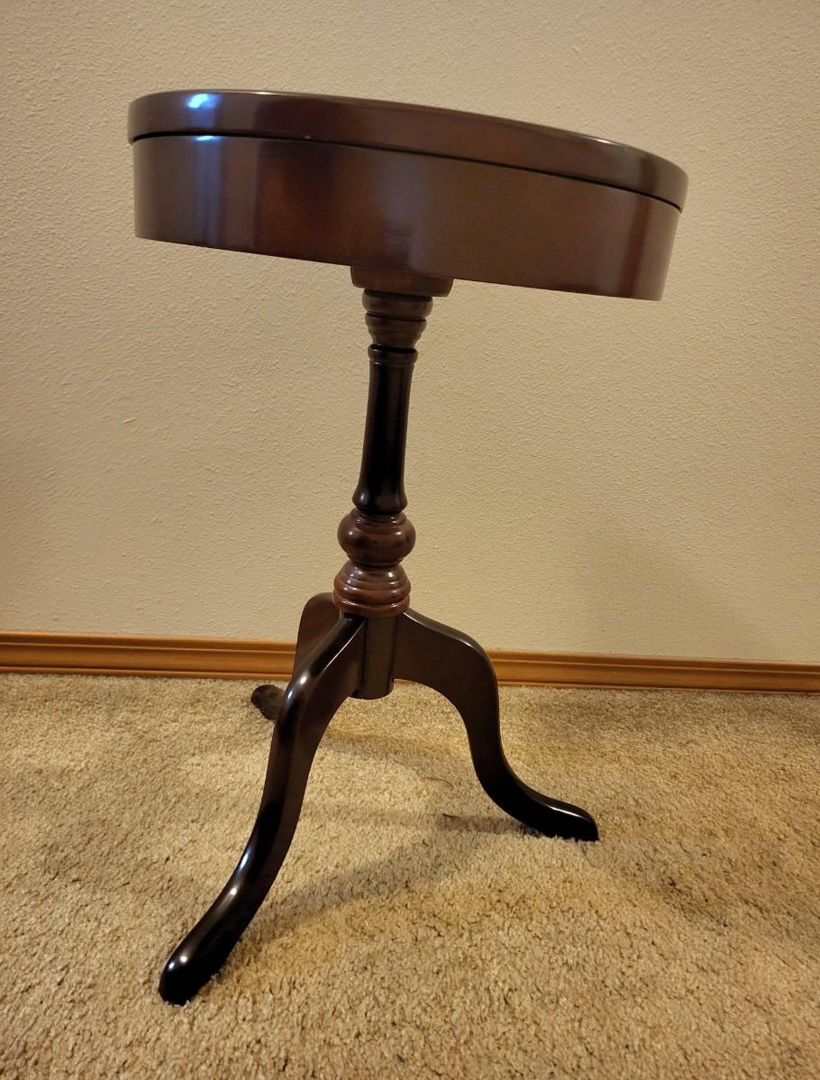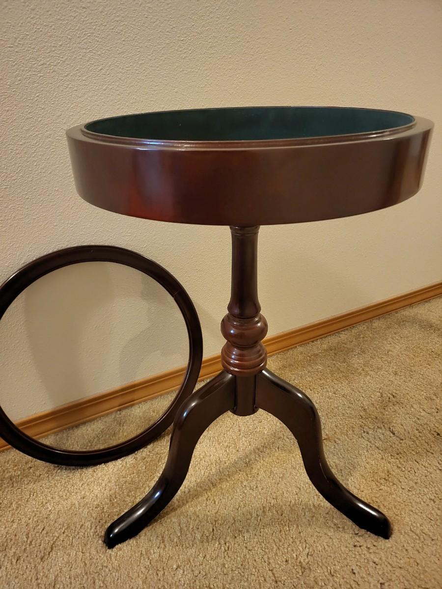 The Bombay Company, 1991. Cherry finish shadowbox side table. Removable glass top, tripod, Queen Ann style curved legs, dark green felt lined display/shadow box top. Measures 23" tall x 14.5" round x 3" deep. Neat table to display jewelry, rocks or your other small collectibles. Shipping not available on this item.