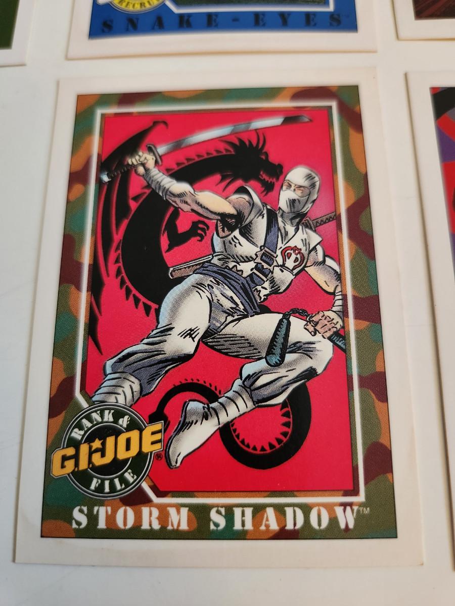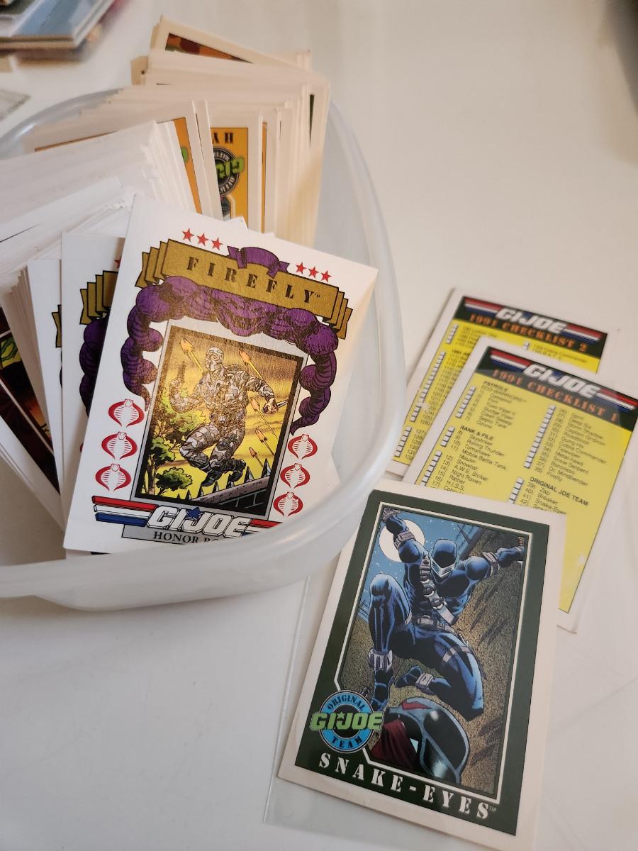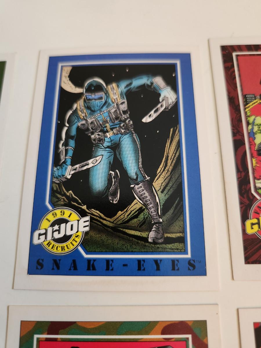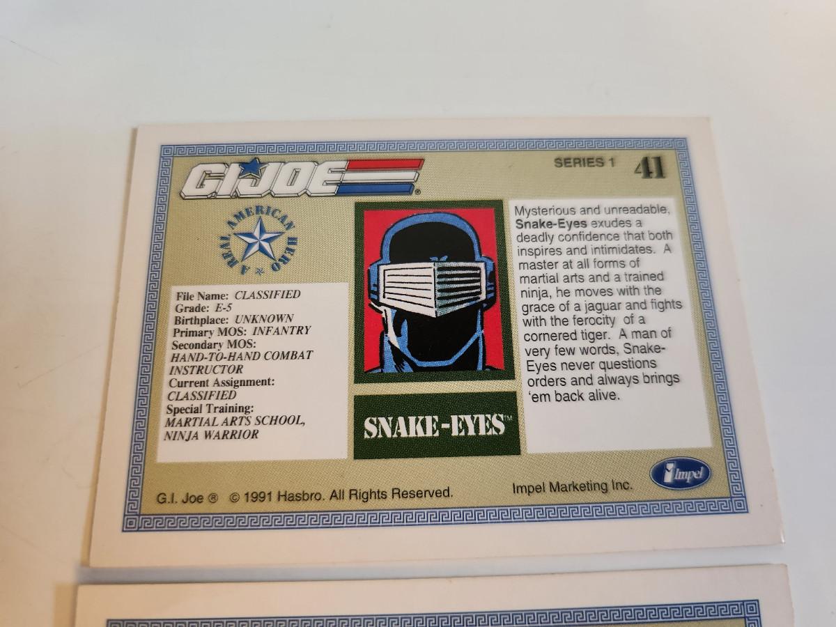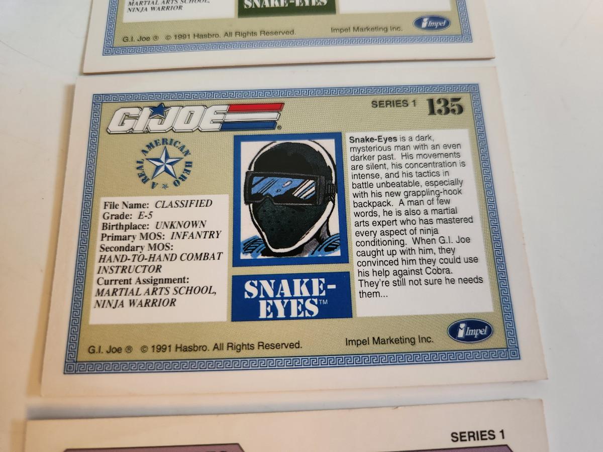 This auction lot is for a 1991 GI Joe Trading Card Collection. This 'nearly' complete set of what should be 200 cards - is probably missing about 20 cards. This set of Trading Cards was not stored in prime conditions. Our in-house collections expert says it is in OK to good condition - some cards better or worse than others - but we are not PSA, Beckett or SGA. HOWEVER, This offering does include what we understand are the 5 most desired and difficult cards to obtain. We have numbers 28, 38, 135, 154 and the ever elusive 41 Snake-Eyes. Buy it all as a lot and do with it what you will.