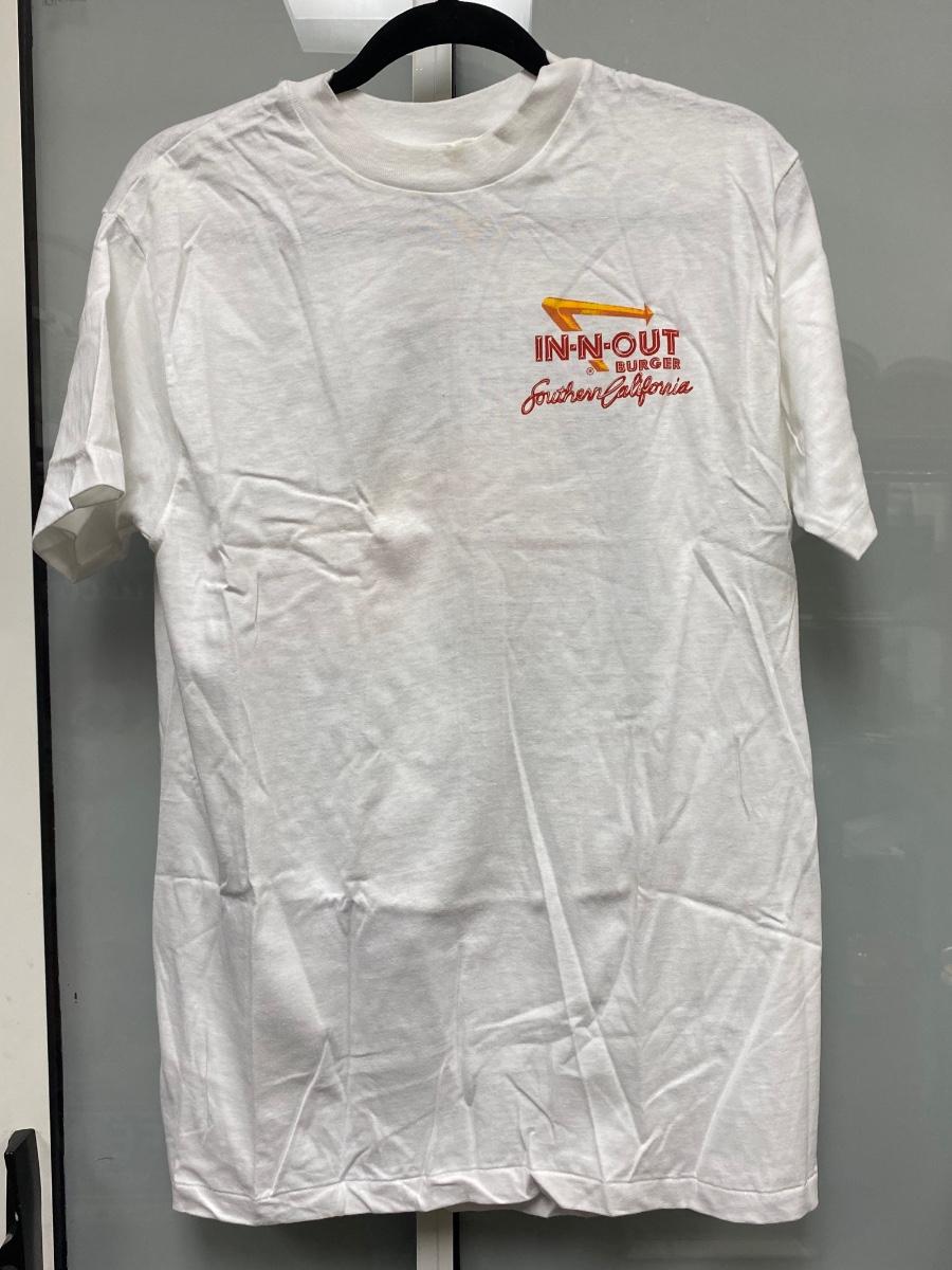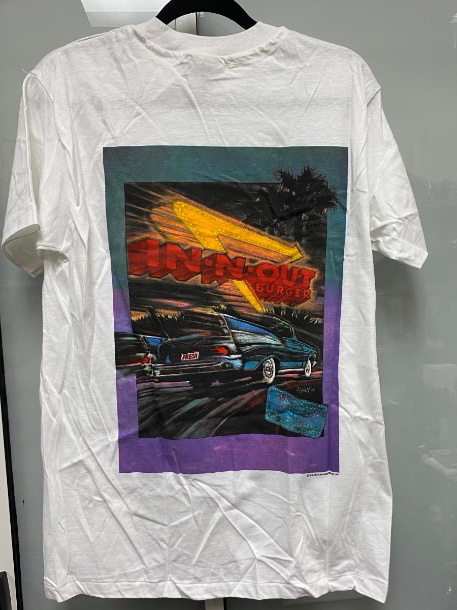 1991 In & Out Burger Collector Tshirt. Welcome to California by B. Hall. Size large. Good condition, A light smudge on front of color, may just be dust/dirt from storage, doesn't look like a spot.