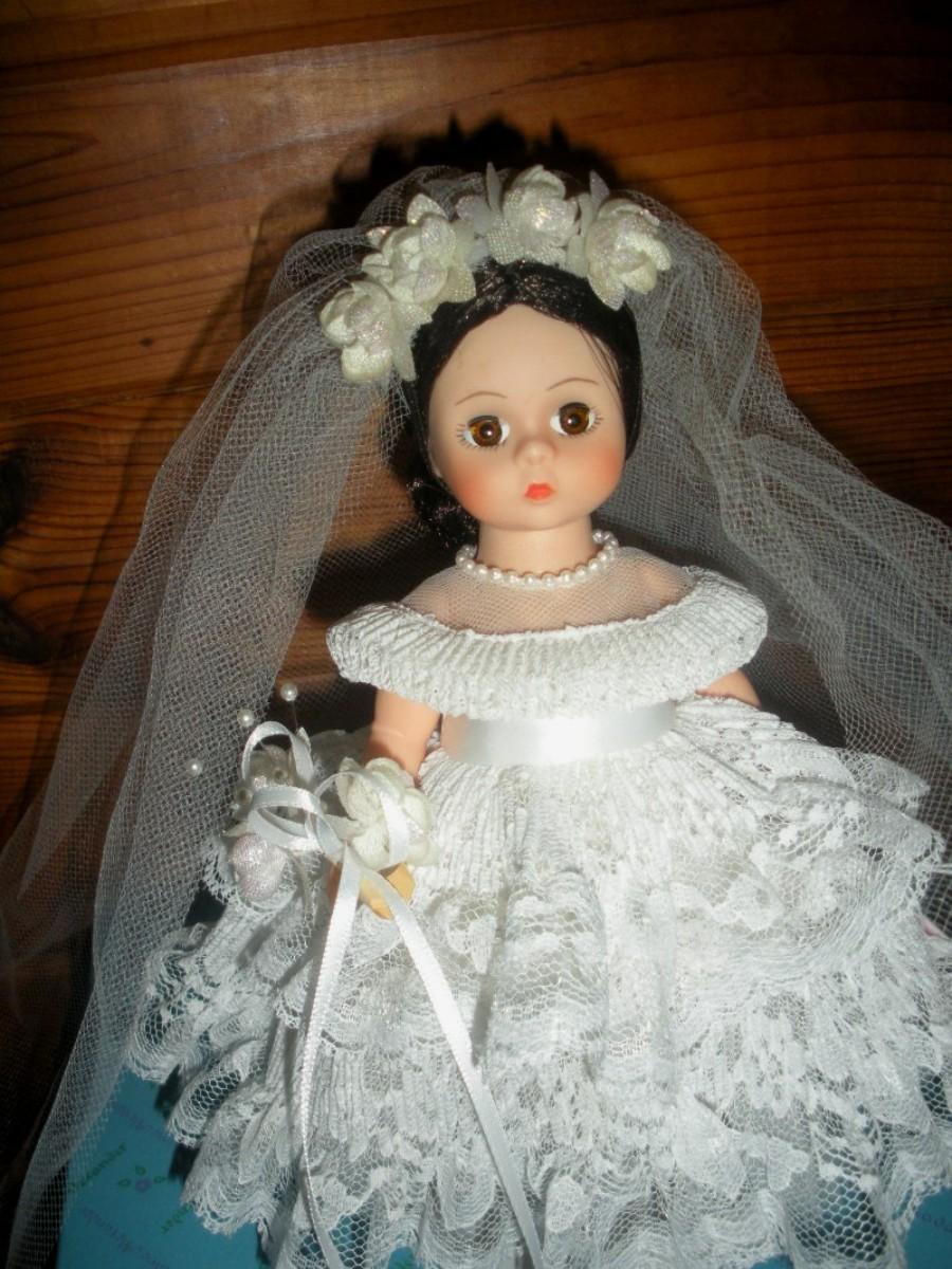 Beautiful little brunette doll. Comes with corsage, satin slippers, stockings and of course her dress, slip and veil. In her original box. #336
