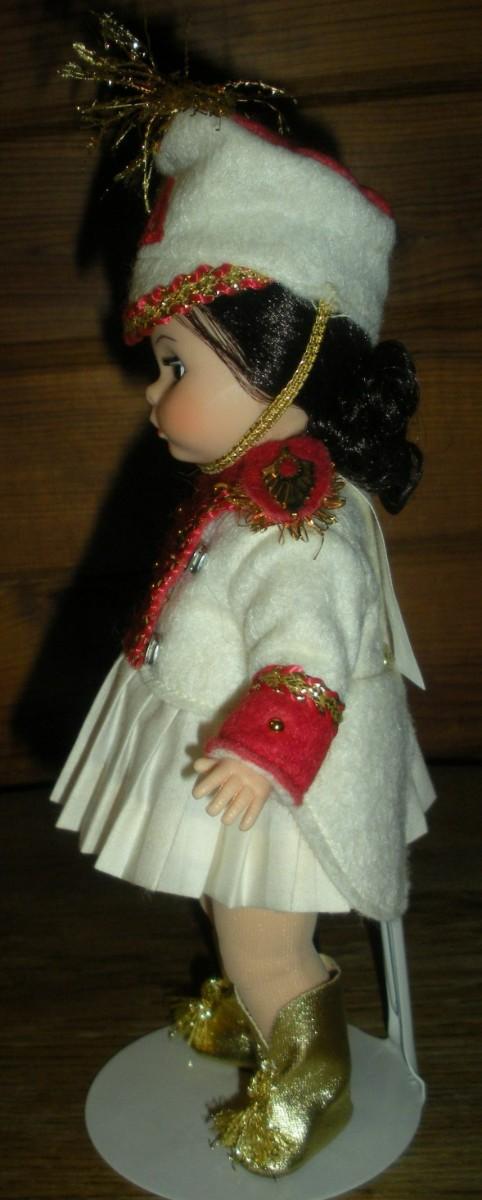 This adorable little lady leads the band! She is an 8" Drum Majorette. Great uniform down to the tassled boots. Made in 1991. In original Box. Excellent condition.