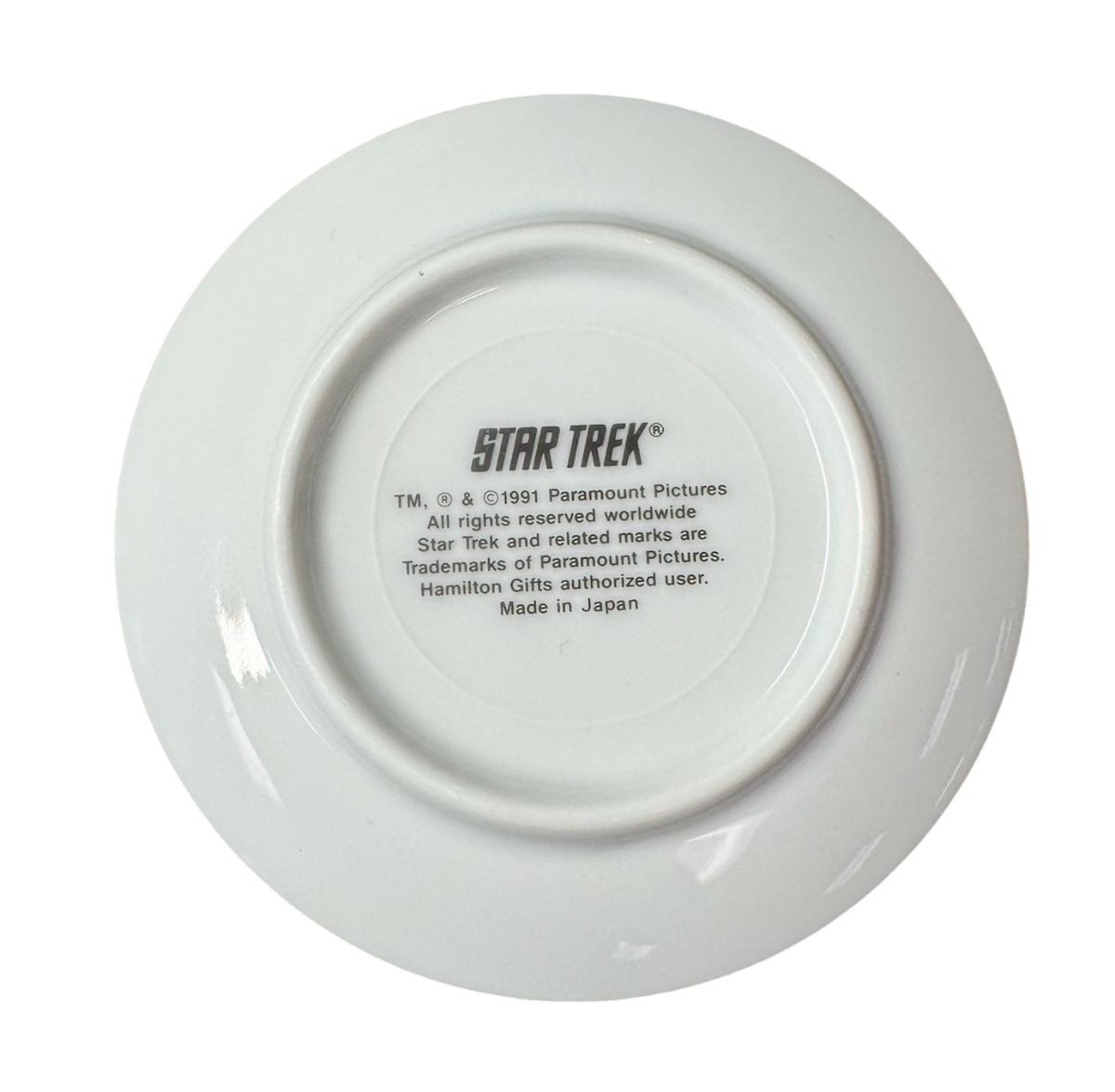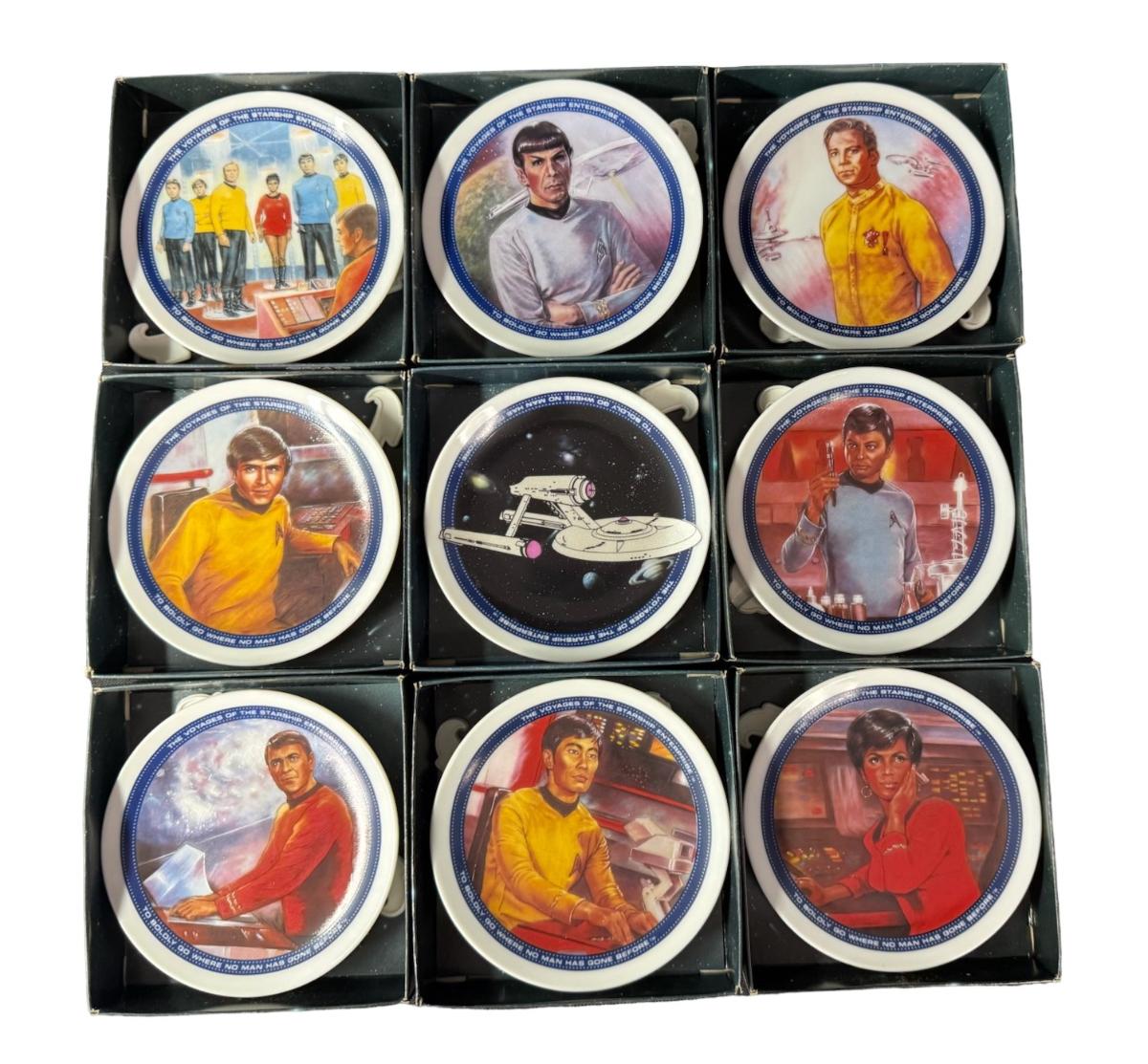 This is the original nine-plate set, made by Hamilton Gifts. The plates feature characters and scenes from The Original Series. Each four-inch plate includes a display stand. Total of nine pieces. In the original packaging. Pre-auction estimate: $50-$75.