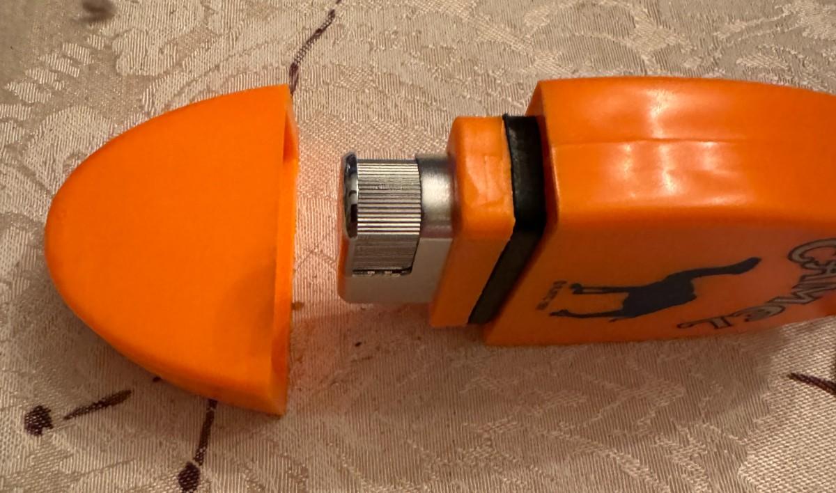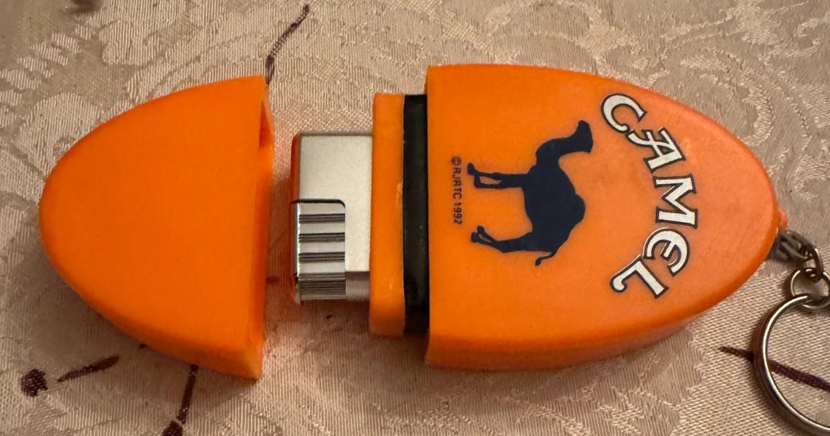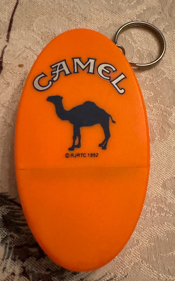 Camel Cigarettes orange refillable lighter/keychain. It is orange in color and features the Camel logo and the text "RJRTC 1992".
