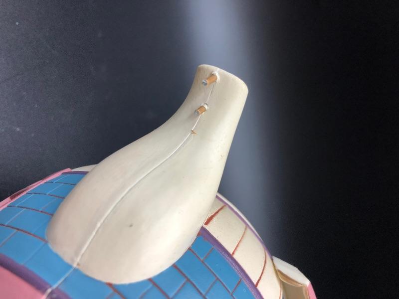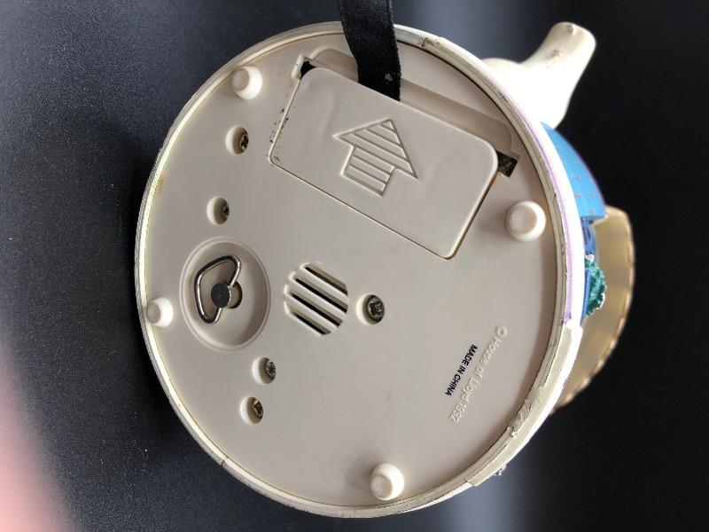 Plays music without batteries. Believe it lights up with batteries , but couldn’t find any batteries to test it with. It measures 6” high and 6” wide. There are two sharp prons they come down underneath the spout that probably supported the swing that is missing.