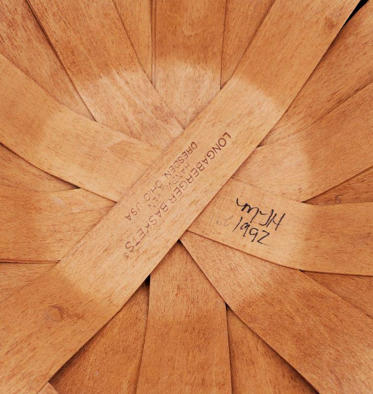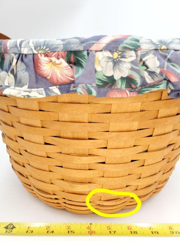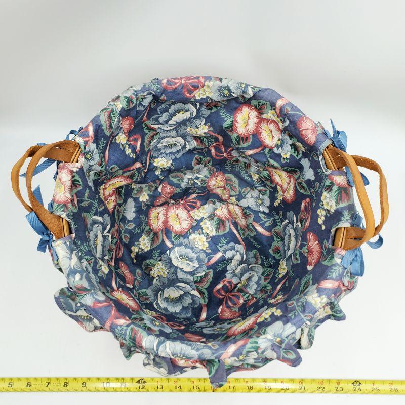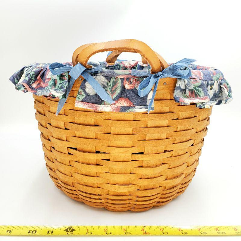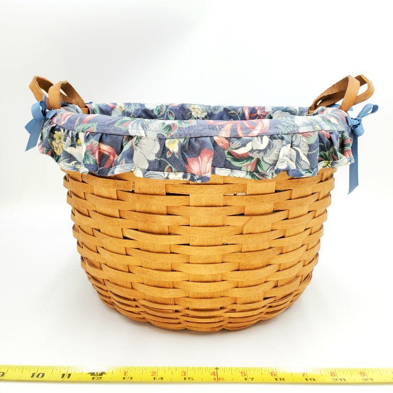 1992 Longaberger keeping basket, leather handles, blue bows and a very pretty blue and pink floral cloth liner. There is a small chip in the wood weaving, see photo. Good condition otherwise!