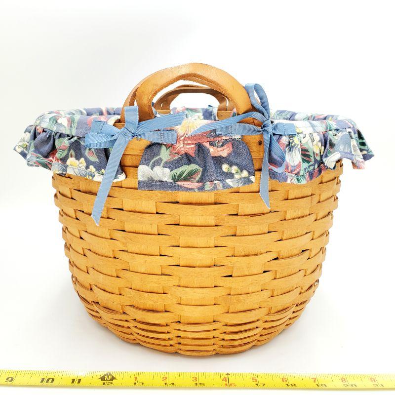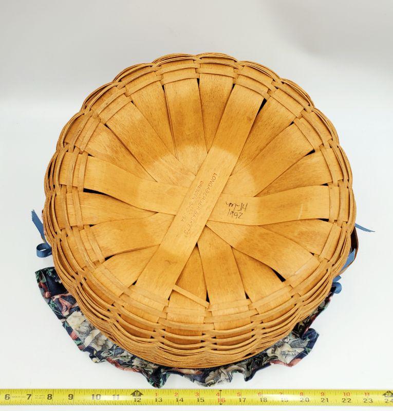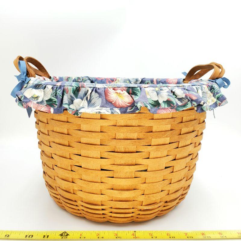 1992 LONGABERGER 13" ROUND KEEPING BASKET WITH BLUE & PINK FLORAL LINEN LINER