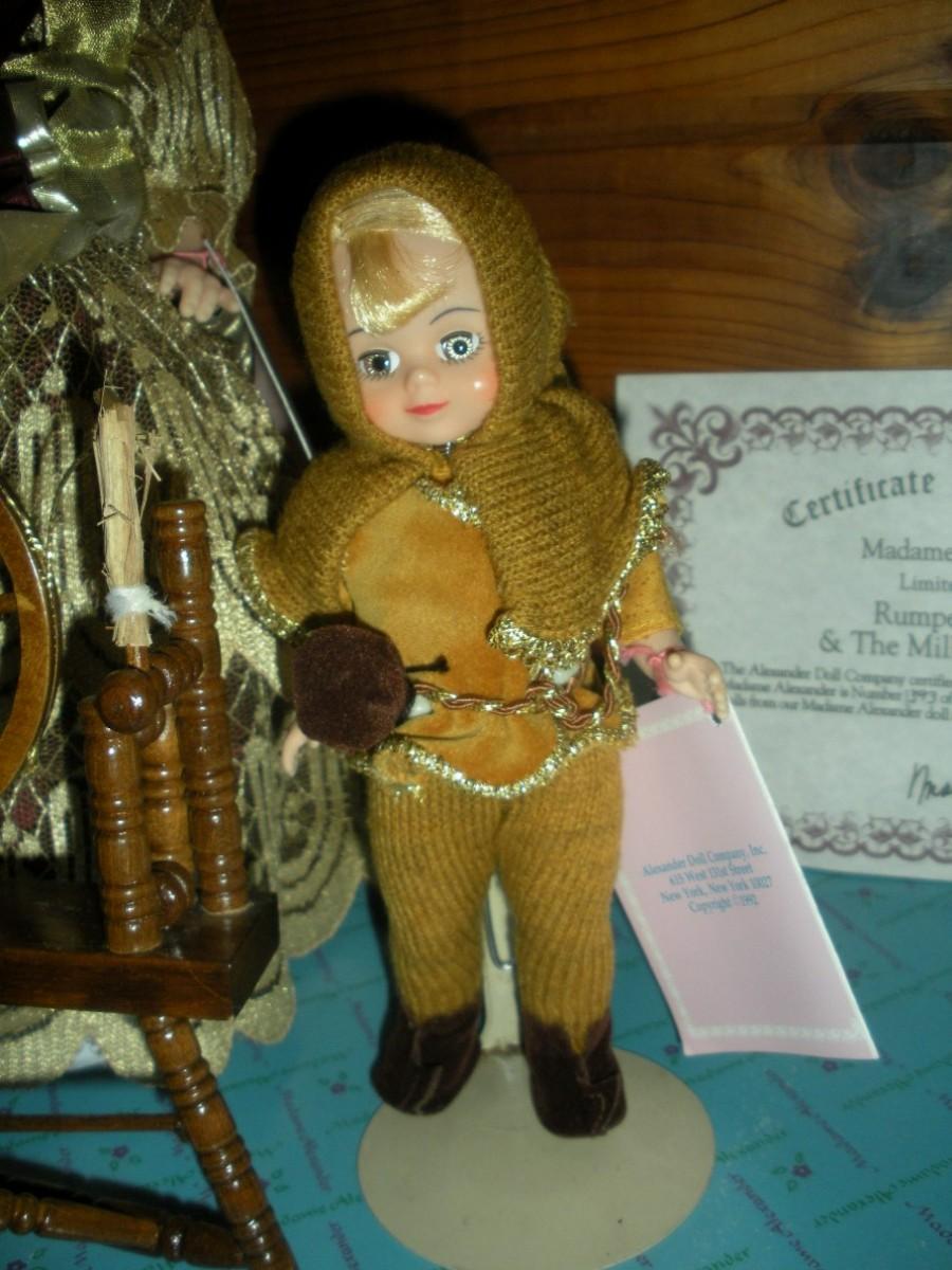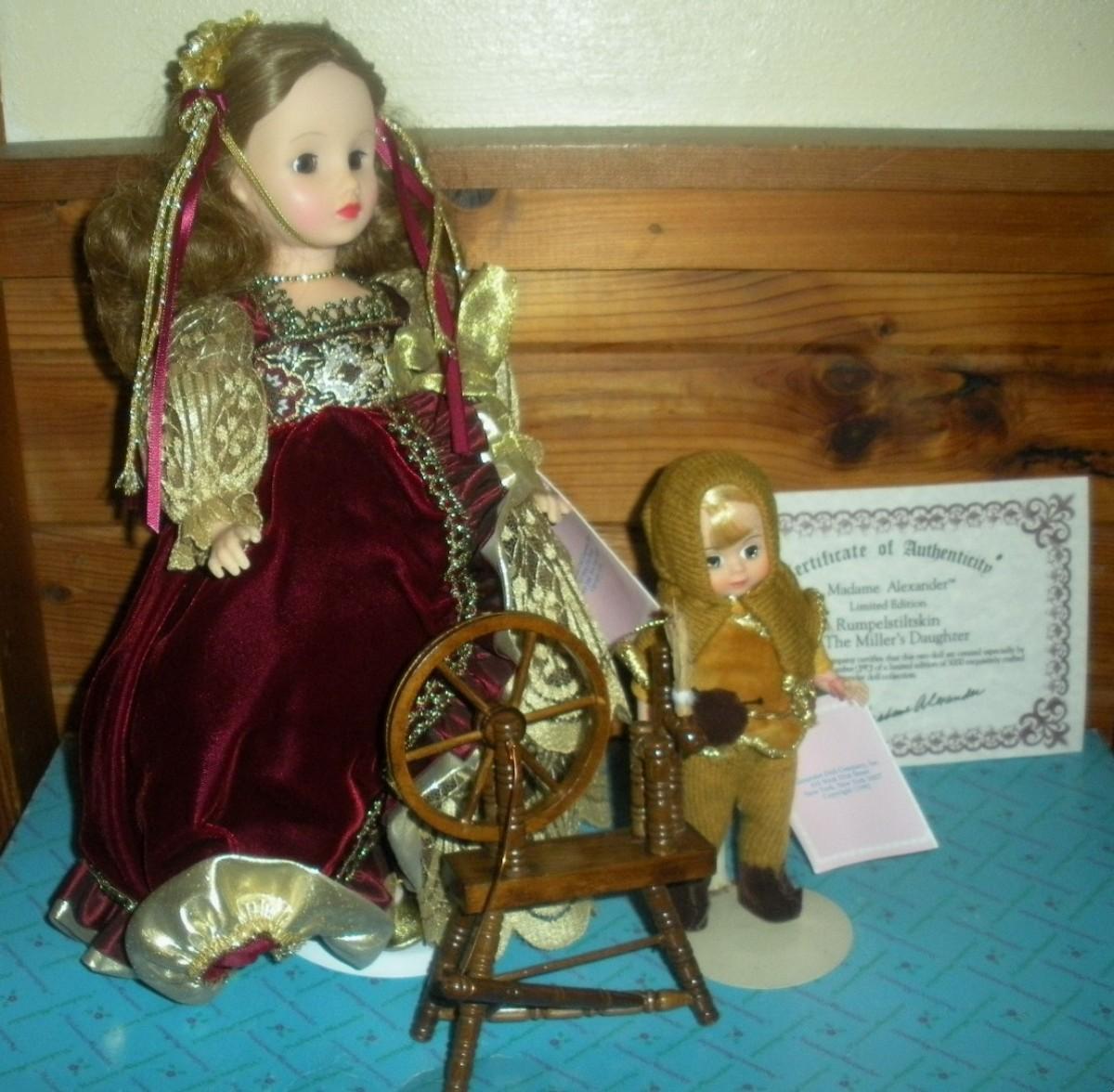 14" Miller's Daughter with 8" Rumplestiltskin. Comes with spinning wheel for spinning straw into gold. Only made in 1992. This set is #1393 of just 3000 made worldwide. #1569. Only complete set I've actually seen. In excellent vintage condition. Box has a dent and some shelf wear. Comes with COA and Wrist tag. Current value if mint is $300. Much lower here!