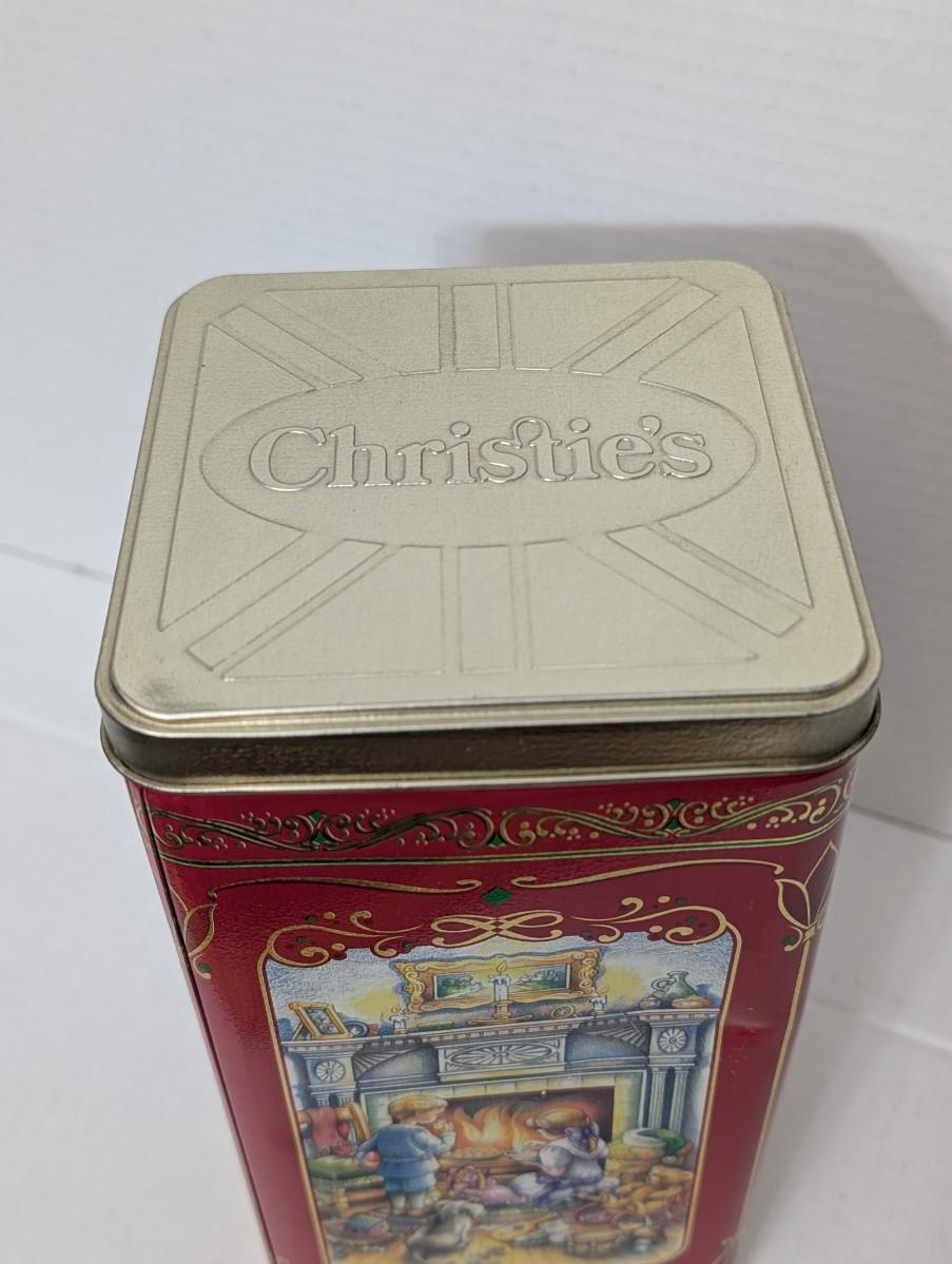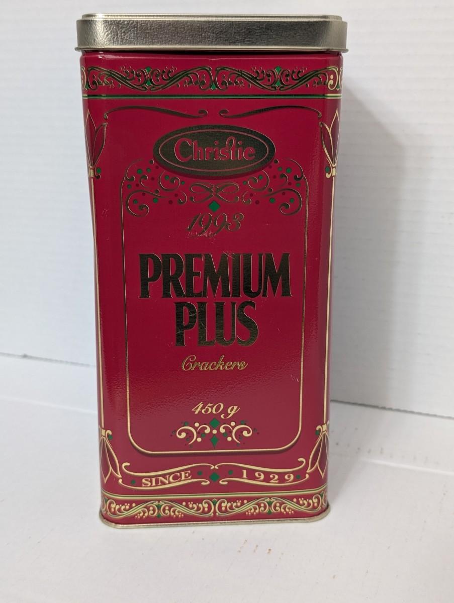 Vintage 1993 Christie Premium Plus Crackers tin featuring an elegant red and gold design with festive scrollwork and winter skating scene artwork. Marked “Since 1929” and “450 g.” This collectible tin once held crackers and now makes a charming display piece for holiday décor, retro kitchen style, or advertising memorabilia collections.