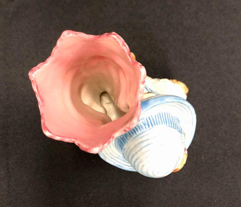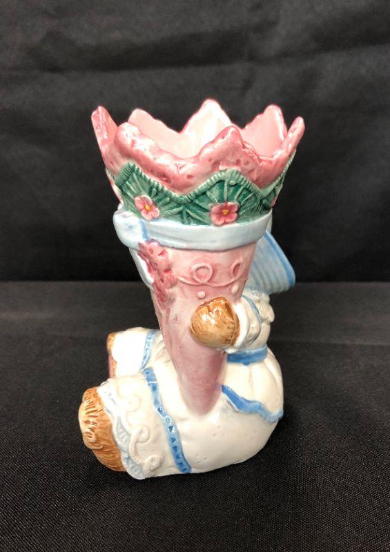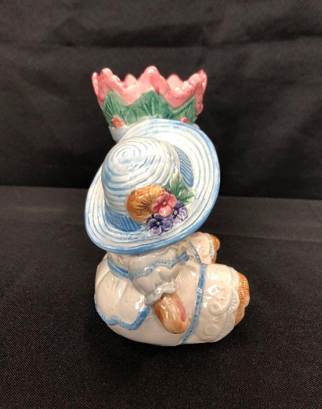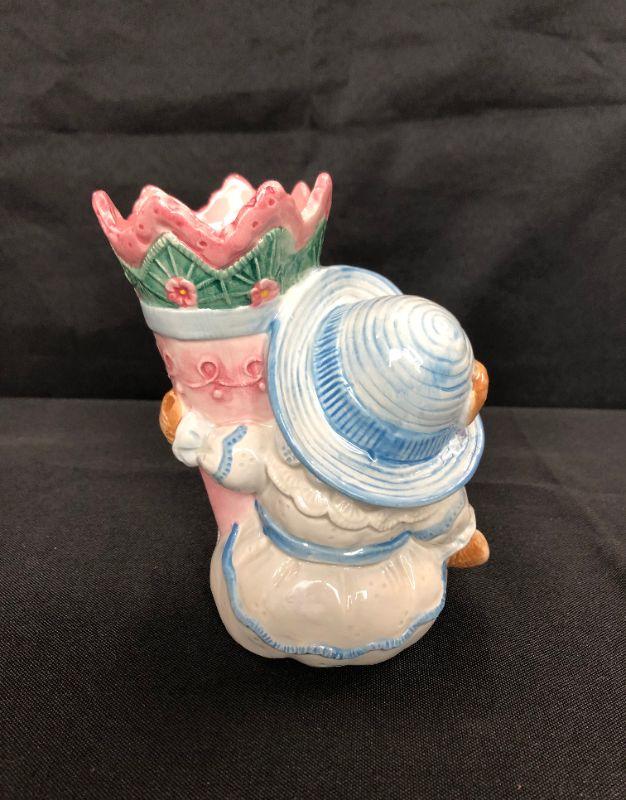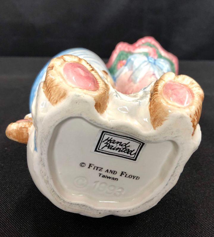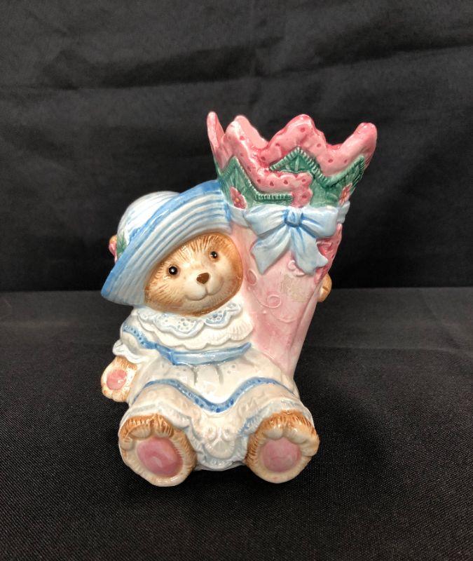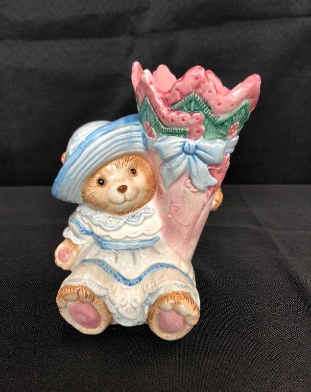 Cute 1993 Fitz and Floyd Bear Vase. Ceramic bear wearing a white and blue dress holding a bouquet wrap. The bouquet wrap is the vase part. Great Condition. No chips or cracks.