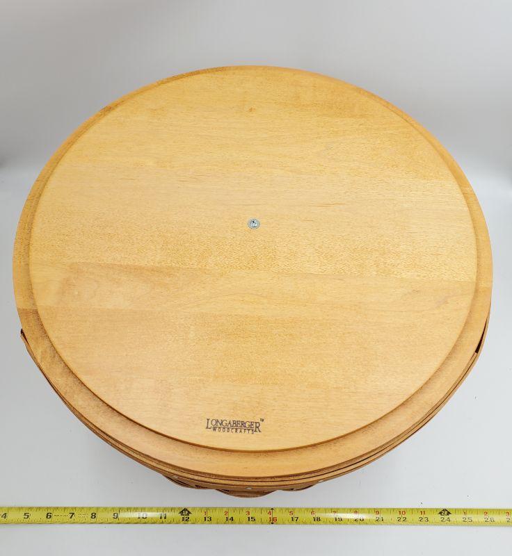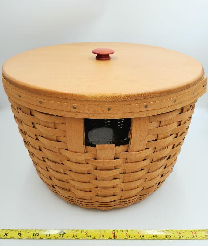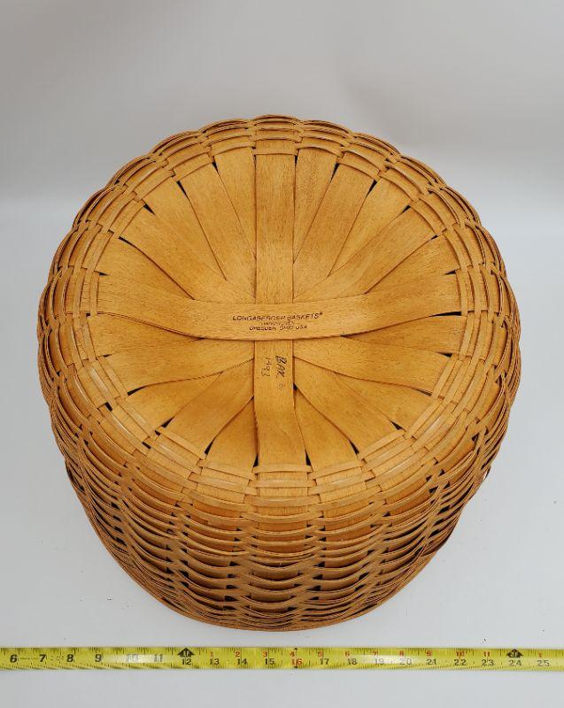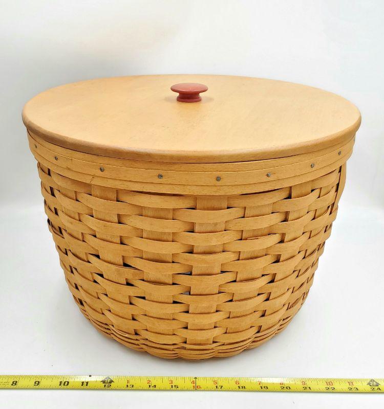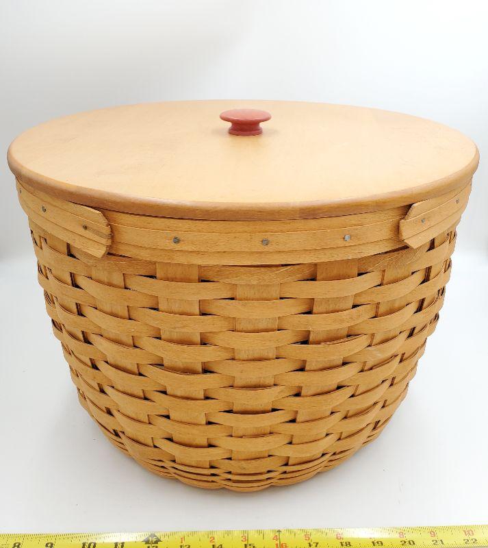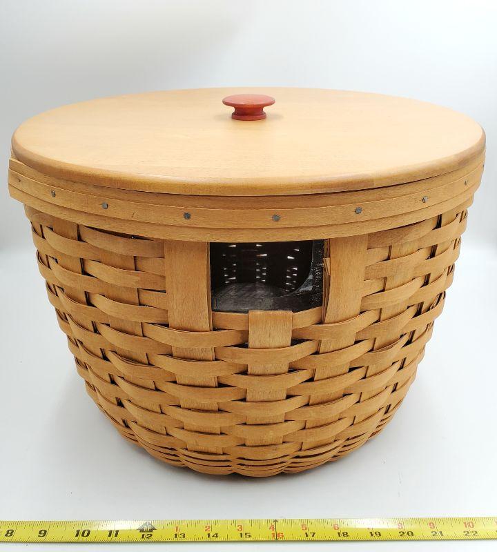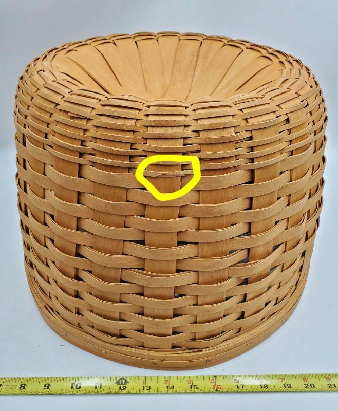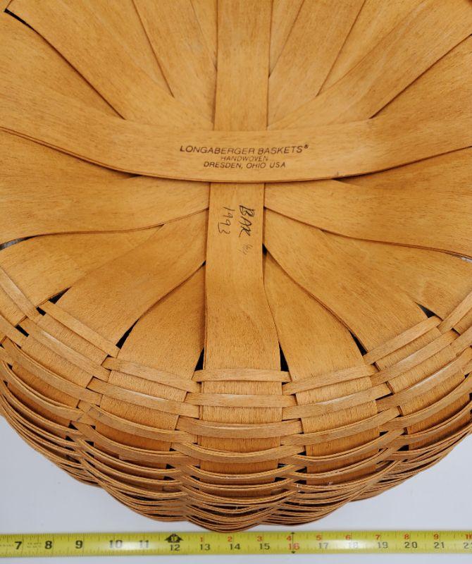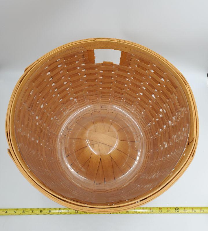 1993 Longaberger 17in corn bushel basket with lid. The basket does has some small chips, please see photos. Adorable basket with handles and a plastic liner!