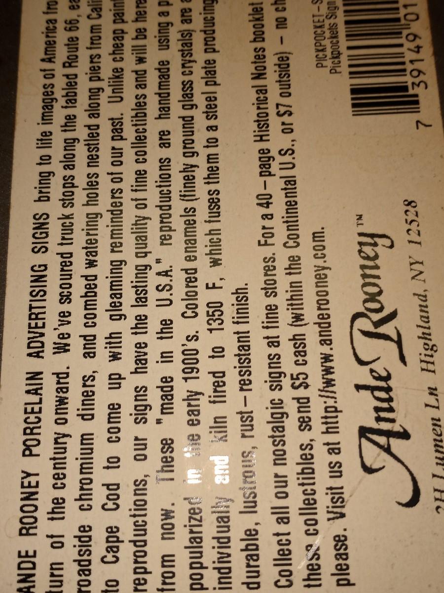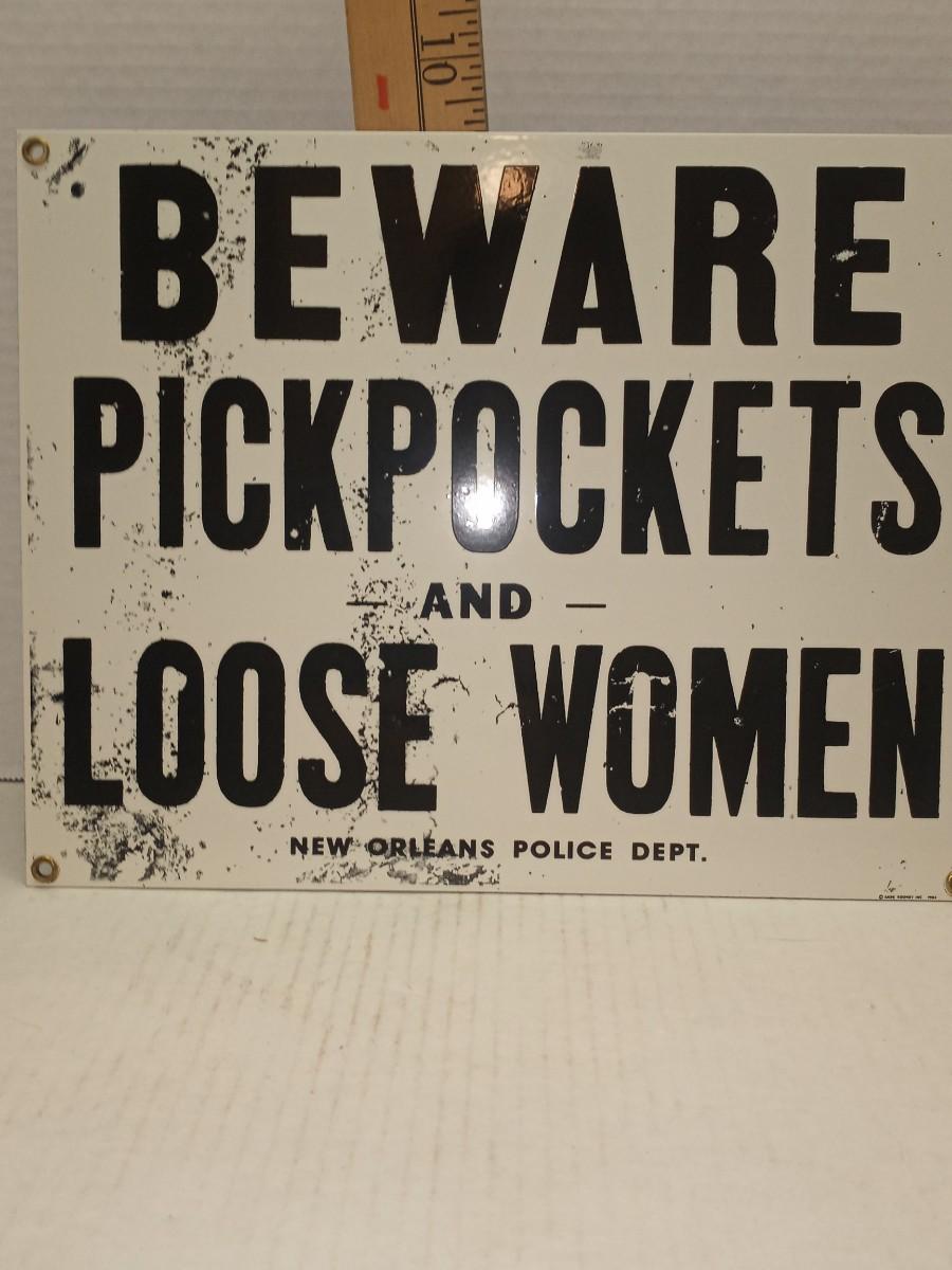 1994 Enameled Porcelain BEWARE OF PICKPOCKETS & LOOSE WOMEN SIGN (Ande Rooney)
