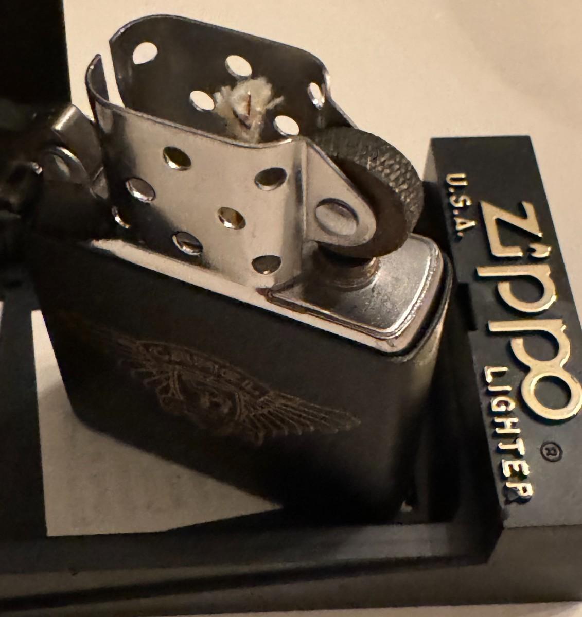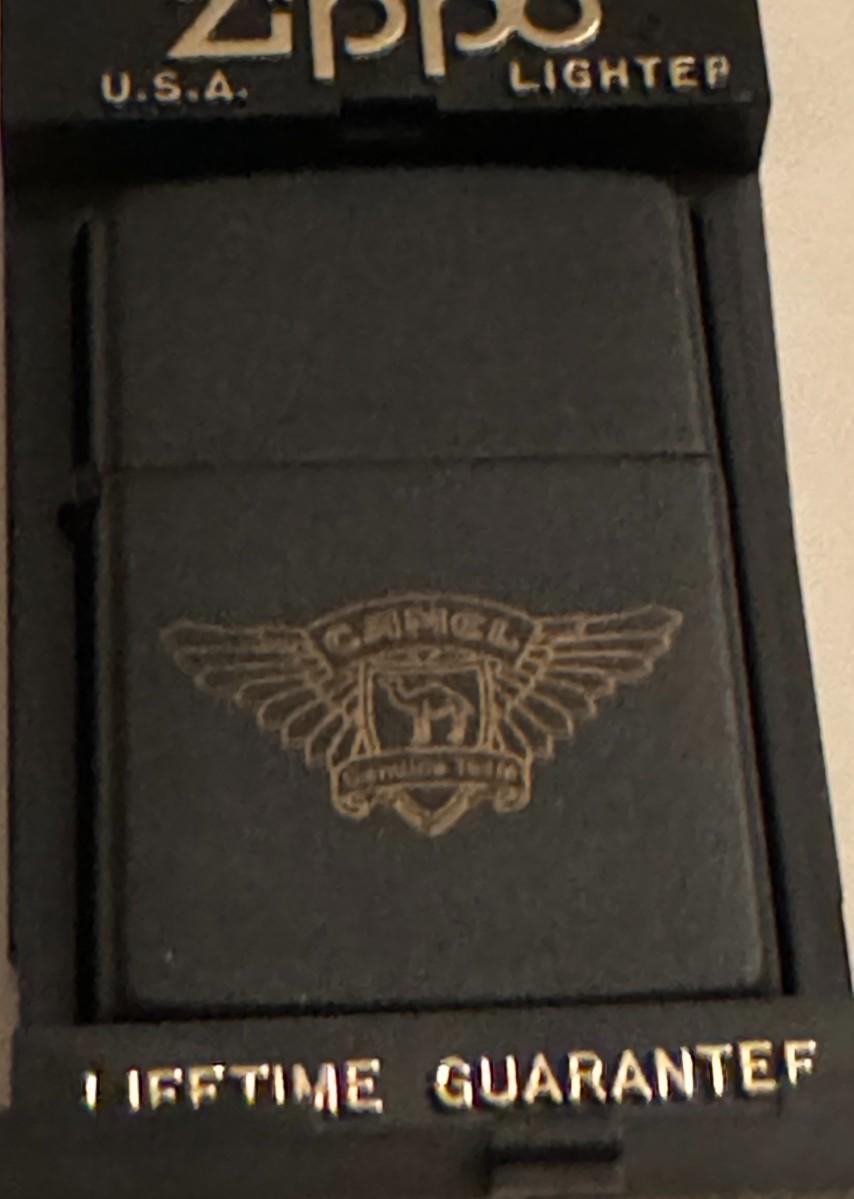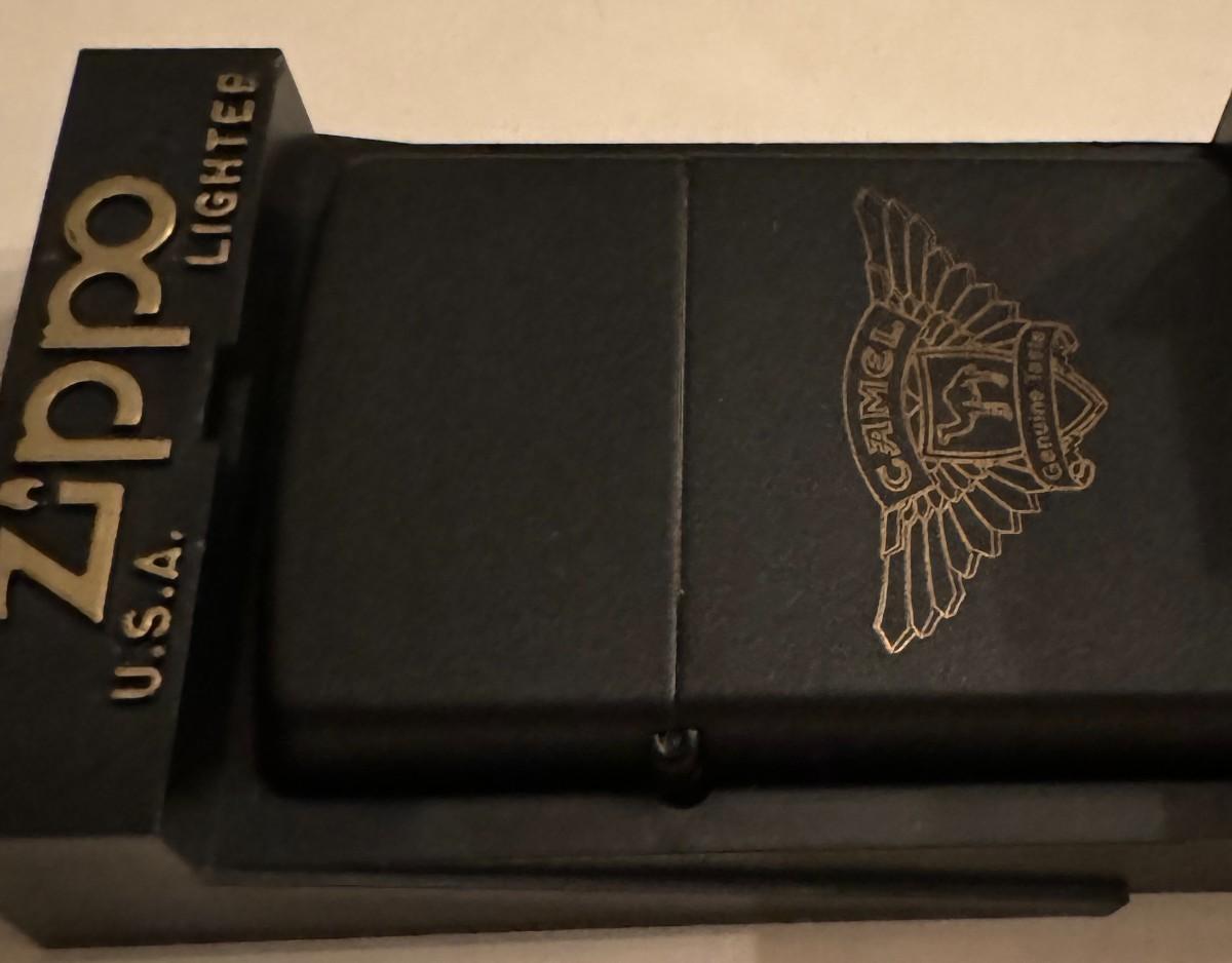 Zippo lighter featuring the "Camel Genuine Taste" logo with wings on a black matte finish. The lighter appears to be in its original packaging.