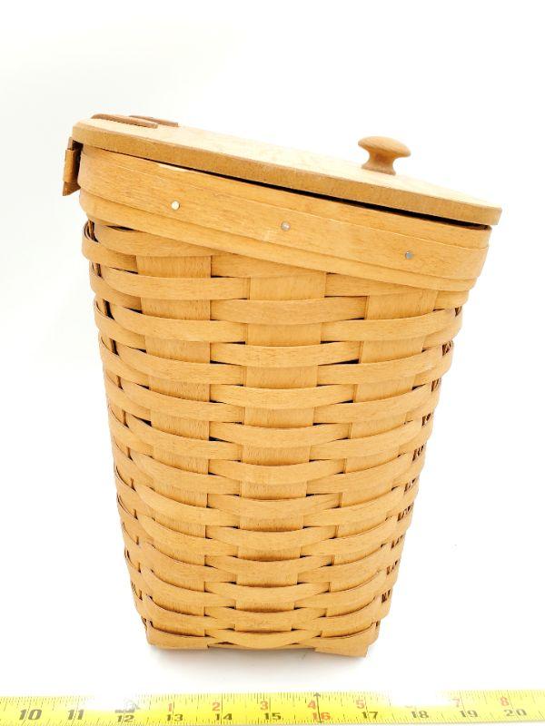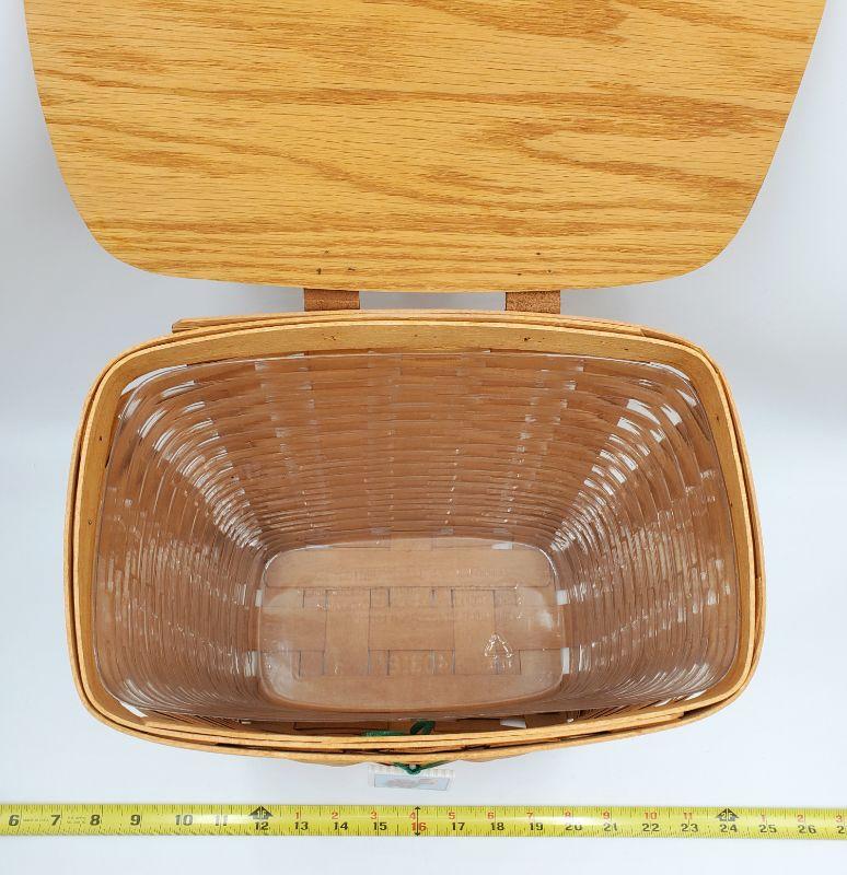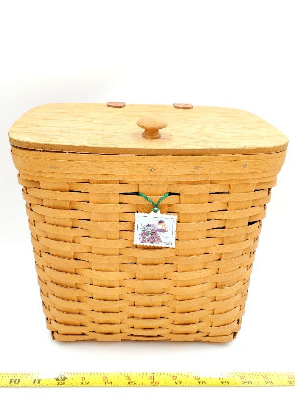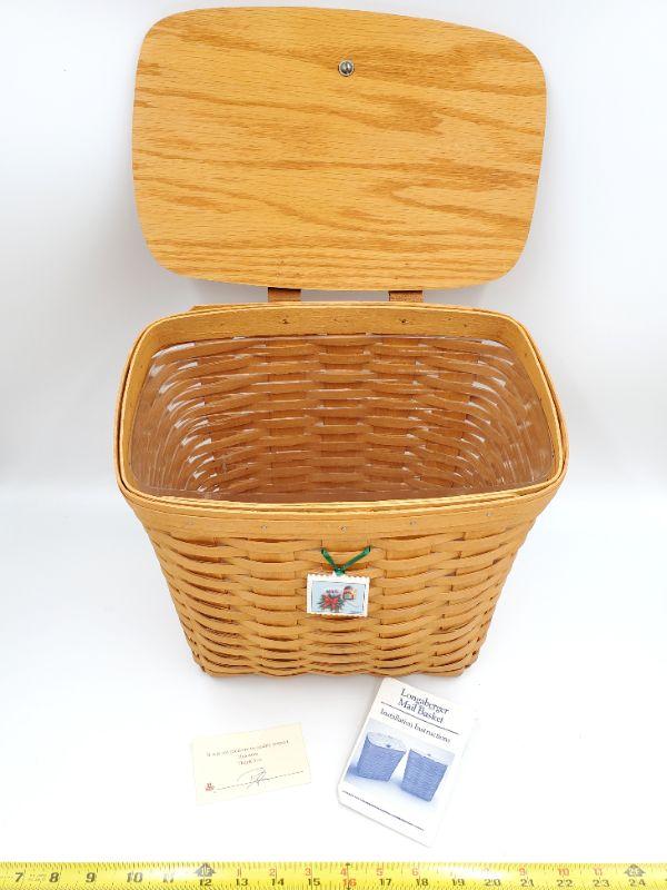 1995 Longaberger Mail Basket with reversible mail tag and plastic liner. Hanging instructions and mountings included.