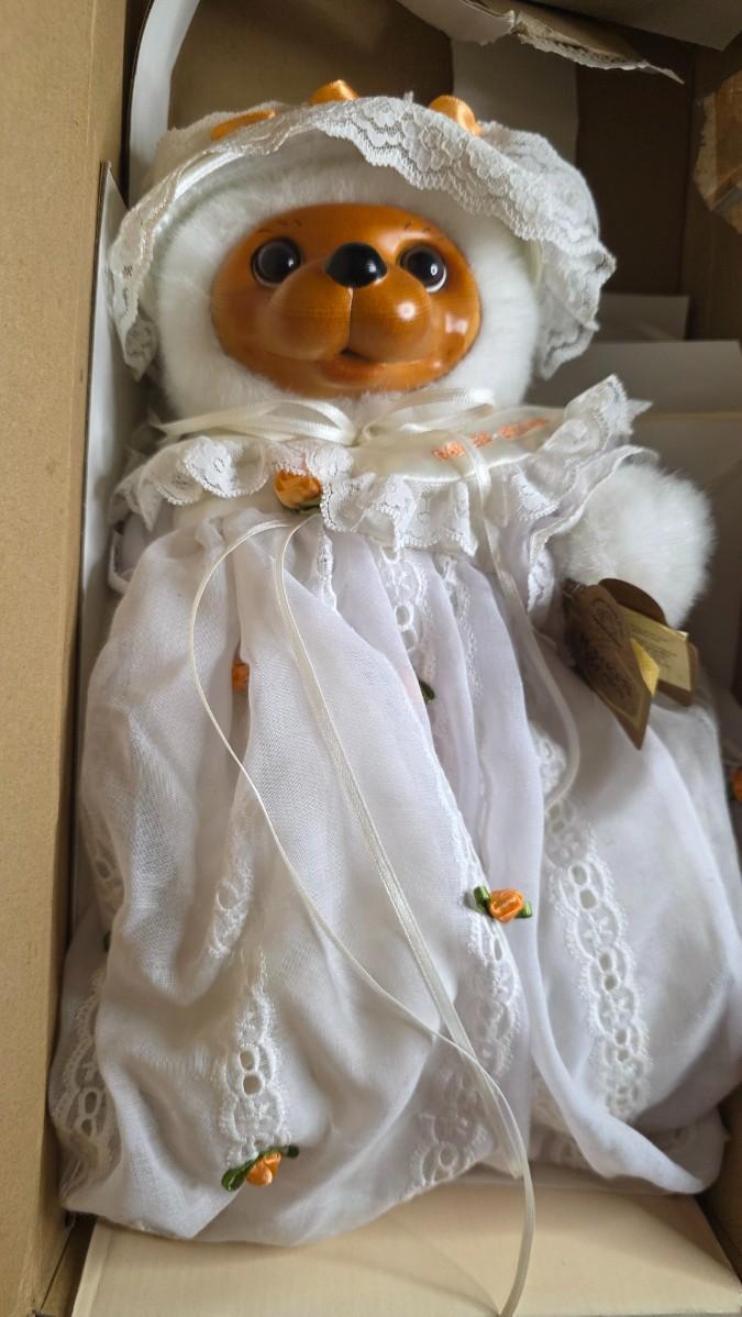 Sought after by Raikes enthusiasts and collectors of fine artisan bears, Whitney represents a fleeting moment in the artist’s celebrated 1990s production line—when each design was released in limited quantity and accompanied by full documentation. With her serene expression, intricate wardrobe, and complete provenance, this piece offers both display beauty and long-term collectible potential.