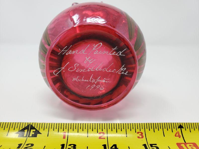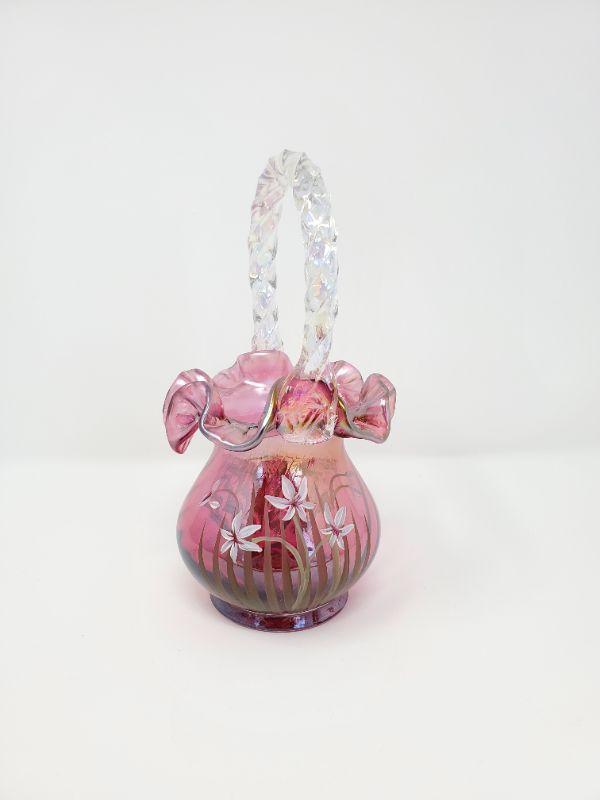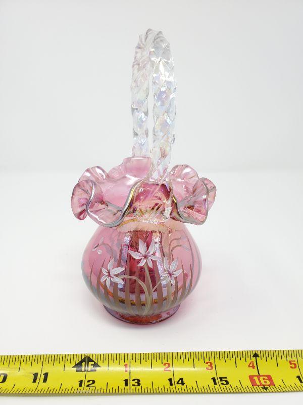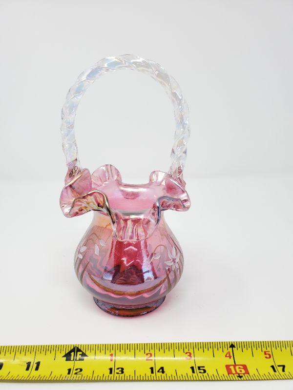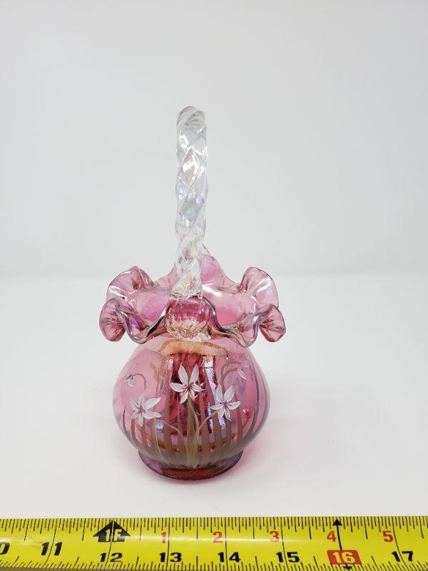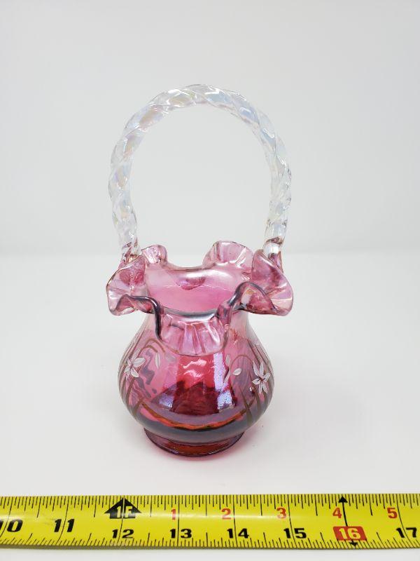 This Fenton ruffled edge basket is super cute and in very good condition. Hand painted and signed on bottom...Fenton stamped into glass on the bottom, looks to be stamped twice.