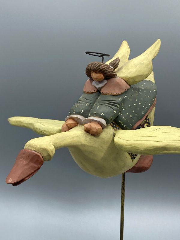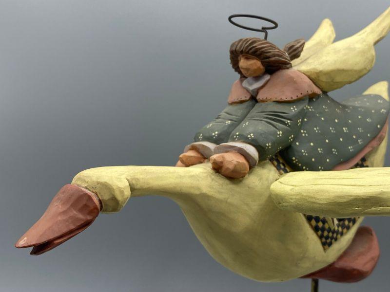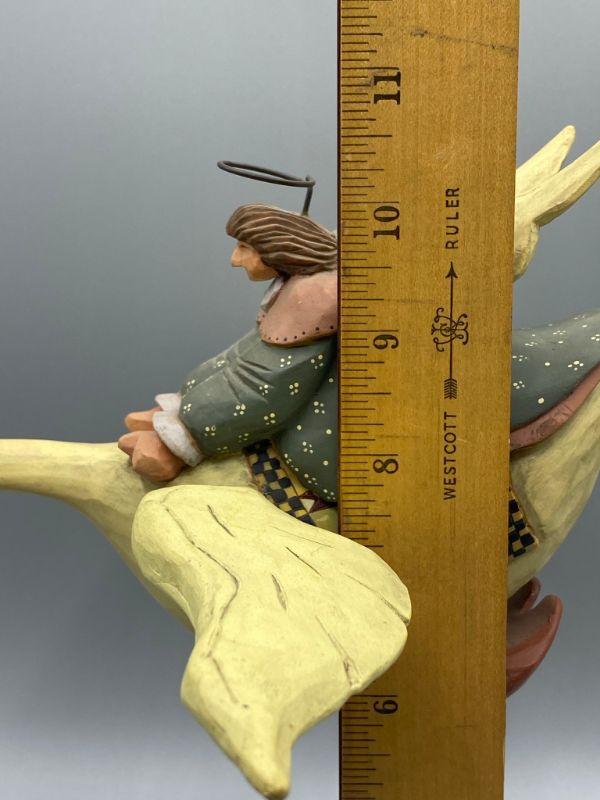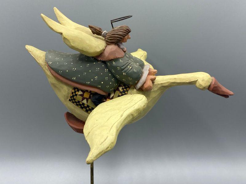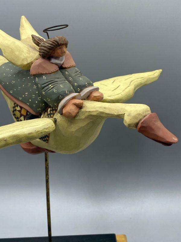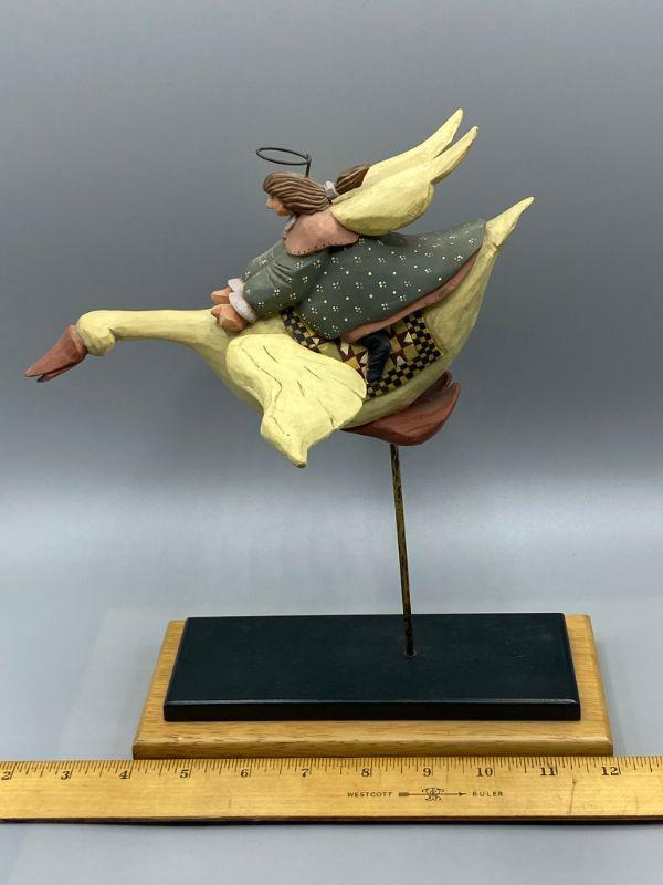 1996 Williraye Studio "Hope Takes Flight" figurine #WW1204. Features an Angel riding upon a large goose. Country, shabby chic look. Mounted on a heavy wood block. No broken pieces or chips, there is a discolored spot on the end of the goose's beak. Metal pole that attaches the figure to base is discolored. Stands at almost 10.5".