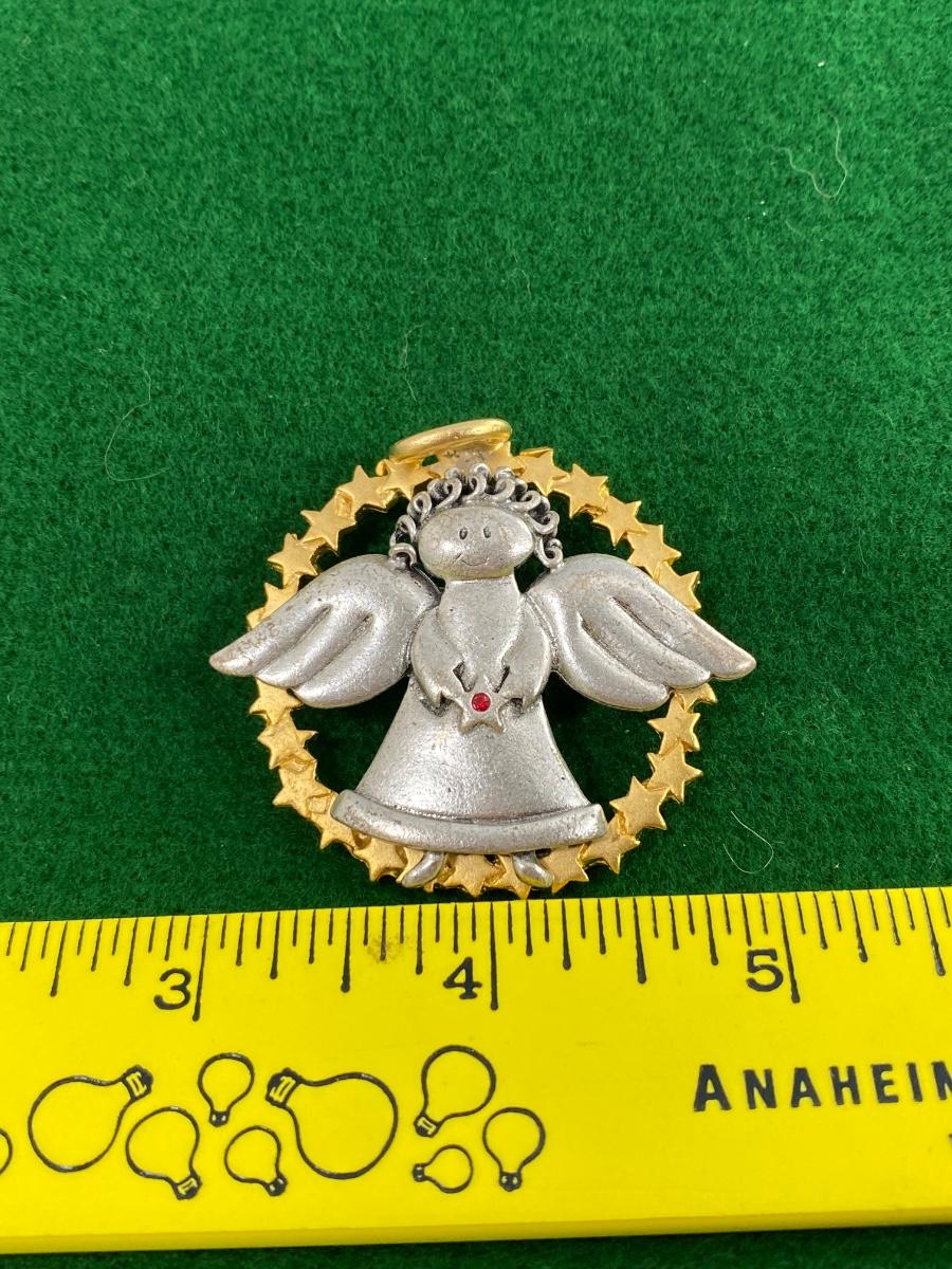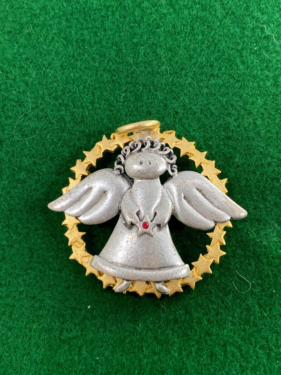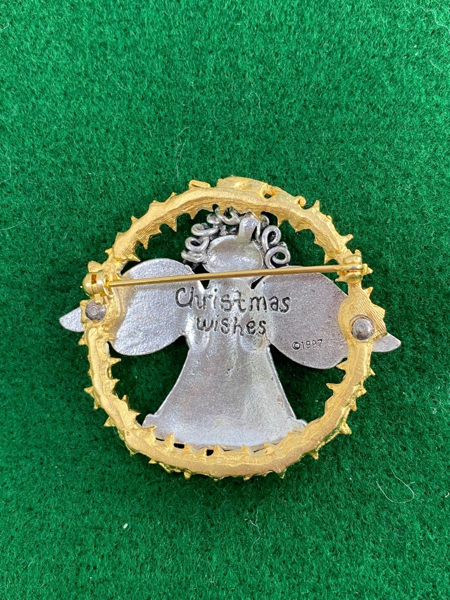Christmas Wishes angel pin. Gold and silver tone metals, the star has a small red rhinestone in the center. About 2" size. Dated 1997.