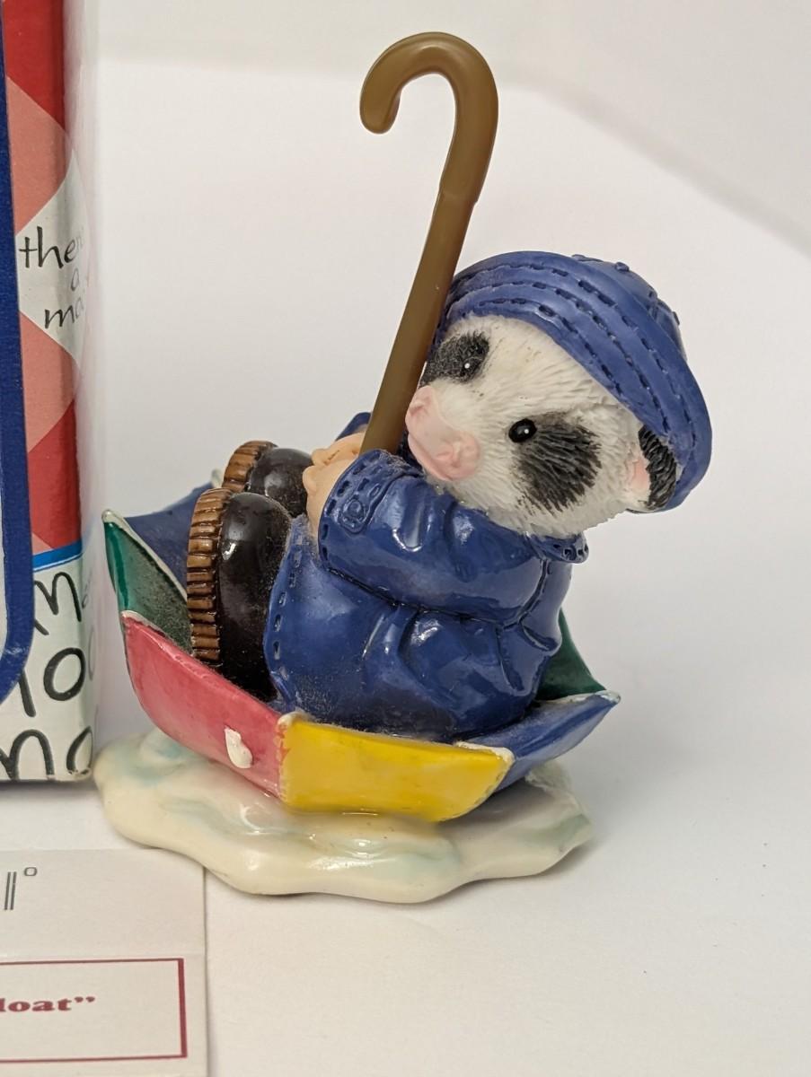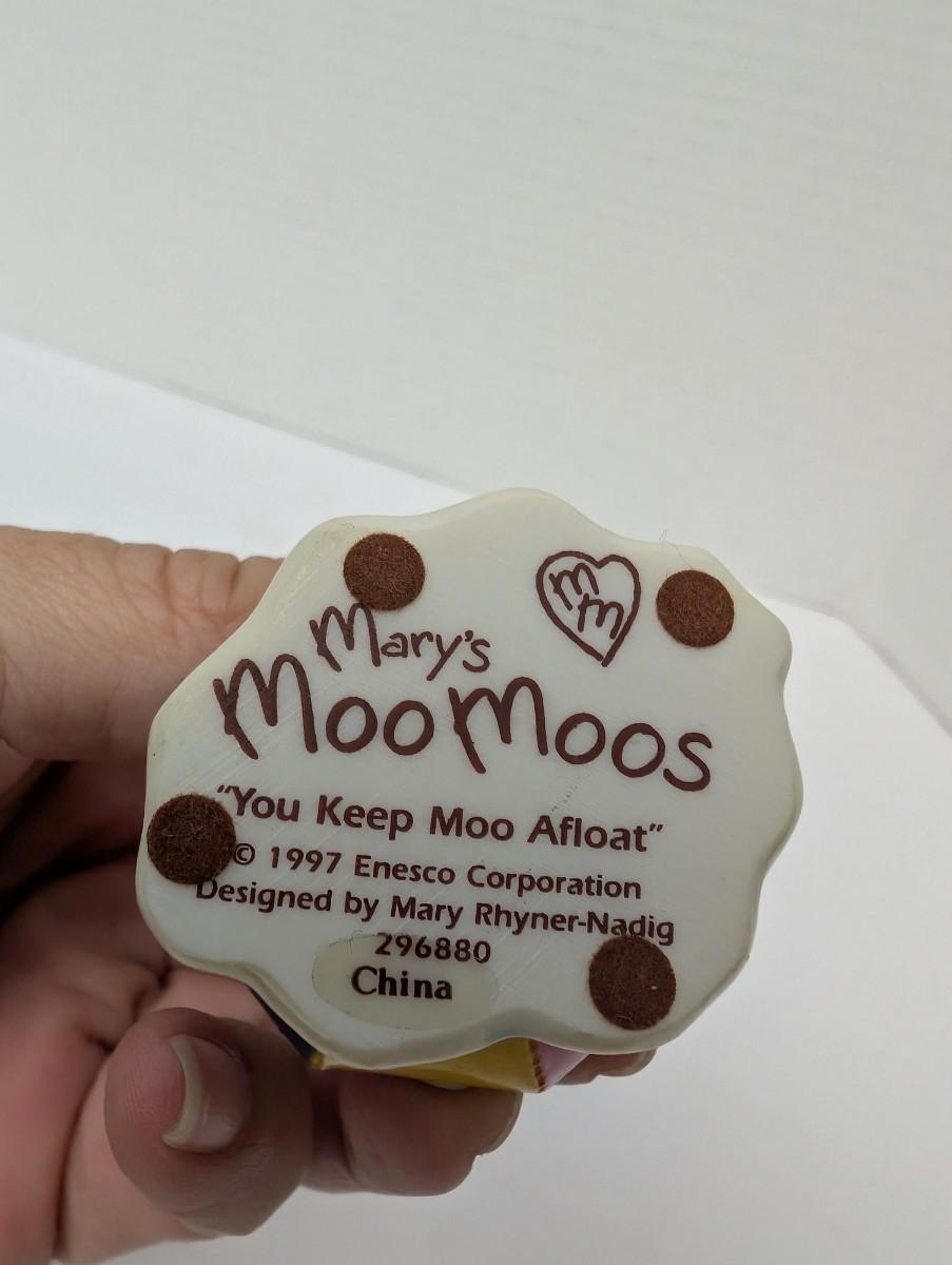 Adorable 1997 Enesco Mary’s Moo Moos mini figurine titled “You Keep Moo Afloat,” featuring a cow in a raincoat floating in a colorful umbrella. Designed by Mary Rhyner-Nadig, this collectible comes with its original box and ID card. Perfect for fans of whimsical cow decor and nostalgic collectibles.