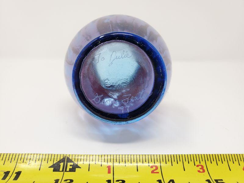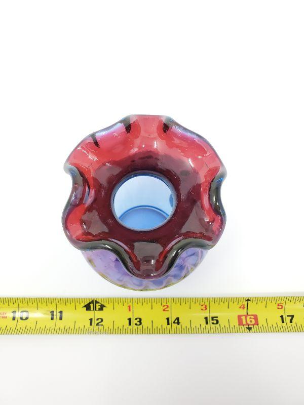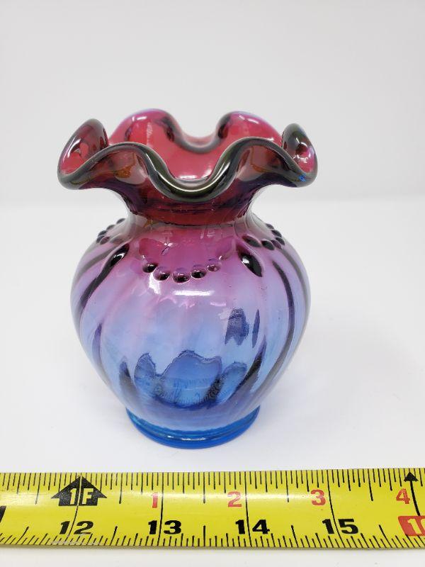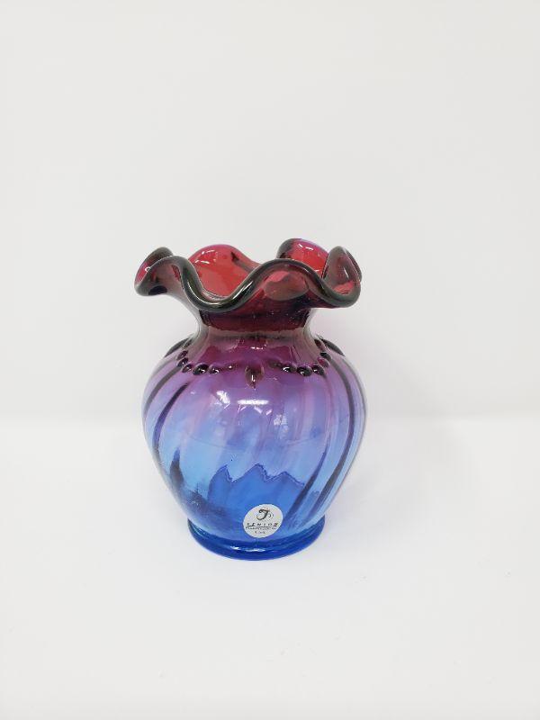 This gorgeous vase is multicolored with a ruffled edge...very good condition, Fenton stamped into the glass on the bottom, signed, To Julie George Fenton 97, Fenton sticker attached.