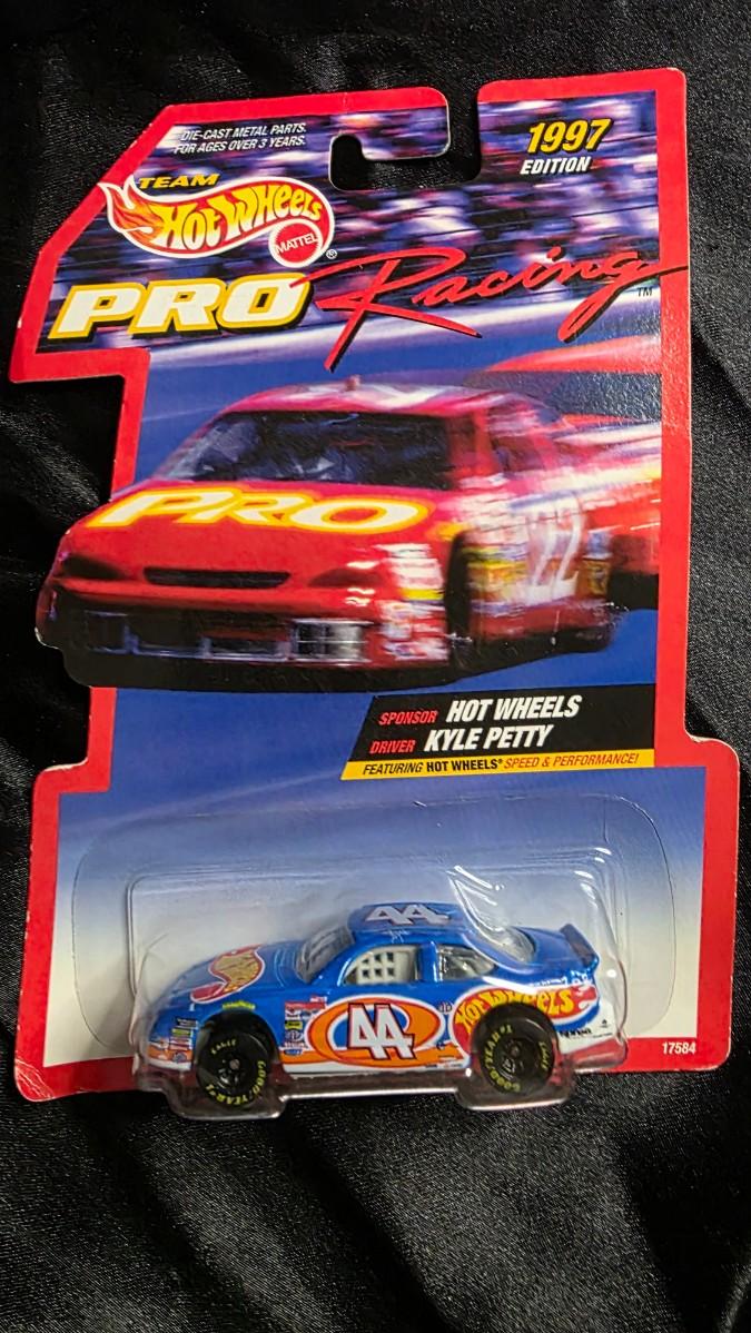 The red package screams from the peg like a starting light at Talladega—this is the ultra-desirable 1997 Hot Wheels Pro Racing Kyle Petty #44 Pontiac in the fiery red-card variant that collectors still chase decades later.