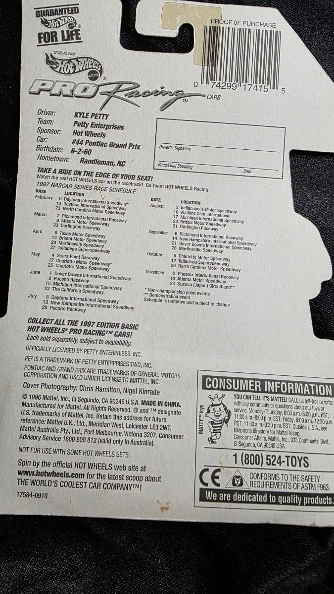 The red package screams from the peg like a starting light at Talladega—this is the ultra-desirable 1997 Hot Wheels Pro Racing Kyle Petty #44 Pontiac in the fiery red-card variant that collectors still chase decades later.