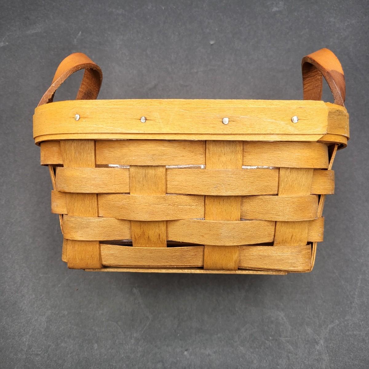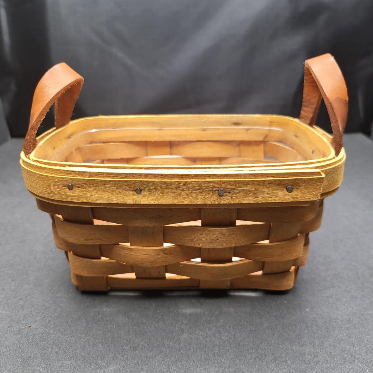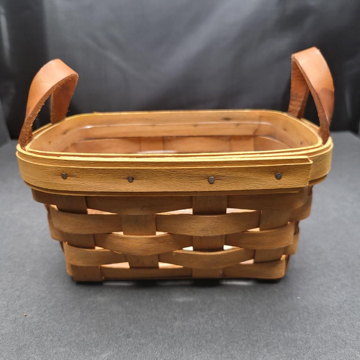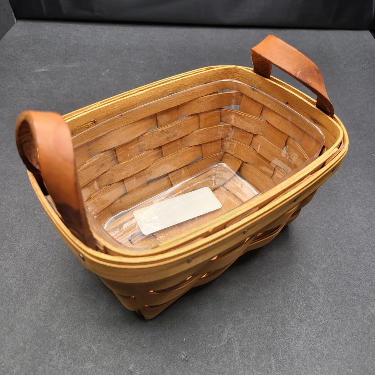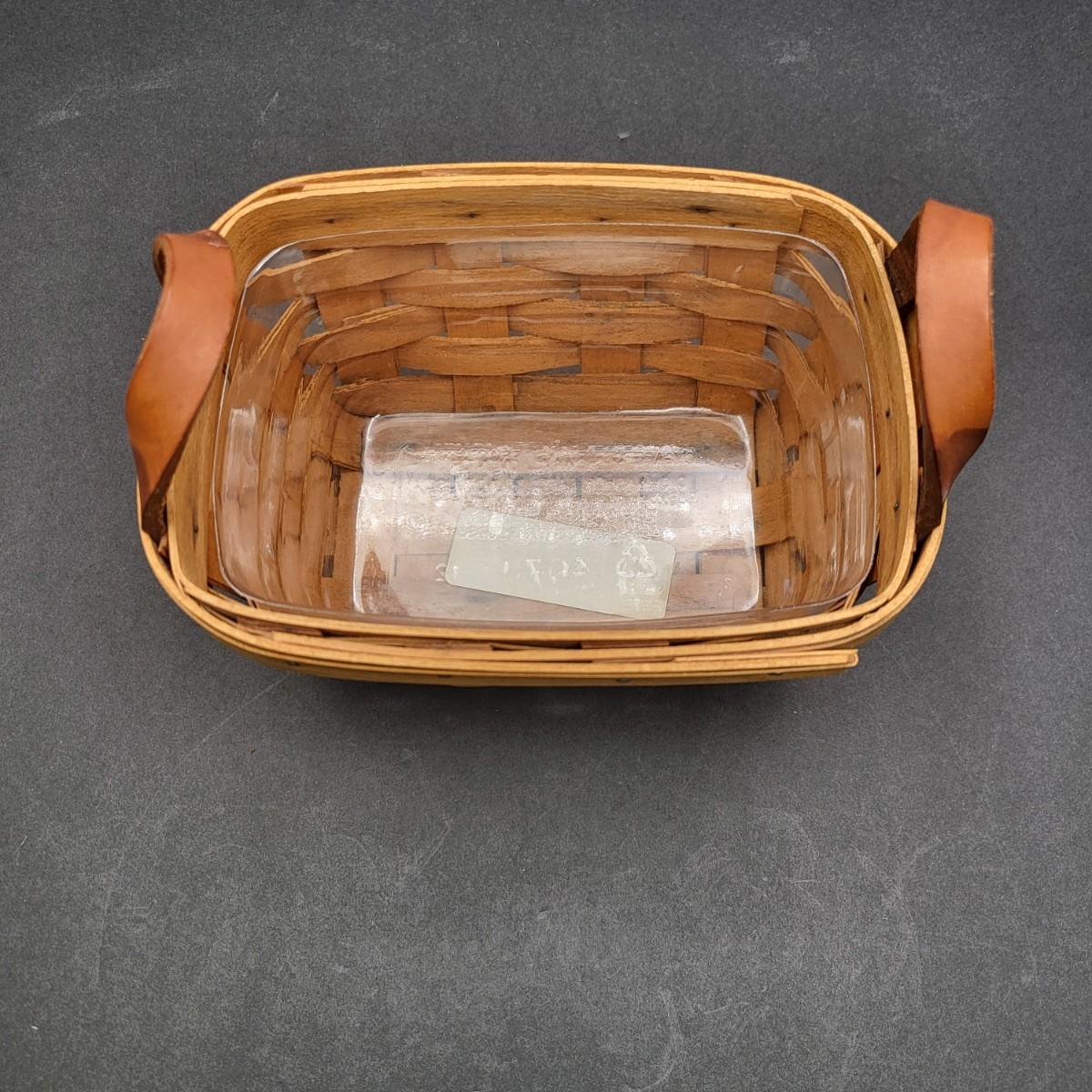 Longaberger hand woven basket with leather handles 6.5" L x 3.5" T x 5" D. Protective plastic insert.