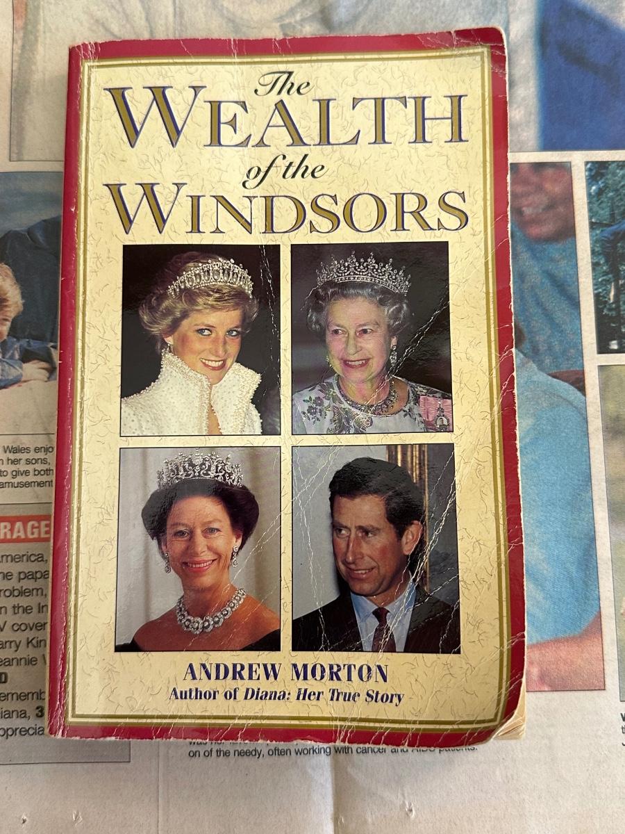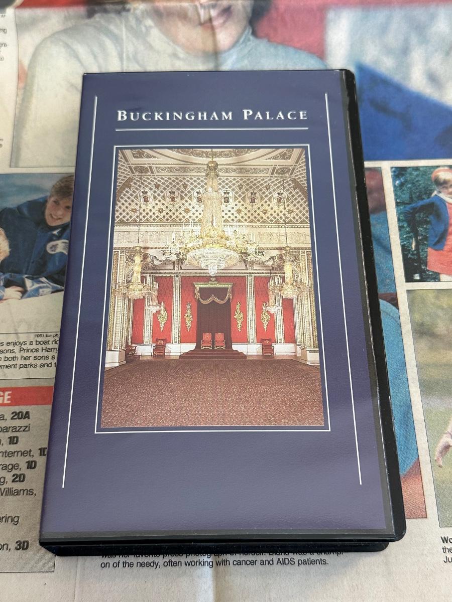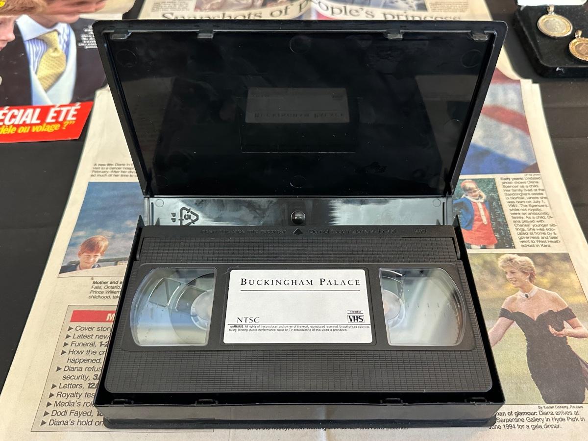 Also includes a magazine cover, a VHS tape titled “Buckingham Palace” and a book called “The Wealth of the Windsors”