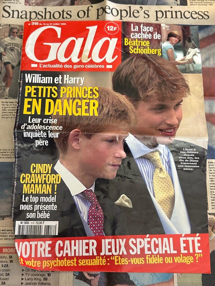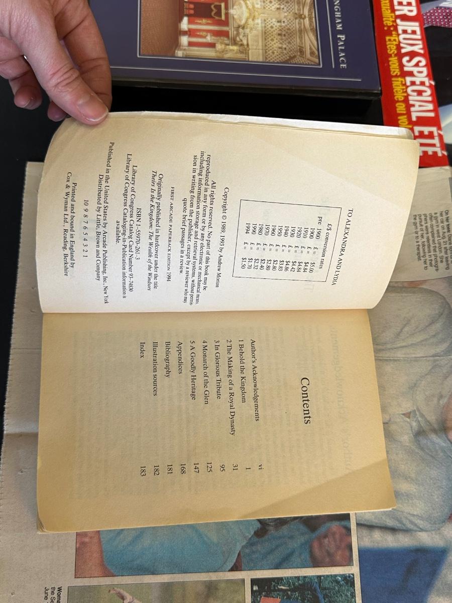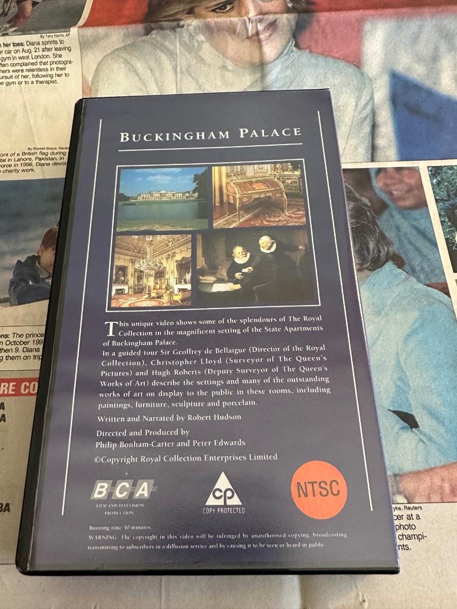 Also includes a magazine cover, a VHS tape titled “Buckingham Palace” and a book called “The Wealth of the Windsors”
