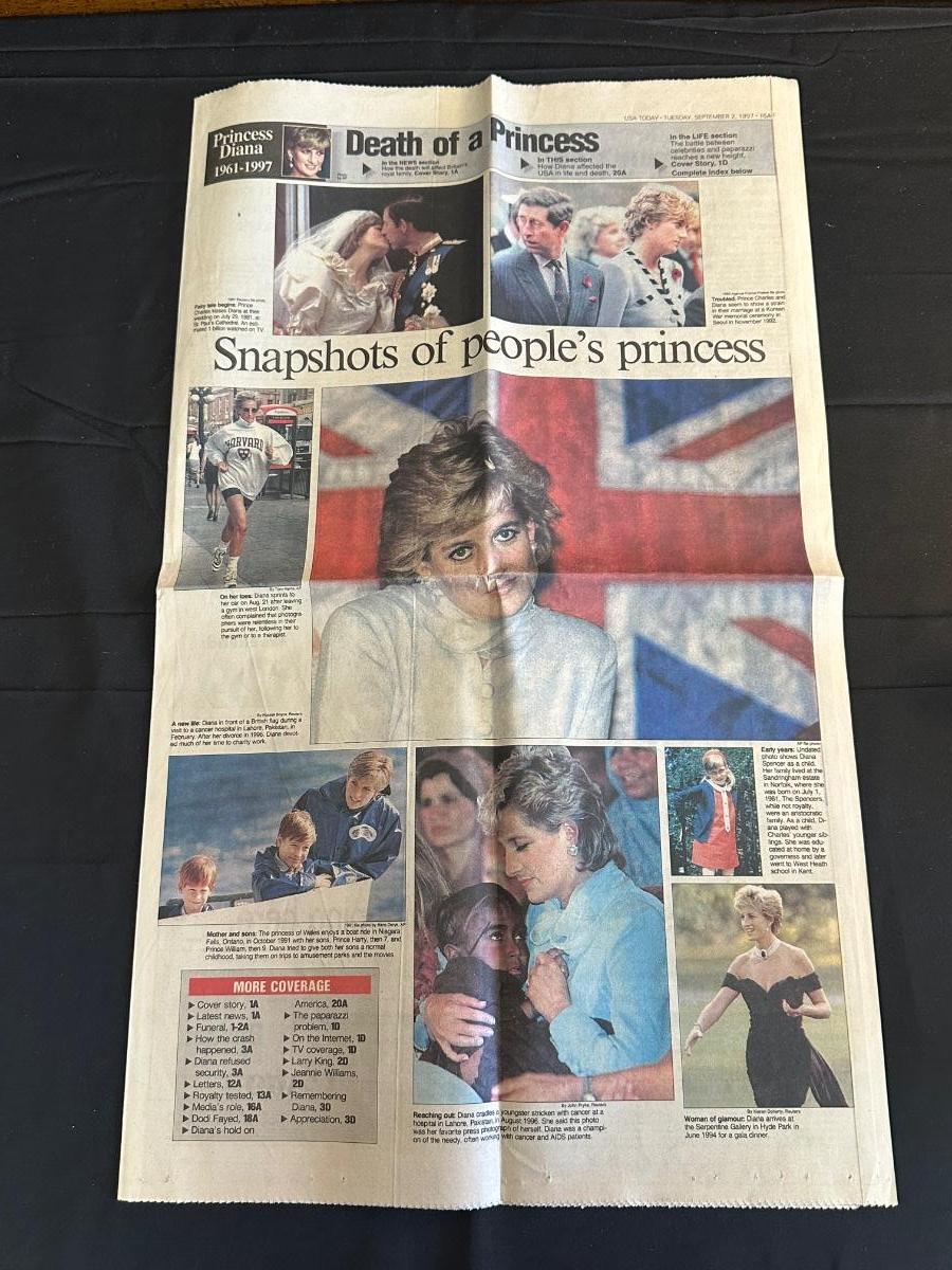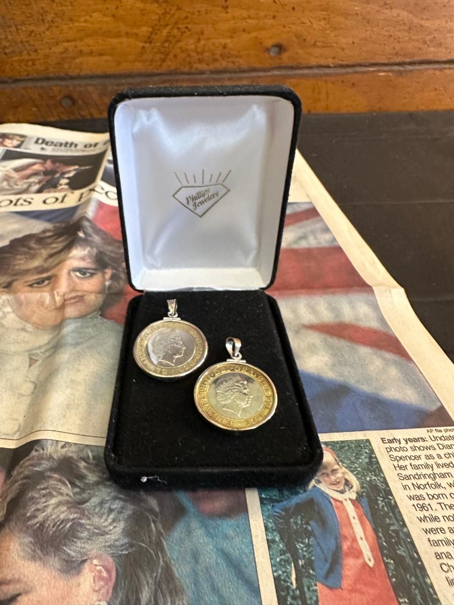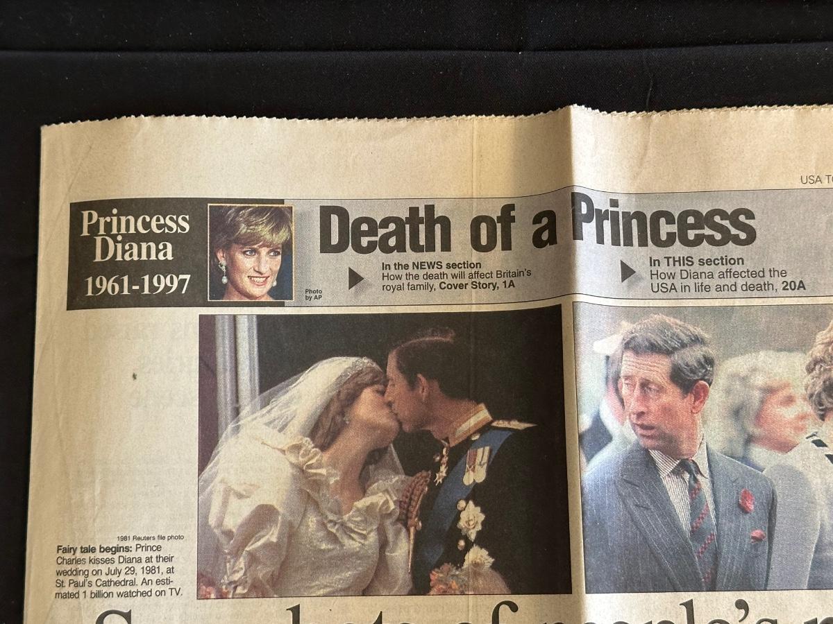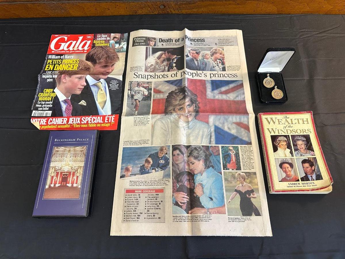 1997 Newspaper Cover Following the Death of Princess Diana, Two Coin Edged Pendants and More Items following the Royal Family