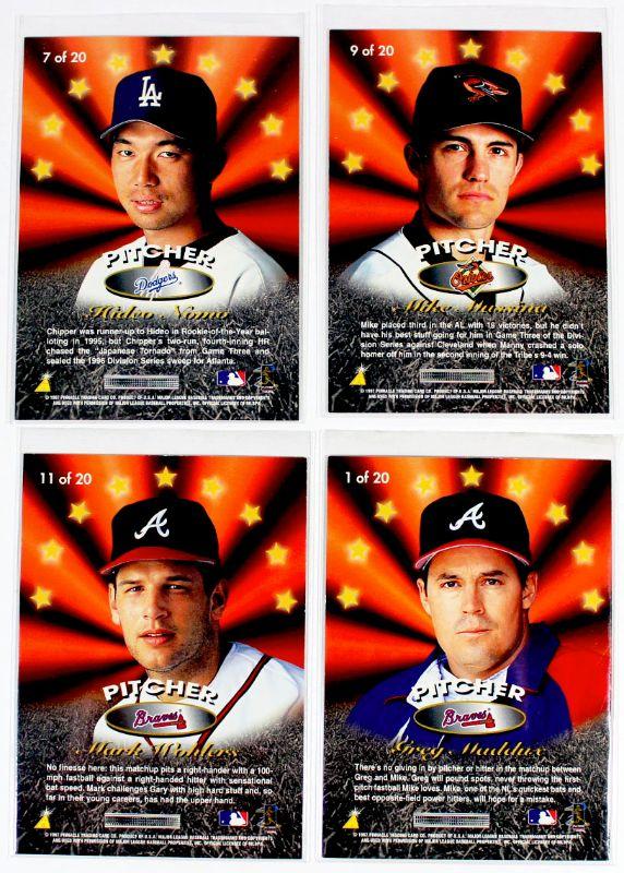 Super RARE Set of 4 1997 Pinnacle Cardfrontation Baseball Cards, each card features 2 Baseball Stars, included are following: #1 - Mike Piazza/Greg Maddux, #7 - Chipper Jones/Hideo Nomo, #9 - Manny Ramirez/Mike Mussina, #11 - Garry Sheffield/Mark Wohlers - All cards in high grade - NM/MT - perfect for official grading - Rare Collector's Item!