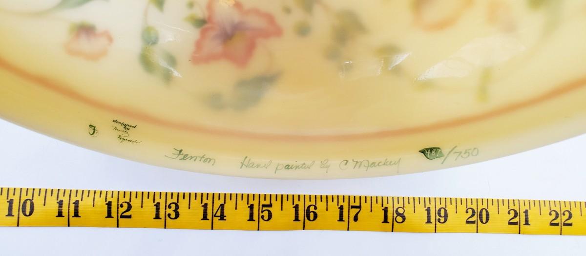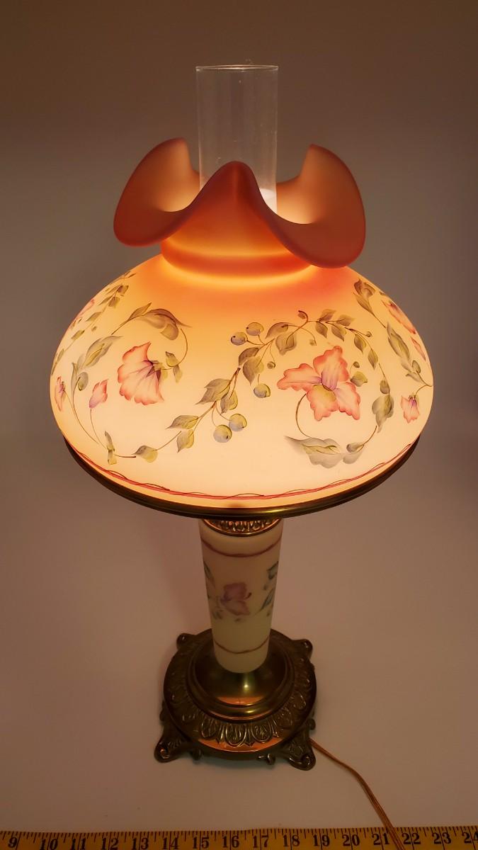 1998 Fenton burmese glass Jacobean hand painted floral table lamp with exclusive tapered cyndrical burmese stem shroud and decorative metal base is absolutely gorgeous and in working condition, approximately 23in tall. Hand painted and signed by C Mackey, designed by Martha Reynolds, #487/750. The top cover does have a few very small chips near the rim, please see photo....This lamp is in very good condition otherwise.