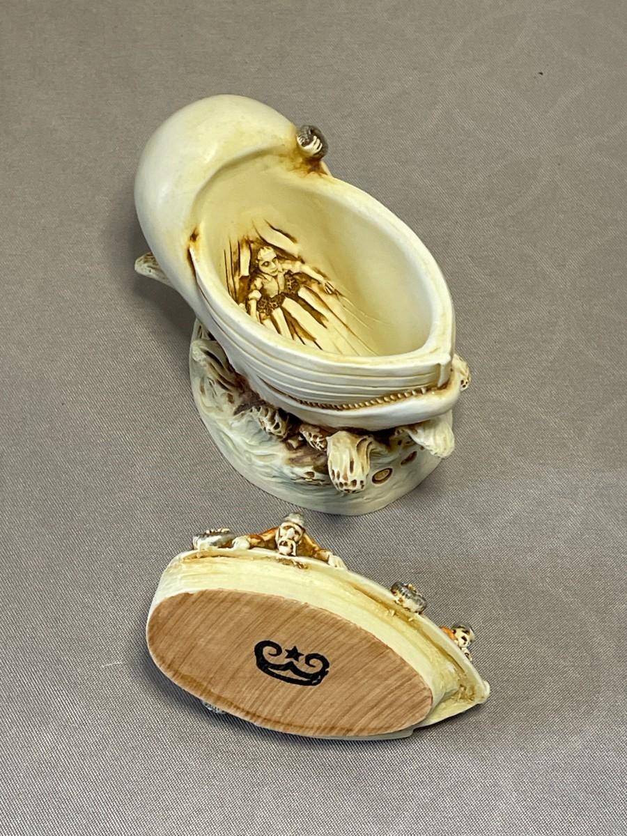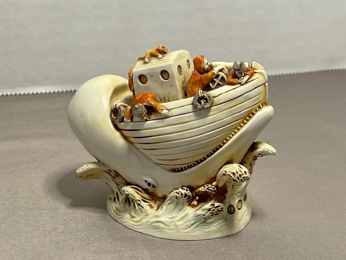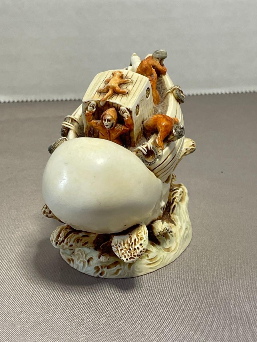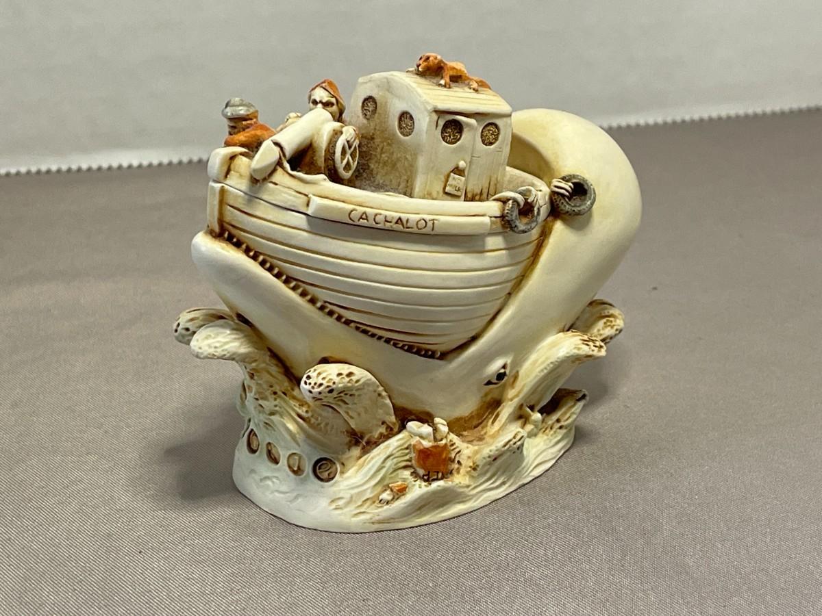 This figurine is in excellent condition and was made in England. The ship and the figurine are both named Catch A Lot and it is about 3 inches long by 2.25 inches tall.