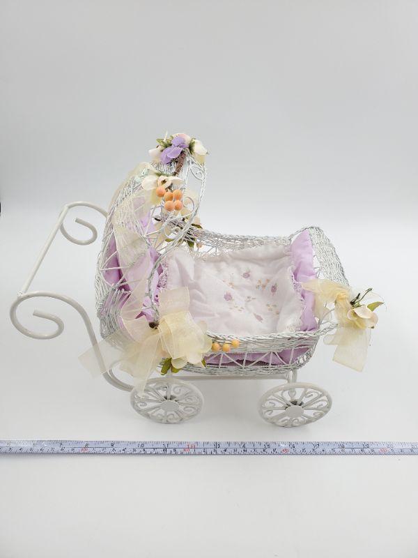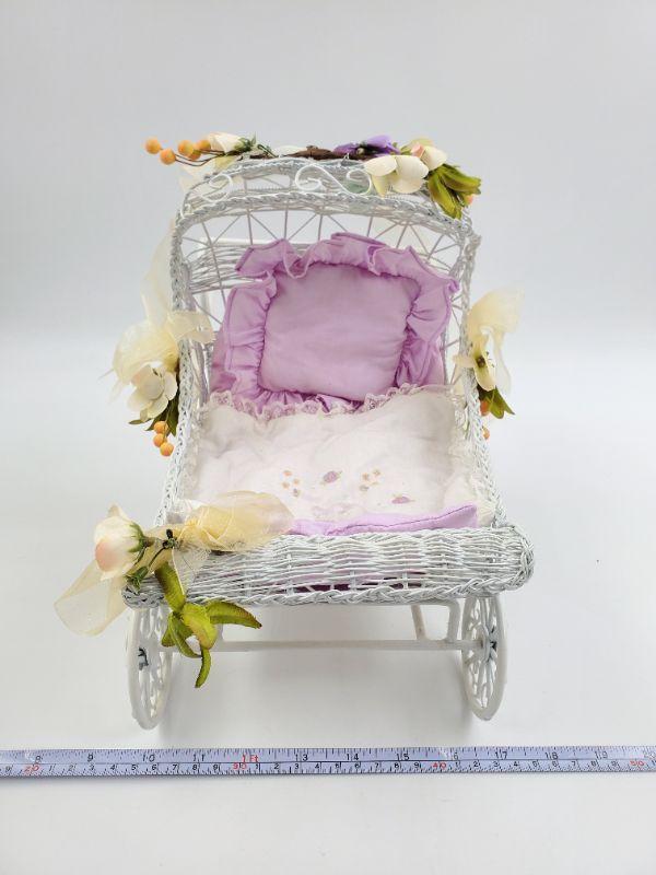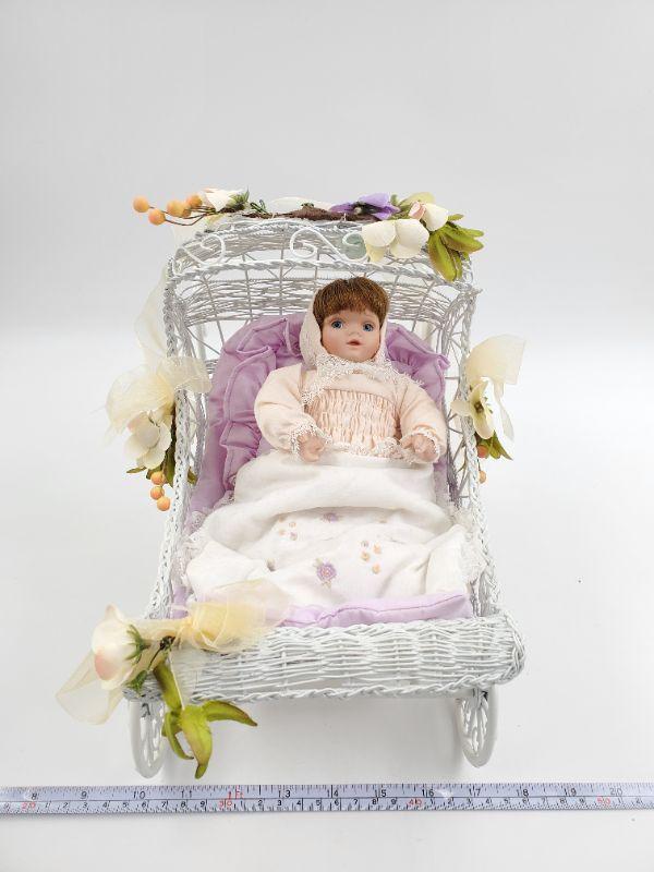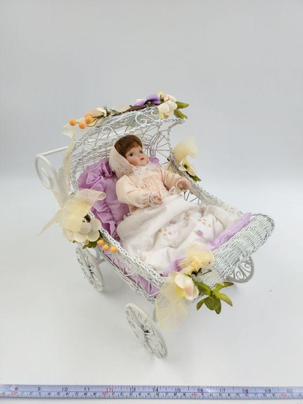 Spring has sprung with this Ashton Drake doll and carriage. Wicker inspired carriage is metal, good condition. Hand painted porcelain doll good condition.