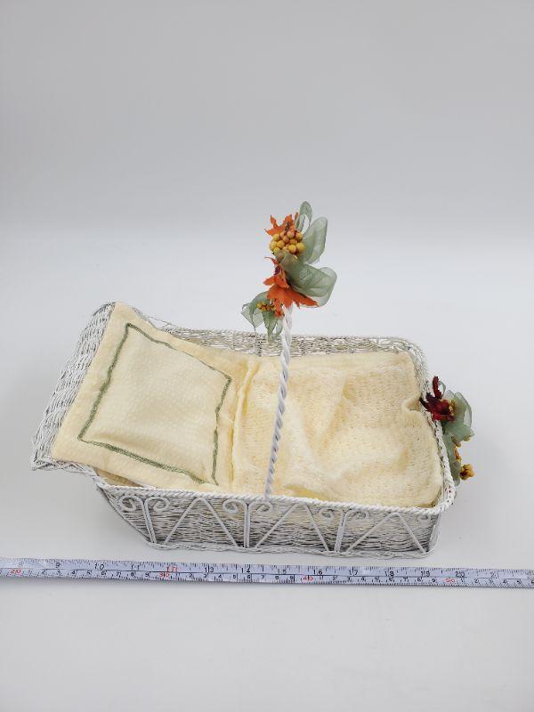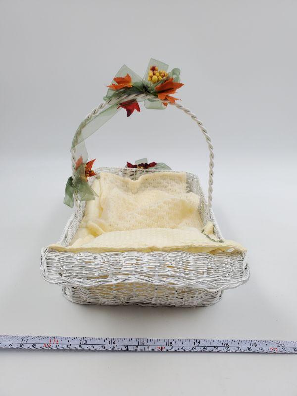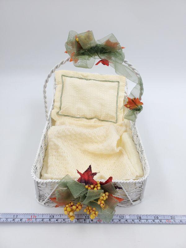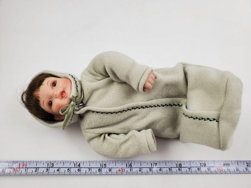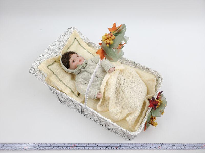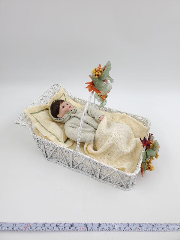 Wicker inspired metal basket type bassinet cradles this adorable Ashton Drake Galleries porcelain doll, numbered on neck. All in good condition.