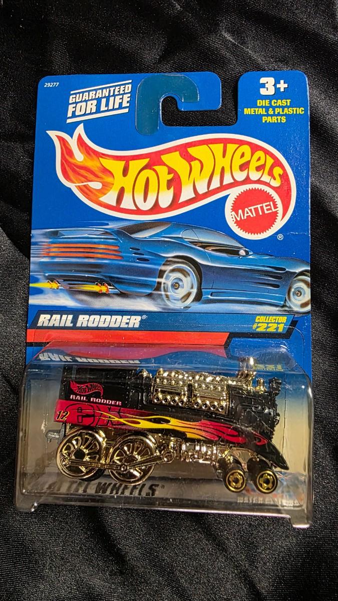 The whistle screams and the rails tremble as the wildest Hot Wheels fantasy machine of 1999 thunders into view: the Rail Rodder, collector #221, a steam-punk fever dream where Victorian locomotive meets flame-licked street rod.