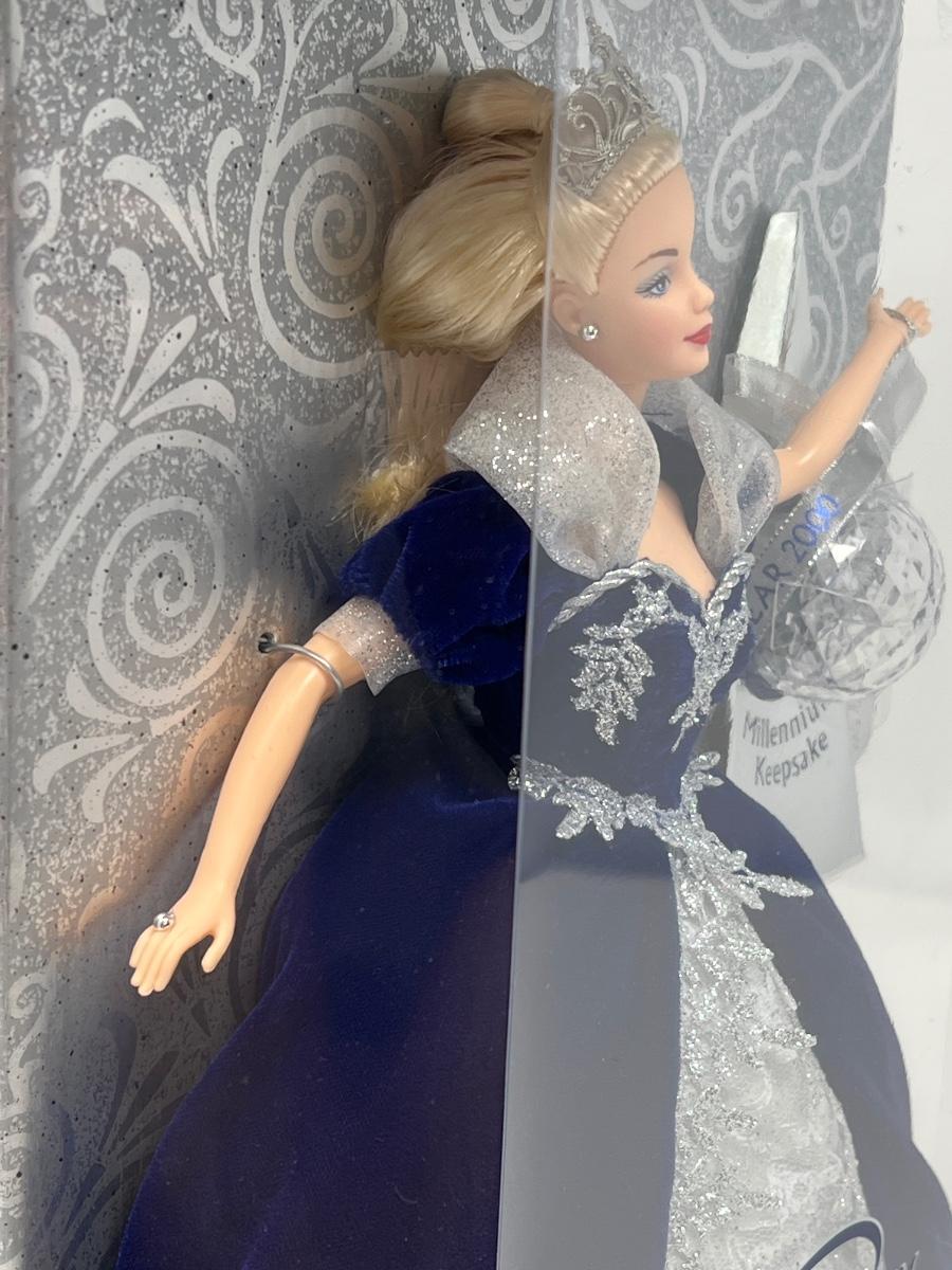 Blonde hair, white millennial Barbie wearing a royal dark blue velveteen and sparkling, silver lace/tule ball dress. Millennial 2000 acrylic ball ornament keepsake. In box mever opened.