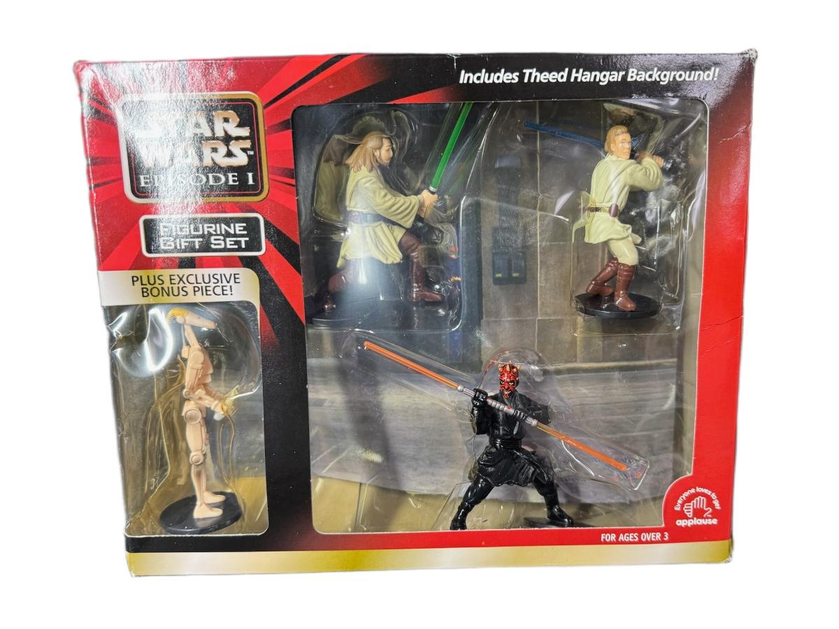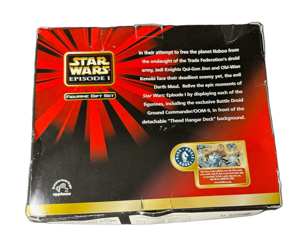 Figures include Qui-Gon Jinn, Obi-Wan-Kenobi, and Darth Maul. Also includes an exclusive bonus piece, a battle droid. The box shows some storage related wear. Pre-auction estimate: $25-$50. [CS]