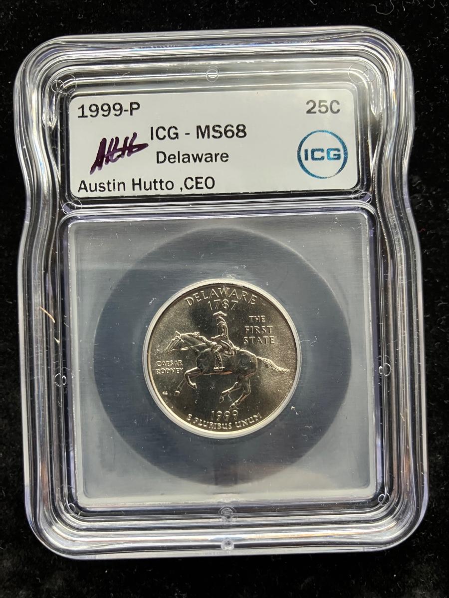 1999-P Delaware State Quarter - ICG MS68 - Austin Hutto CEO Signature Slab - Superb Gem First State Quarter!