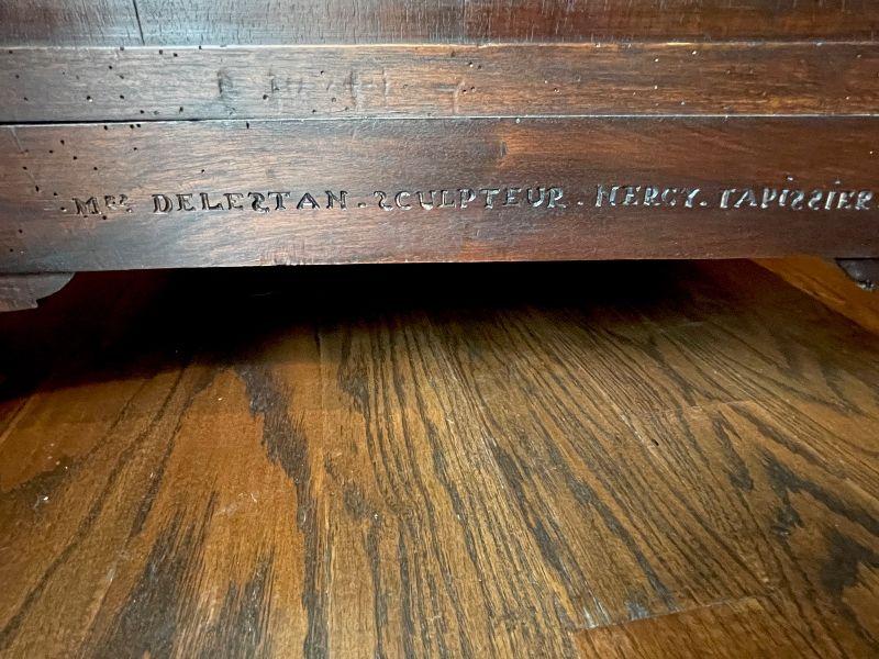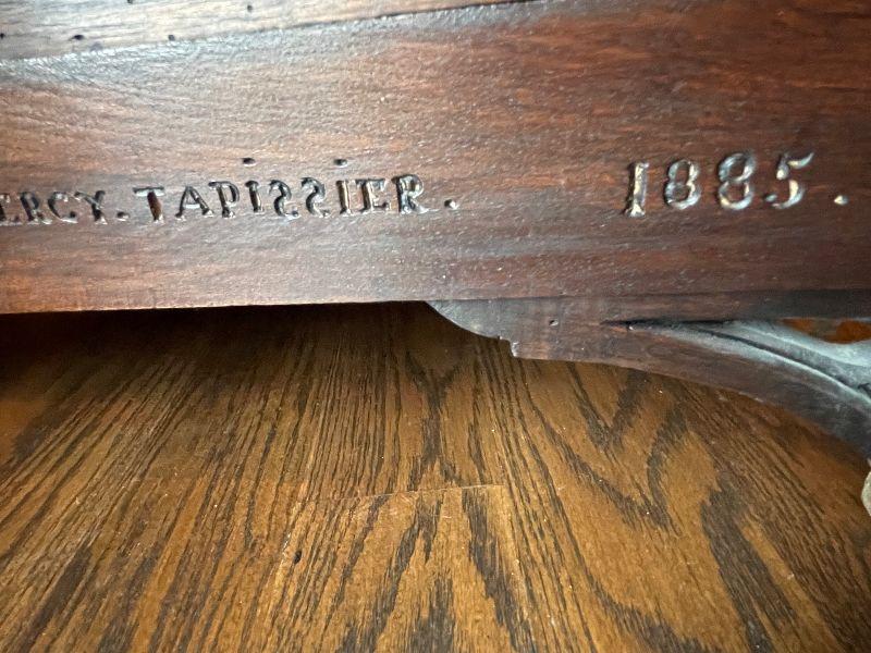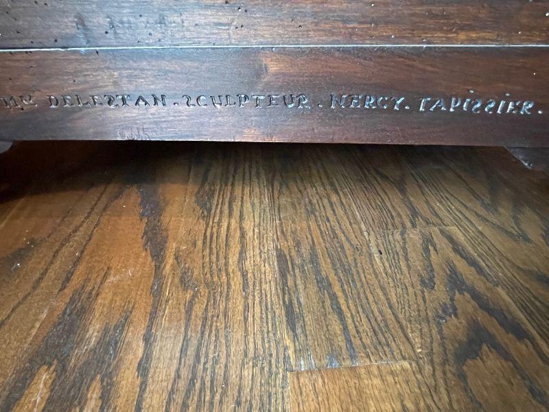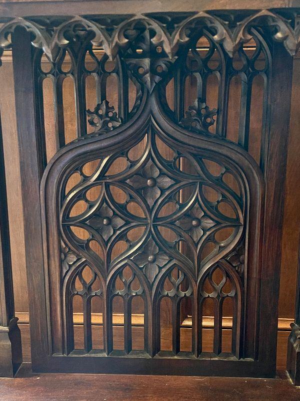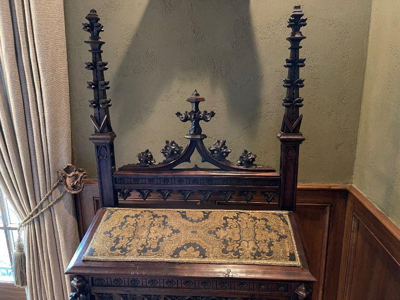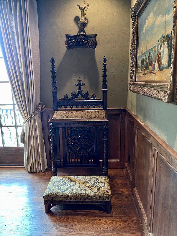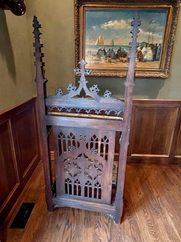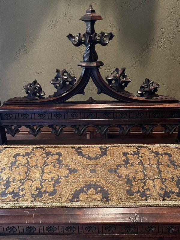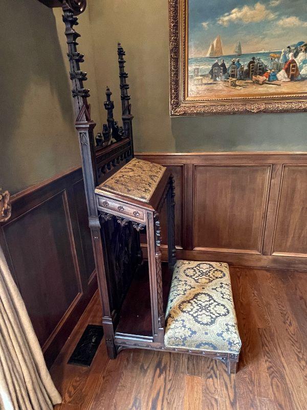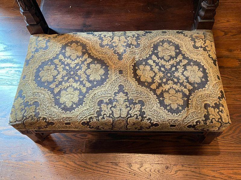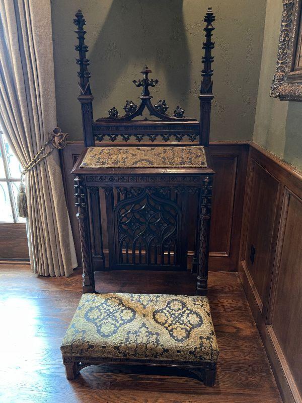 The subject item is a French Gothic Style Prie Dieu (prayer bench), a piece of worshiping furniture for use during prayer, consisting of a kneeling surface, and a narrow upright front with a rest for elbows or for books, all framed with carved architectural style spires and crowned with a carved votive cross. Appropriate vintage upholstery covers the knee and elbow/book rest. In good structural condition.