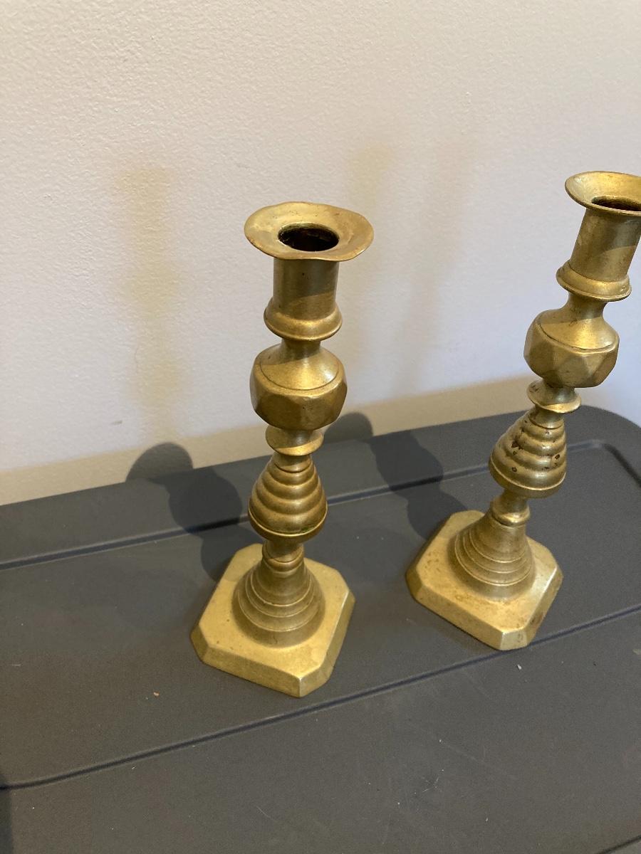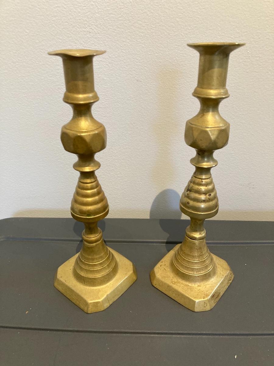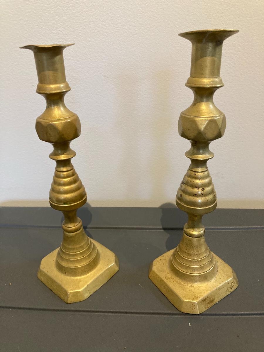 19th century Brass Beehice and Diamond Candleholders 11.5”