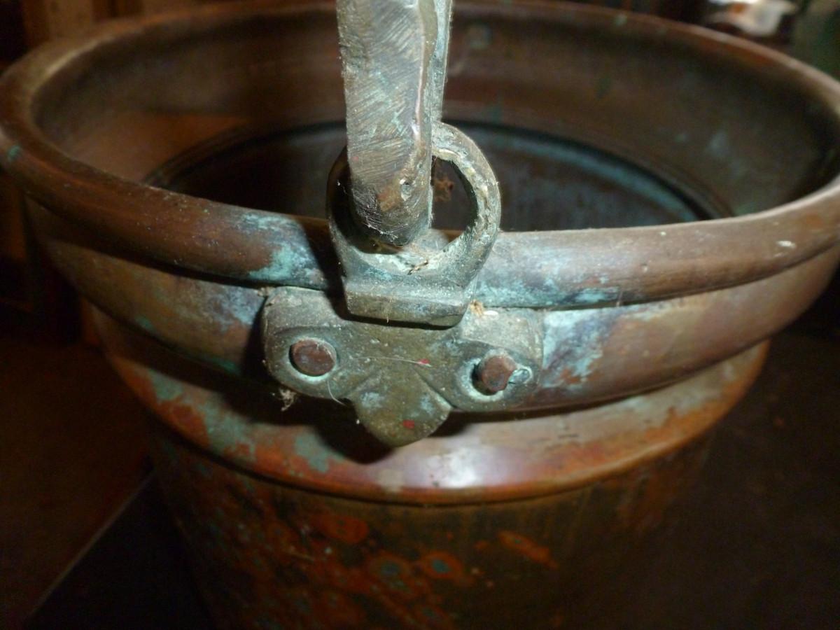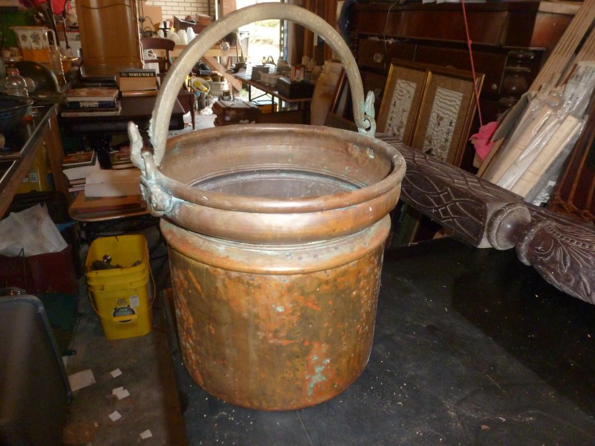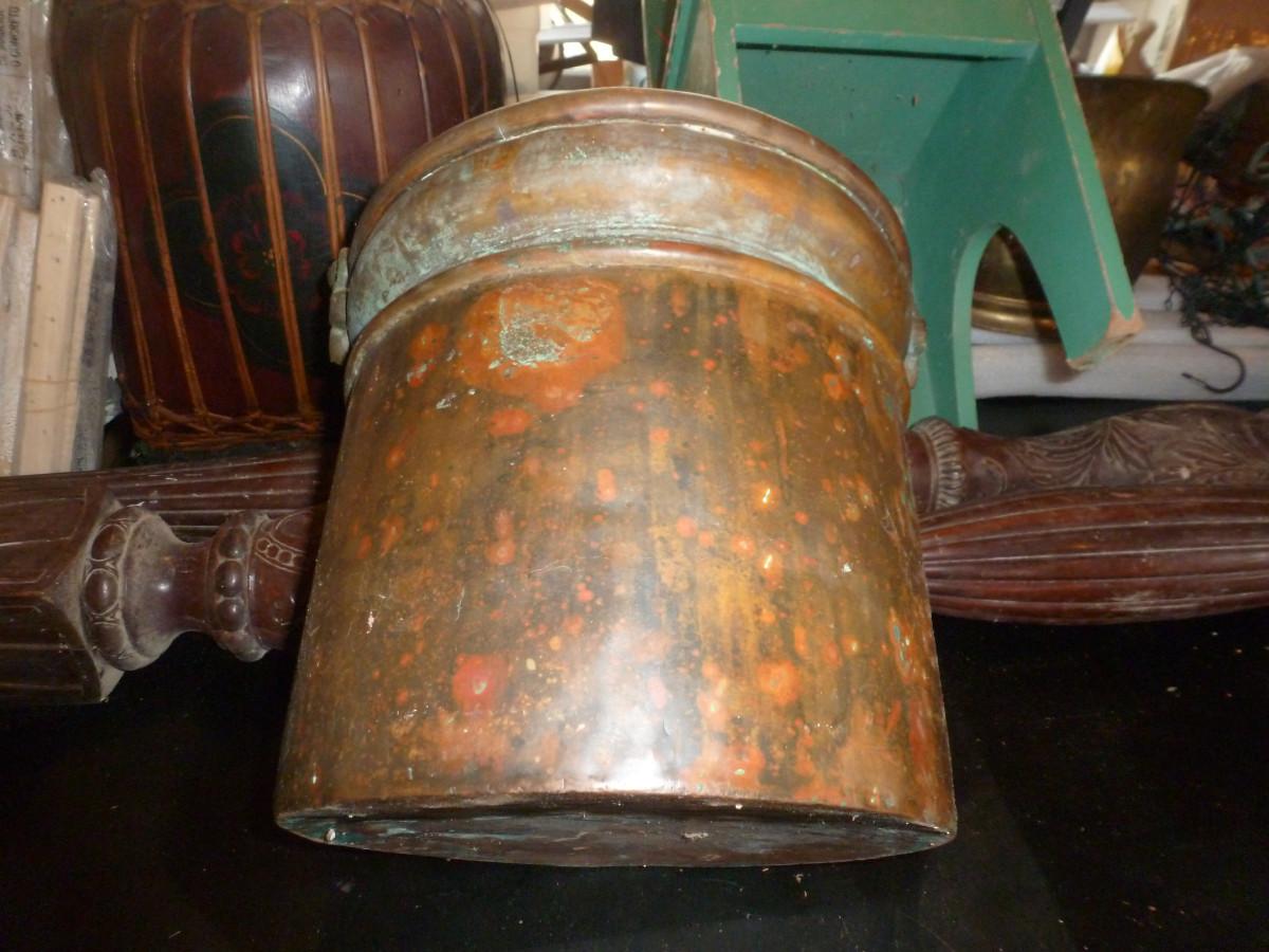 19th Century Fireman's Copper Water Bucket. Measures approx 11" tall, 11" in diameter.