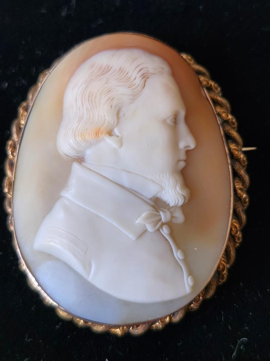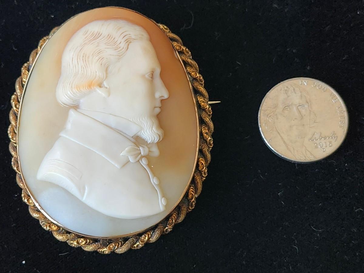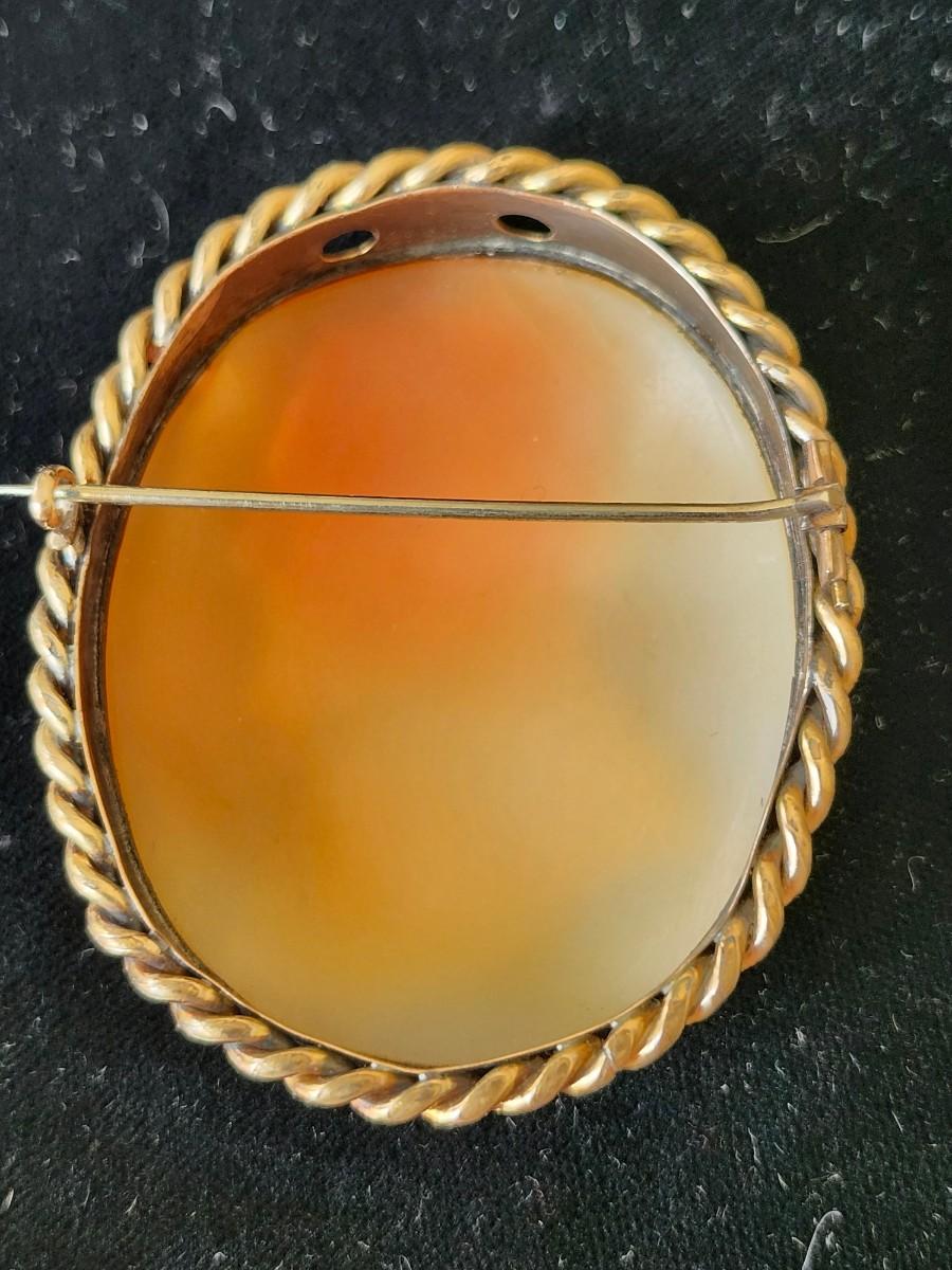 points to a renowned carver, not identified. The cameo is set in 14K gold frame, with 10k gold or gold plate braiding. Victorian or Edwardian era.