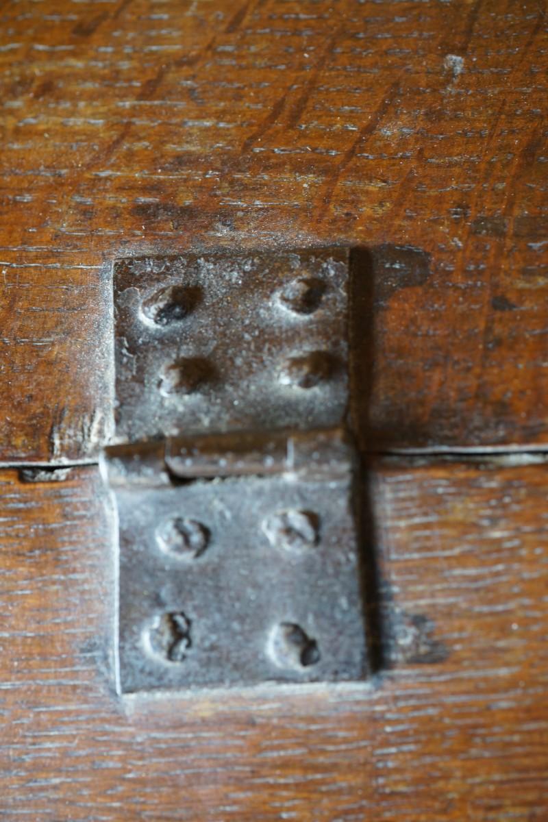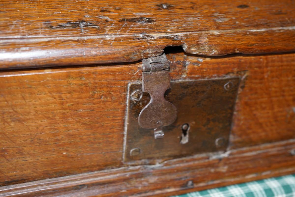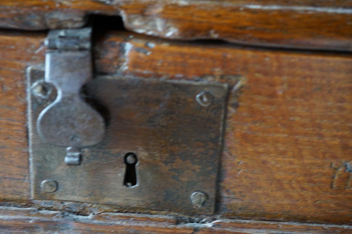 construction includes" rose cut top nails" slight grain paint on the sides. hand forged lock and latch. good condition. The top has scratches and some staining.