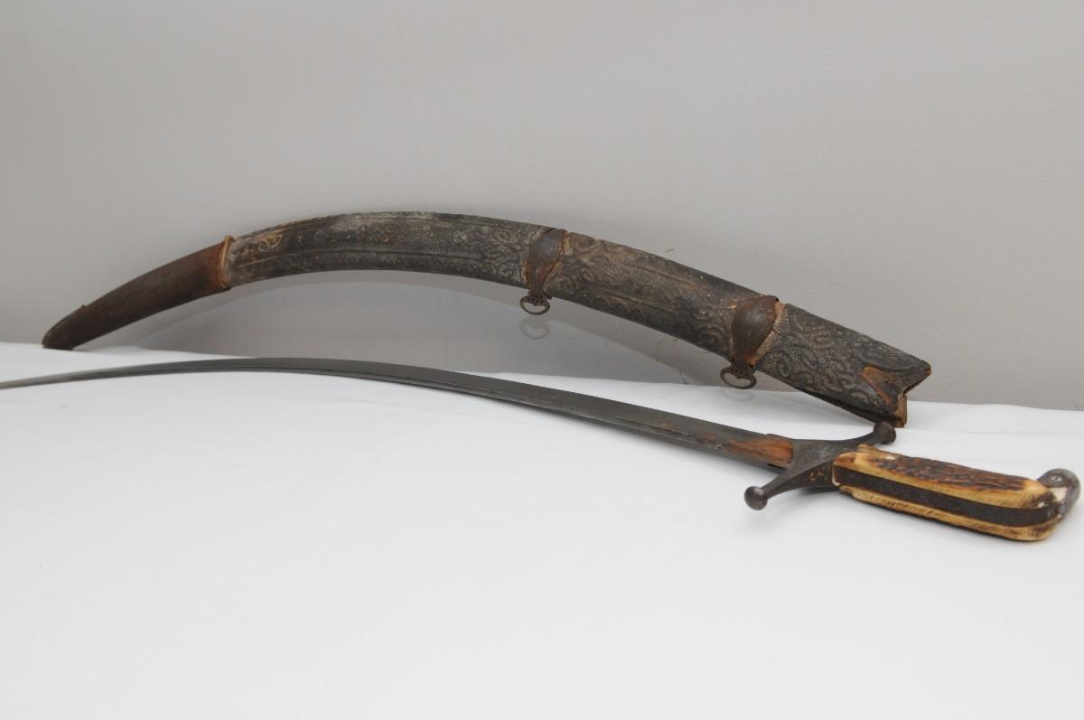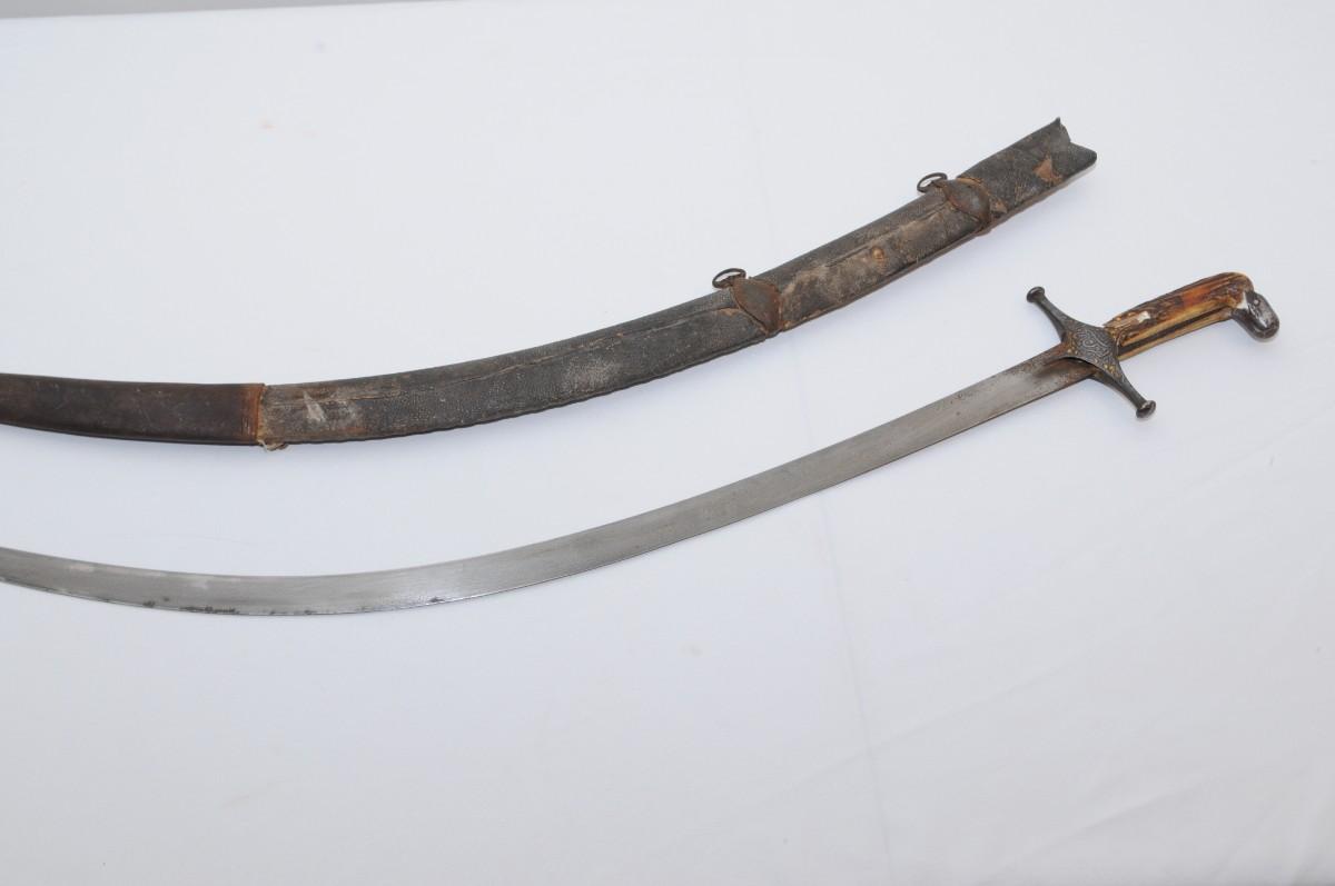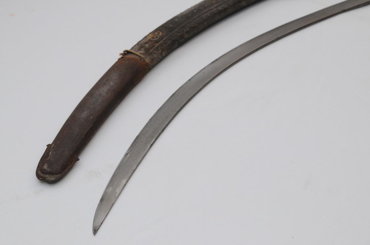 35" Handle - Point 1" wide. Condition: Blade is good, some rust and some pattern on blade that is faded and some pitting. Scabbard has 2 carrying rings made of leather and steel is rusted.