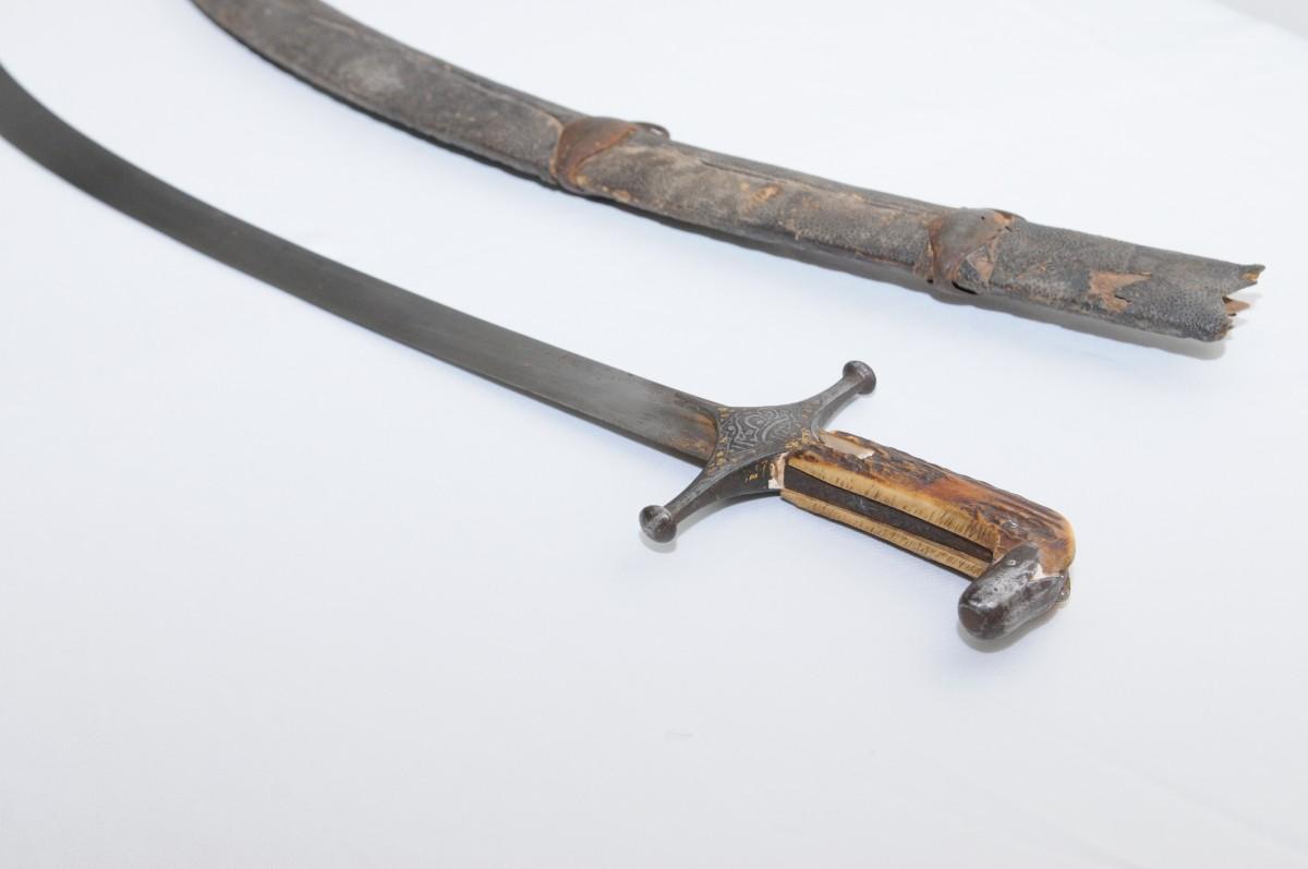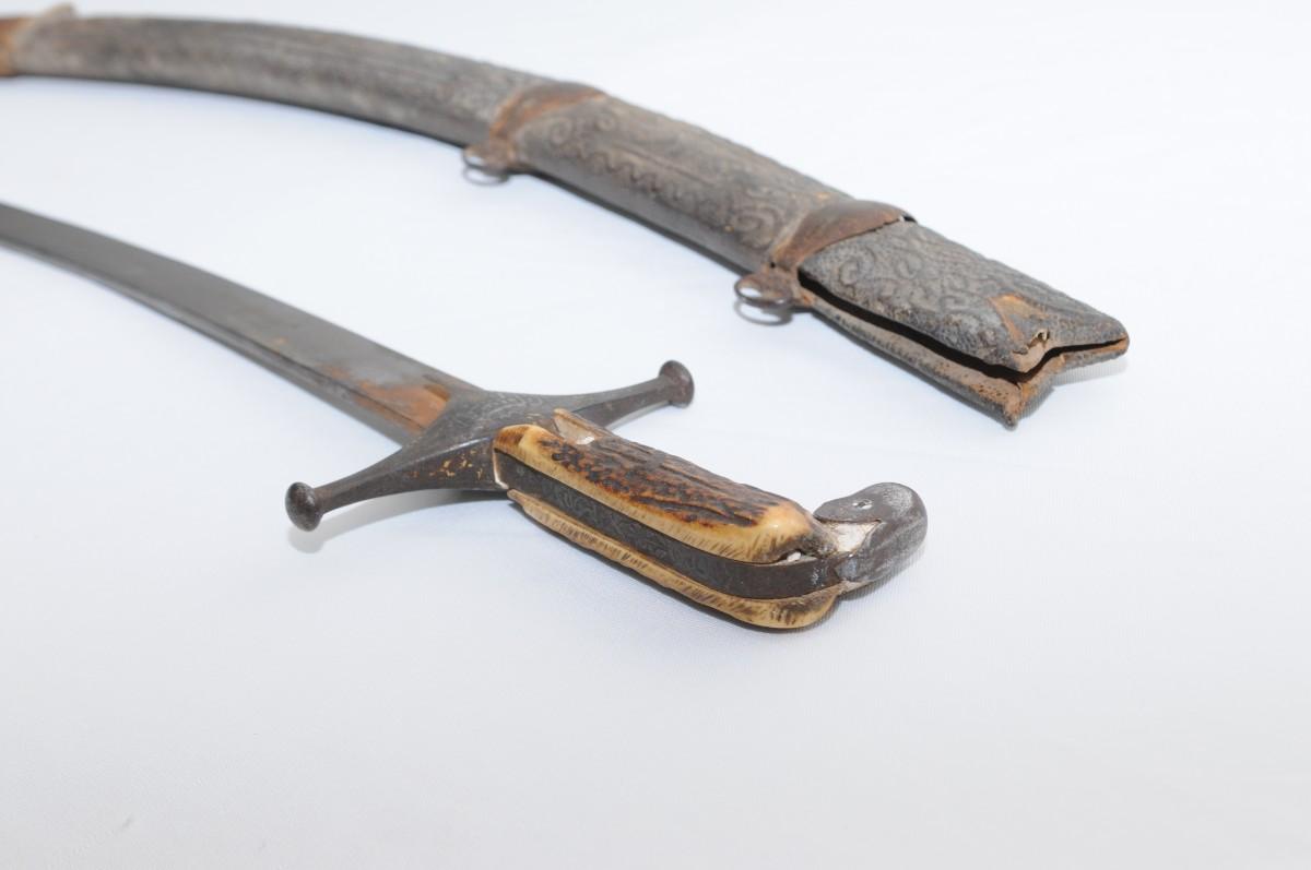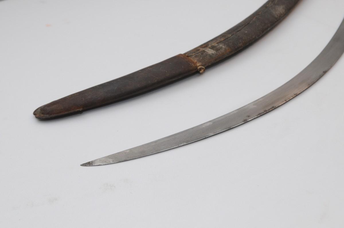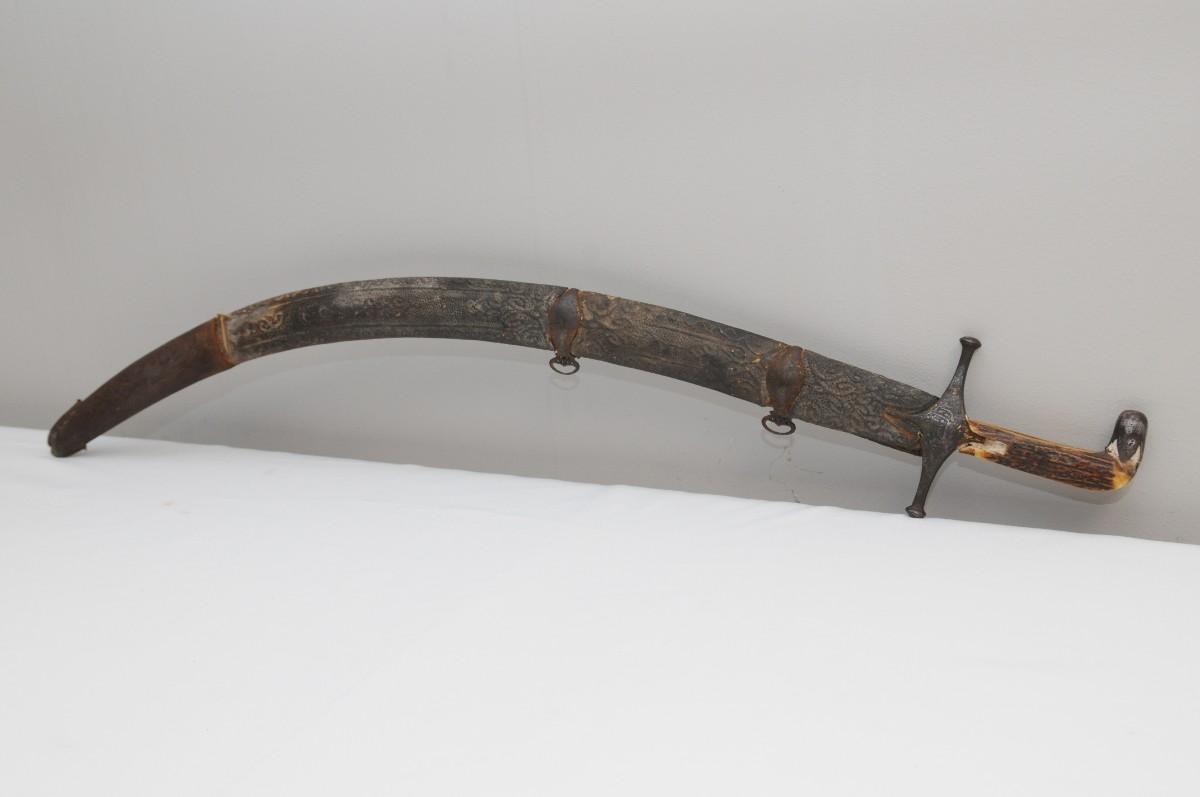 35" Handle - Point 1" wide. Condition: Blade is good, some rust and some pattern on blade that is faded and some pitting. Scabbard has 2 carrying rings made of leather and steel is rusted.