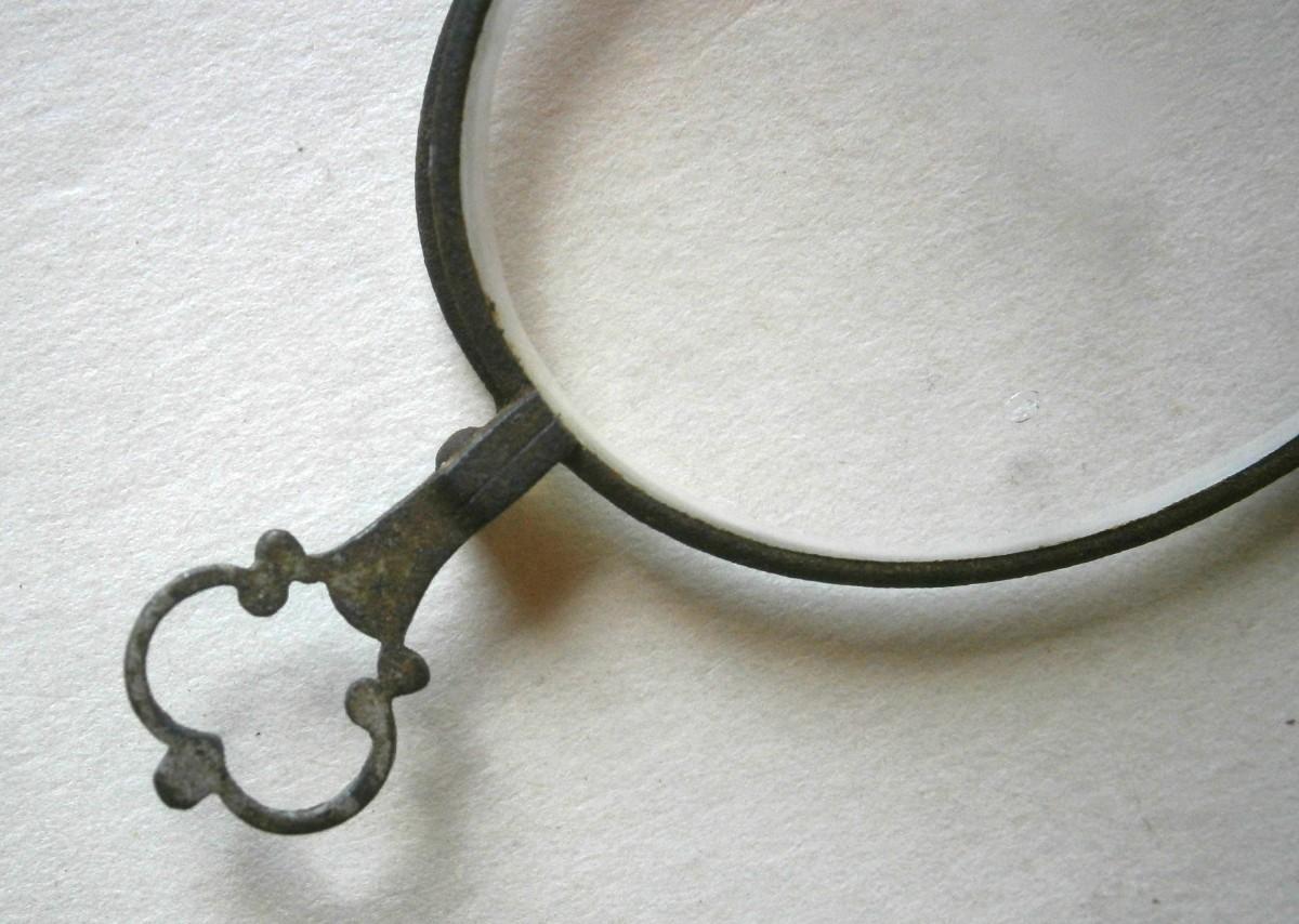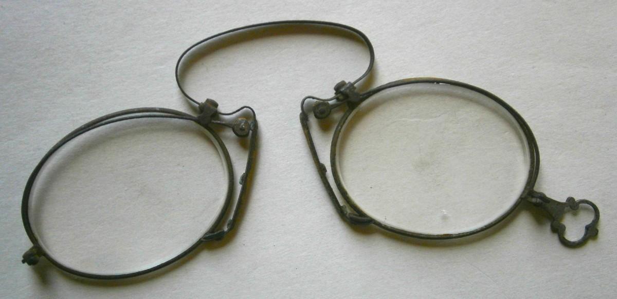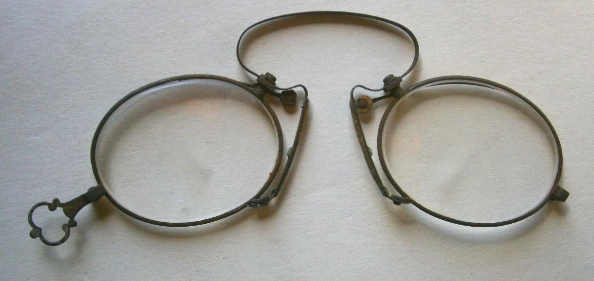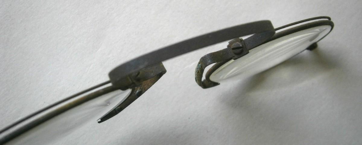 19th Century PInz Nez Glasses, 4 1/4 in. wide, metal frames, magnifying lenses, have extra spring around lenses.