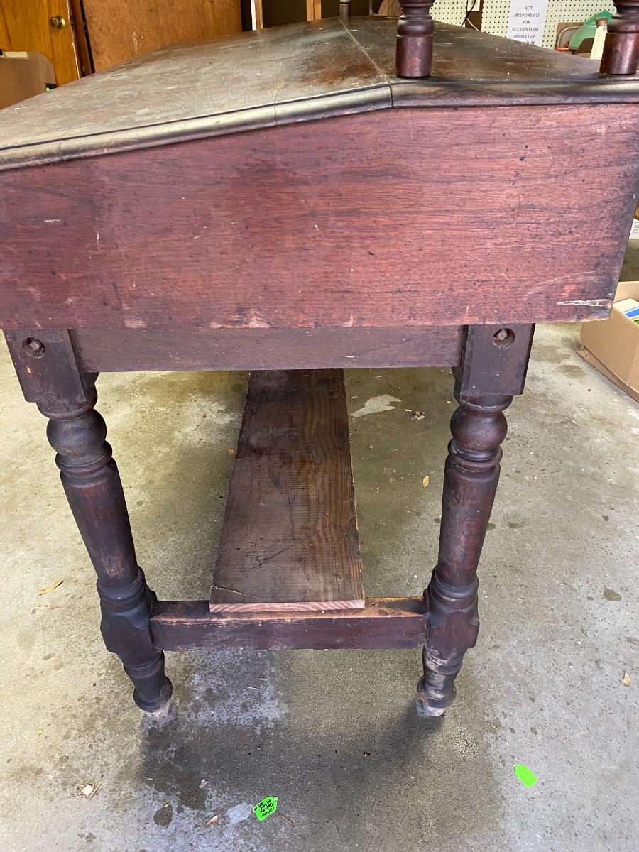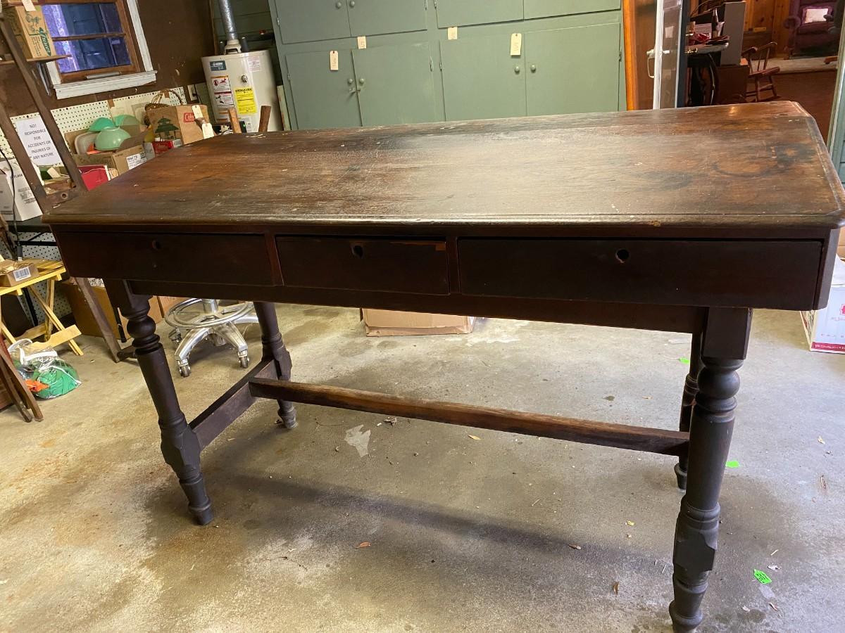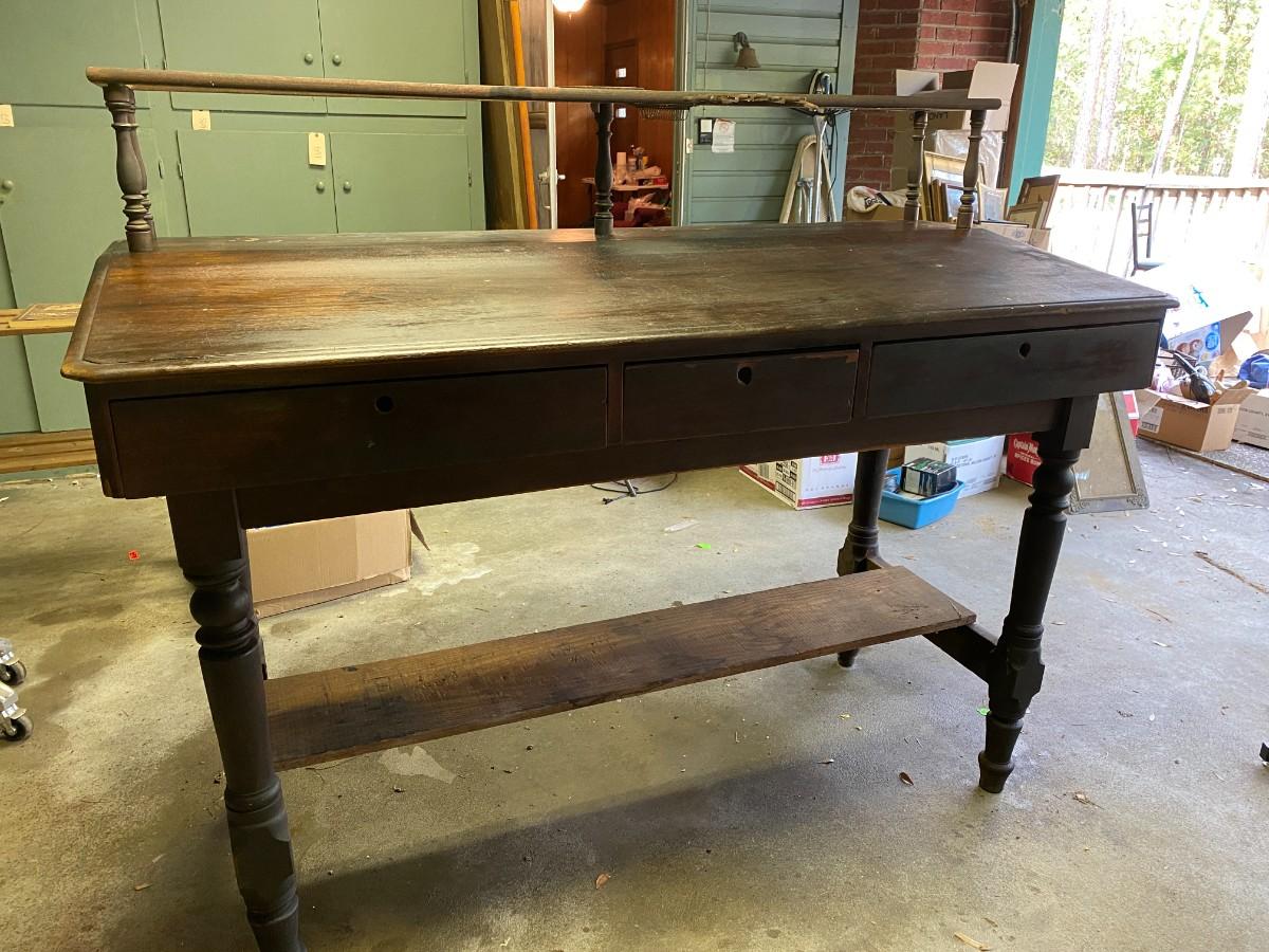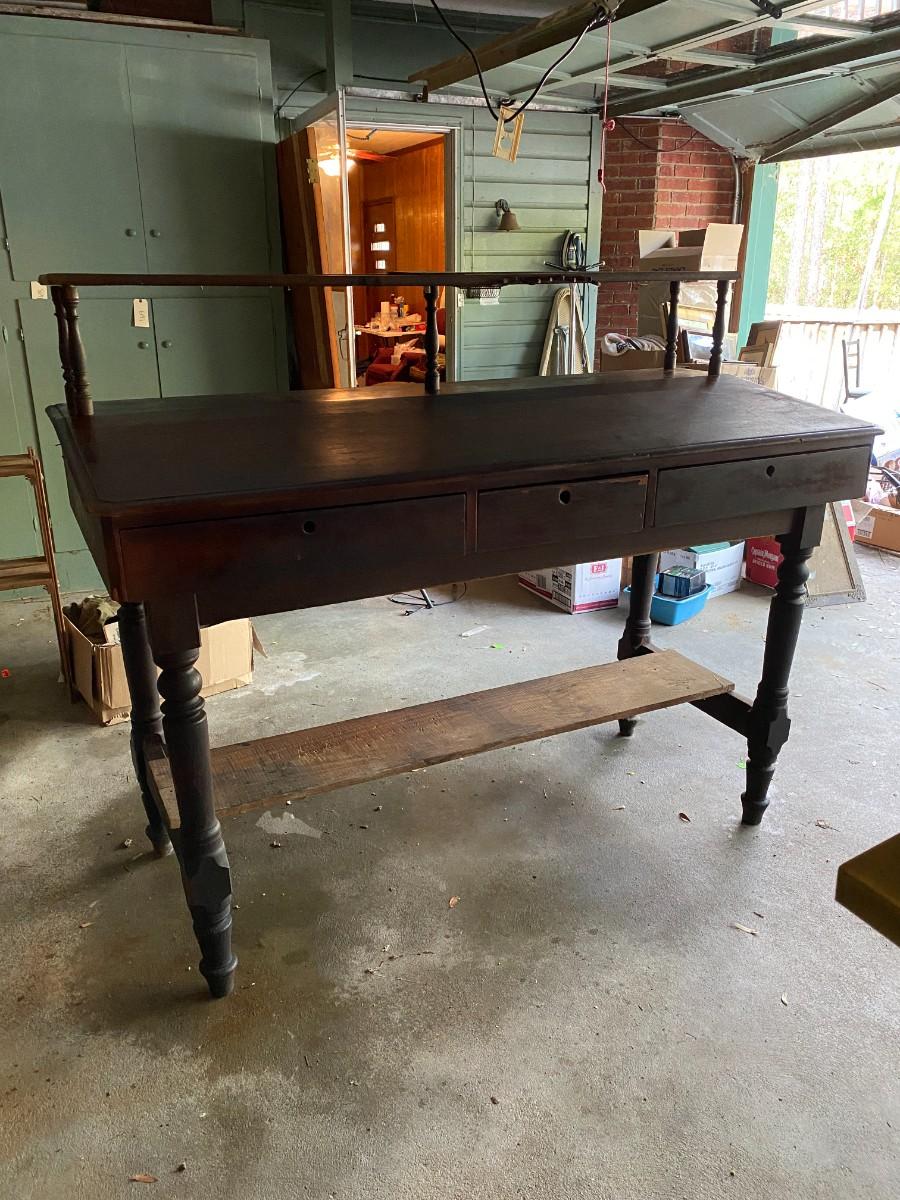 LOT 190 Early southern Plantation Desk Easy to Move, Top is separate from base, Mixed Woods, Poplar Drawer Bottoms, Possible Mahogany Top, 3 Drawers 72wx32dx47t w/o shelf 58 tall w/ Shelf