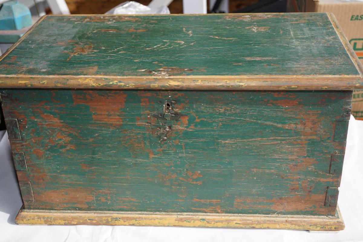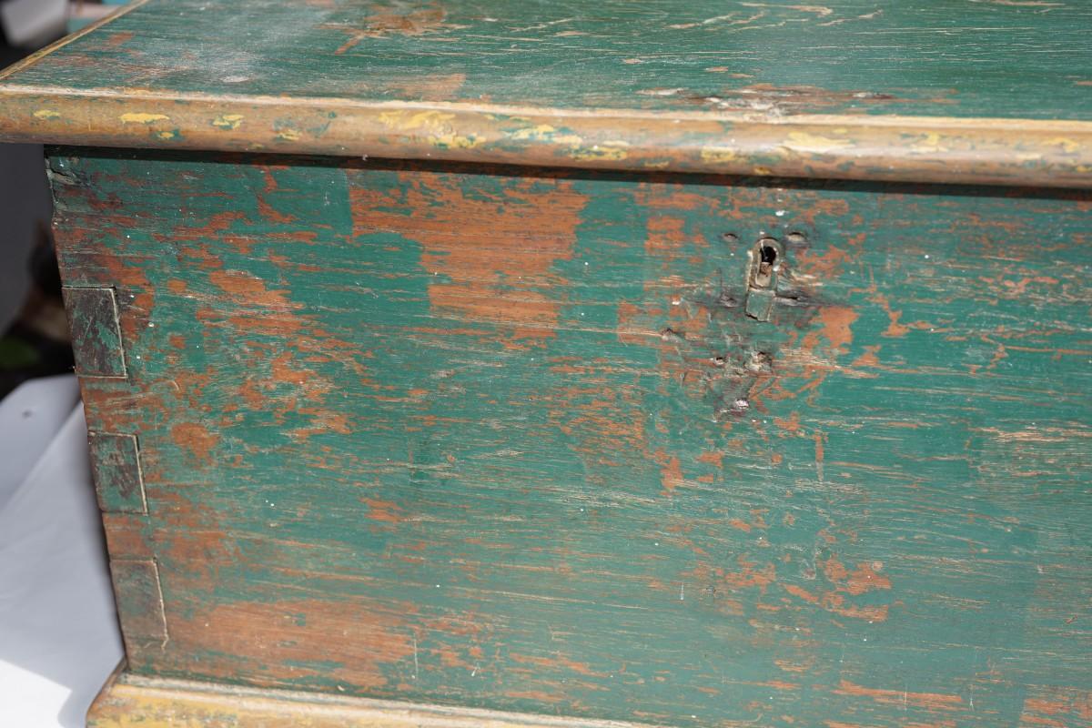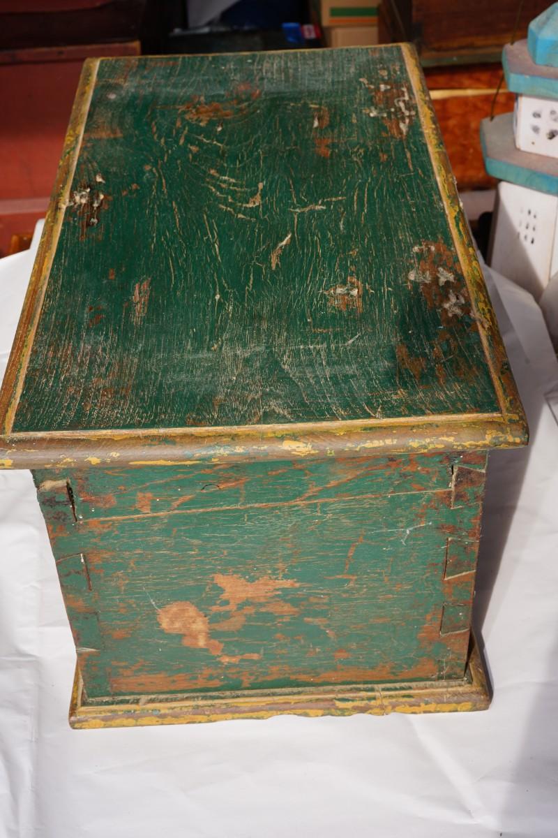 this is a cutie ! painted green primitive storage chest. What did it hold in the travels of the early days. Hand made. Length: 23" Height: 11" Width : 12 1/2"