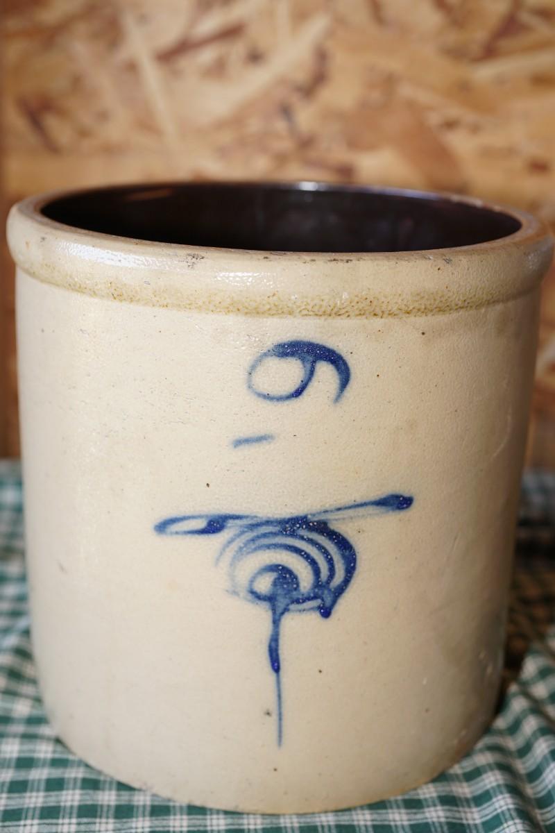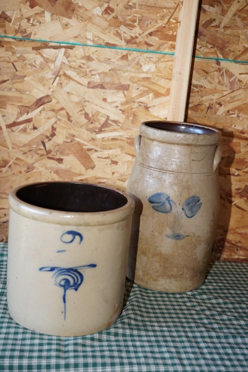 the 2 ? gallon crock is salt glaze with bee sting blue decoration / side 6? decoration with brown interior. This crock is 10" in height. small chip lower back rim. see photos.