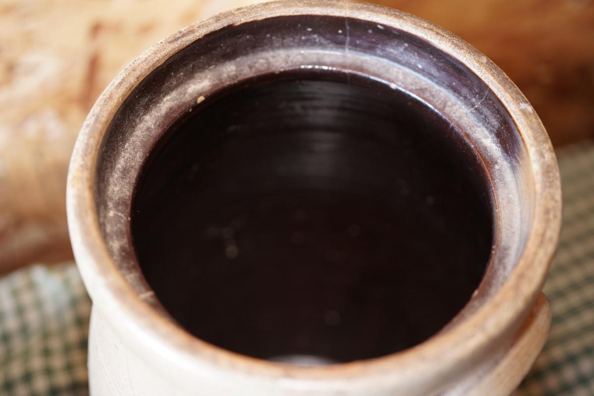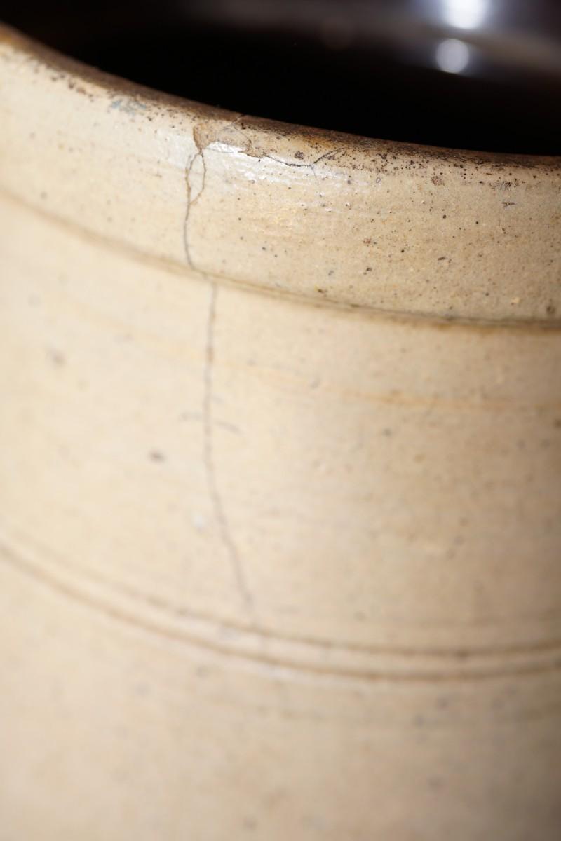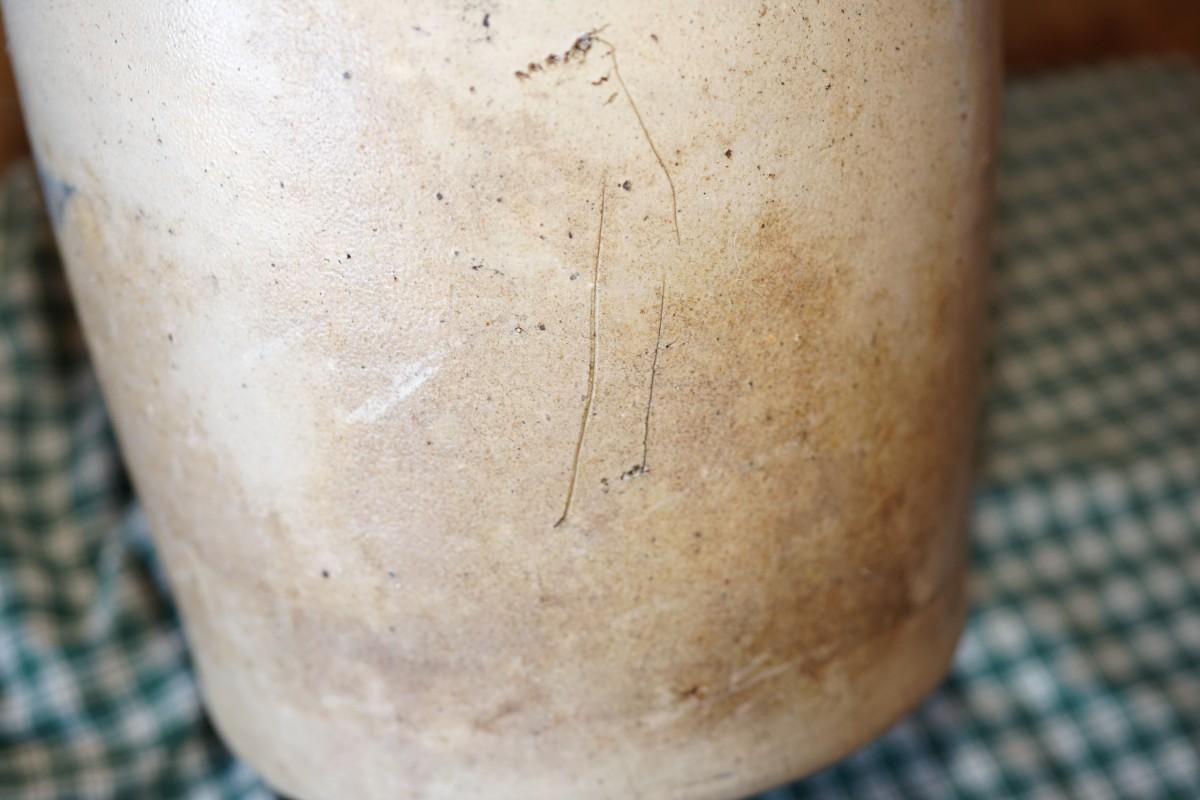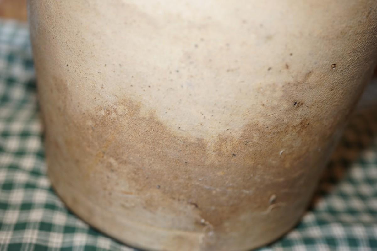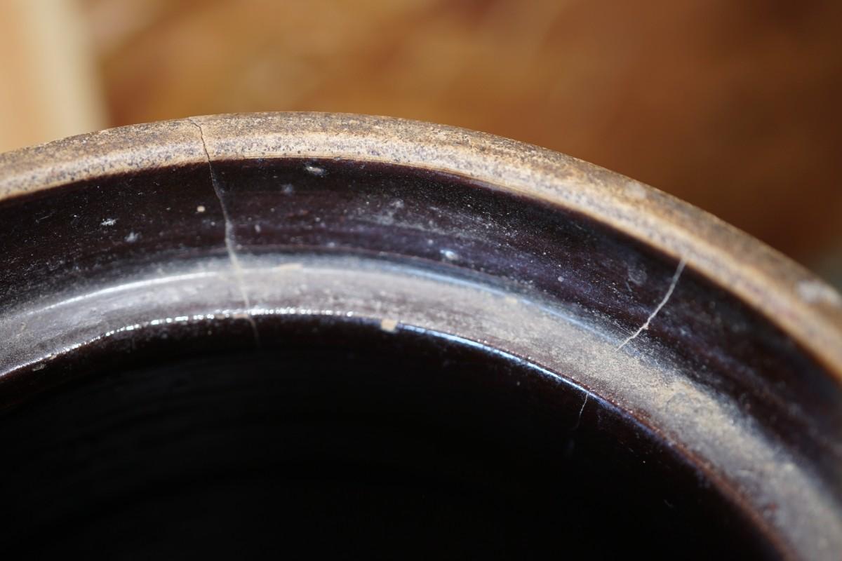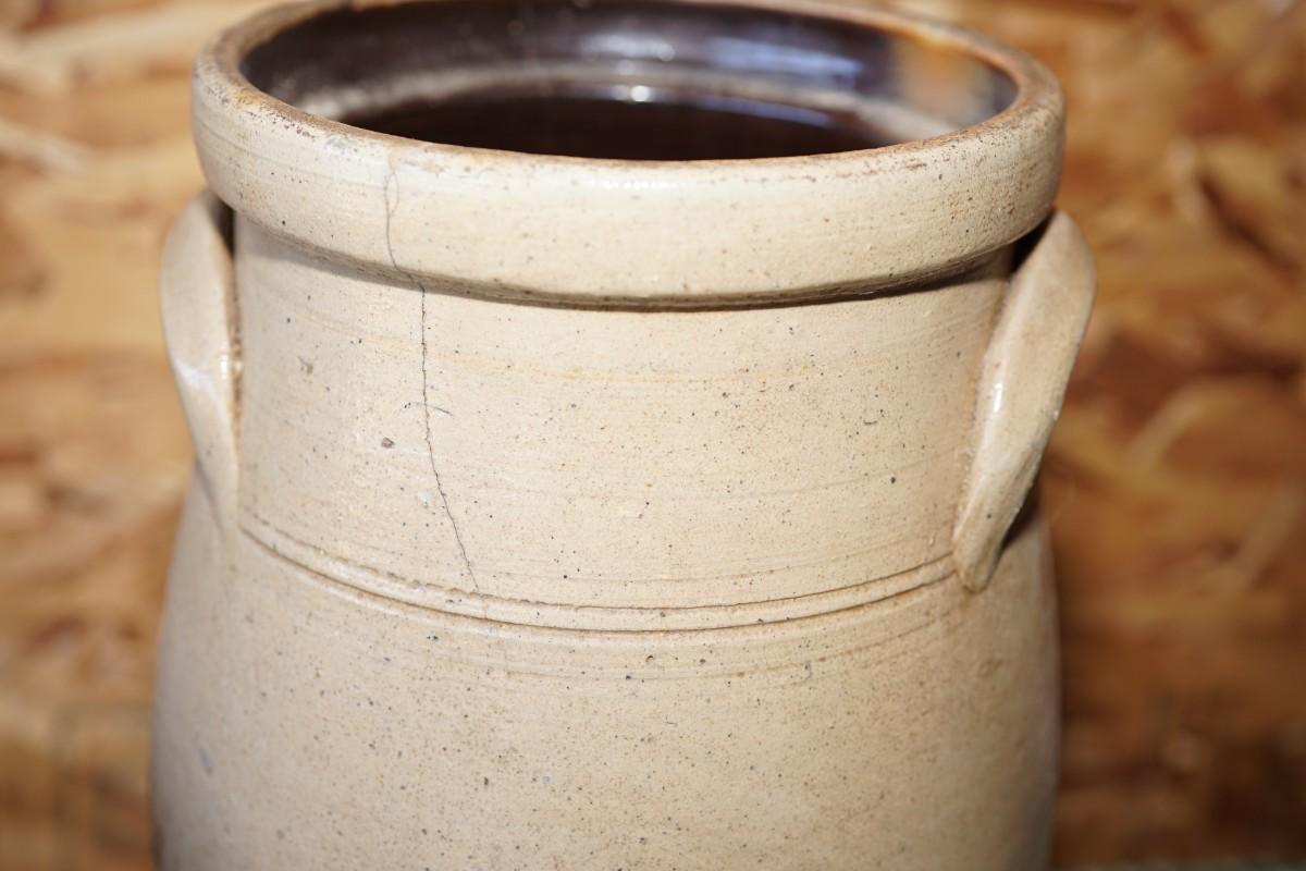churn of 15" this piece has a good rustic look but has hairline cracks in the front and back. see photos. brown interior. no lid . staining to the glaze.